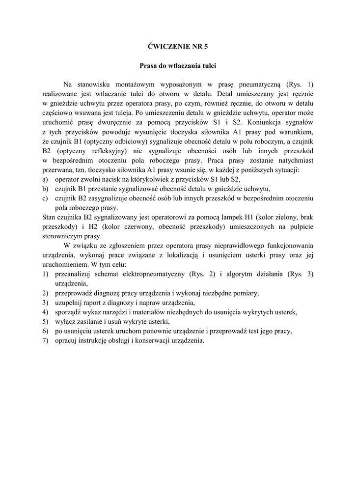 ĆWICZENIE NR 5 Prasa do wtłaczania tulei Na stanowisku montażowym wyposażonym w prasę pneumatyczną (Rys. 1) realizowane jest wtłaczanie tulei do otworu w detalu. Detal umieszczany jest ręcznie w gnieździe uchwytu przez operatora prasy, po czym, również ręcznie, do otworu w detalu częściowo wsuwana jest tuleja. Po umieszczeniu detalu w gnieździe uchwytu, operator może uruchomić prasę dwuręcznie za pomocą przycisków S1 i S2. Koniunkcja sygnałów z tych przycisków powoduje wysunięcie tłoczyska siłownika A1 prasy pod warunkiem, że czujnik B1 (optyczny odbiciowy) sygnalizuje obecność detalu w polu roboczym, a czujnik B2 (optyczny refleksyjny) nie sygnalizuje obecności osób lub innych przeszkód w bezpośrednim otoczeniu pola roboczego prasy. Praca prasy zostanie natychmiast przerwana, tzn. tłoczysko siłownika A1 prasy wsunie się, w każdej z poniższych sytuacji: a) operator zwolni nacisk na którykolwiek z przycisków S1 lub S2, b) czujnik B1 przestanie sygnalizować obecność detalu w gnieździe uchwytu, c) czujnik B2 zasygnalizuje obecność osób lub innych przeszkód w bezpośrednim otoczeniu pola roboczego prasy. Stan czujnika B2 sygnalizowany jest operatorowi za pomocą lampek H1 (kolor zielony, brak przeszkody) i H2 (kolor czerwony, obecność przeszkody) umieszczonych na pulpicie sterowniczym prasy. W związku ze zgłoszeniem przez operatora prasy nieprawidłowego funkcjonowania urządzenia, wykonaj prace związane z lokalizacją i usunięciem usterki prasy oraz jej uruchomieniem. W tym celu: 1) przeanalizuj schemat elektropneumatyczny (Rys. 2) i algorytm działania (Rys. 3) urządzenia, 2) przeprowadź diagnozę pracy urządzenia i wykonaj niezbędne pomiary, 3) uzupełnij raport z diagnozy i napraw urządzenia, 4) sporządź wykaz narzędzi i materiałów niezbędnych do usunięcia wykrytych usterek, 5) wyłącz zasilanie i usuń wykryte usterki, 6) po usunięciu usterek uruchom ponownie urządzenie i przeprowadź test jego pracy, 7) opracuj instrukcję obsługi i konserwacji urządzenia. Rys. 1. Prasa do wtłaczania tulei do otworu w detalu a) układ pneumatyczny b) układ elektryczny Rys. 2. Schemat elektropneumatyczny prasy do wtłaczania tulei Rys. 3. Algorytm działania urządzenia POMIARY WYBRANYCH ELEMENTÓW UKŁADU ELEKTRYCZNEGO Wartość Rezystancja cewki przekaźnika K1 Rezystancja cewki przekaźnika K2 Rezystancja cewki elektrozaworu Y1 Rezystancja lampki H1 Rezystancja lampki H2 Napięcie na wyjściu sygnałowym czujnika B1 przed wykryciem detalu Napięcie na wyjściu sygnałowym czujnika B1 po wykryciu detalu Napięcie na wyjściu sygnałowym czujnika B2 przed wykryciem przeszkody Napięcie na wyjściu sygnałowym czujnika B2 po wykryciu przeszkody Ocena Dobra Zła RAPORT Z DIAGNOZY I NAPRAW URZĄDZENIA Lp. Opis usterki Sposób wykrycia Sposób usunięcia usterki Układ pneumatyczny 1. Przykład: Nieprawidłowa wartość ciśnienia powietrza zasilającego układ – jest 300kPa zamiast 400kPa. Przykład: Odczyt wskazania manometru zamontowanego w zespole przygotowania powietrza 0Z1 i porównanie wskazania z informacją na schemacie układu pneumatycznego. Przykład: Ustawienie prawidłowej (400kPa) wartości ciśnienia w układzie za pomocą zaworu redukcyjnego zamontowanego w zespole 0Z1. Układ elektryczny 1. Przykład: Brak połączenia na odcinku K1:14 / B1 – przewód od czujnika B1 dołączony jest do zestyku NC zamiast NO przekaźnika K1. Przykład: Porównanie połączeń w układzie elektrycznym ze schematem układu elektrycznego. Przykład: Wykonanie połączenia na odcinku K1:14 / B1 zgodnie ze schematem układu elektrycznego. WYKAZ NARZĘDZI I MATERIAŁÓW NIEZBĘDNYCH DO USUNIĘCIA USTEREK Narzędzia Materiały Lp. (nazwa i liczba sztuk) (nazwa, parametry, liczba sztuk/metrów) TEST PRACY URZĄDZENIA PO USUNIĘCIU USTEREK Tak Po włączeniu zasilania elektrycznego i pneumatycznego tłoczysko siłownika A1 jest wsunięte. Obecność detalu w gnieździe uchwytu prasy aktywuje czujnik B1. Obecność przeszkody w polu działania czujnika B2 aktywuje go. Przy nieaktywnym czujniku B2 świeci lampka sygnalizacyjna H1 (zielona). Przy aktywnym czujniku B2 świeci lampka sygnalizacyjna H2 (czerwona). Tylko koniunkcja sygnałów 𝑆1 ∙ 𝑆2 ∙ 𝐵1 ∙ ̅̅̅̅ 𝐵2 powoduje wysunięcie tłoczyska siłownika A1. Ruch tłoczyska siłownika A1 jest spowalniany przy wysuwaniu. Zwolnienie obu lub jednego z przycisków S1 i S2 podczas pracy prasy powoduje wsunięcie tłoczyska siłownika A1. Pojawienie się przeszkody w polu działania czujnika B2 podczas pracy prasy powoduje wsunięcie tłoczyska siłownika A1. Nie INSTRUKCJA OBSŁUGI I KONSERWACJI URZĄDZENIA ………………………………………………………………………………………………… ………………………………………………………………………………………………… ………………………………………………………………………………………………… ………………………………………………………………………………………………… ………………………………………………………………………………………………… ………………………………………………………………………………………………… ………………………………………………………………………………………………… ………………………………………………………………………………………………… ………………………………………………………………………………………………… ………………………………………………………………………………………………… ………………………………………………………………………………………………… ……………………………………………………