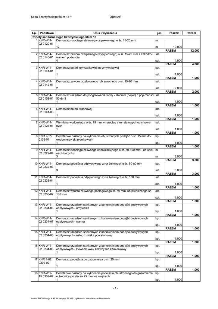 Sępa Szarzyńskiego 68 m 18 + OBMIAR Lp. Podstawa Opis i wyliczenia Roboty sanitarne Sępa Szarzyńskiego 68 m 18 1 KNR-W 4- Demontaż rurociągu stalowego ocynkownego o śr. 15-20 mm 02 0120-01 12 j.m. m szt. 3 KNR-W 4- Demontaż baterii umywalkowej lub zmywakowej 02 0141-01 1 szt. 4 KNR-W 4- Demontaż zaworu przelotowego lub zwrotnego o śr. 15-20 mm 02 0142-01 2 szt. szt. szt. szt. 5 KNR-W 4- Demontaż urządzeń do podgrzewania wody - zbiornik (bojler) o pojemności szt. 02 0152-01 50 dm3 1 szt. 6 KNR-W 4- Demontaż baterii wannowej 02 0141-03 1 szt. 7 KNR-W 4- Wymiana wodomierza o śr. 15 mm w rurociąg z rur stalowych ocynkowa02 0126-01 nych 1 szt. Dodatkowe nakłady na wykonanie obustronnych podejść o śr. 15 mm do wodomierzy skrzydelkowych 1 kpl. szt. szt. kpl. 9 KNR-W 4- Demontaż rurociągu żeliwnego kanalizacyjnego o śr. 50-100 mm - na ścia- m 02 0229-04 nach budynku 3 m 10 KNR-W 4- Demontaż podejścia odpływowego z rur żeliwnych o śr. 50-80 mm 02 0232-03 3 szt. 11 KNR-W 4- Demontaż podejścia odpływowego z rur żeliwnych o śr. 100 mm 02 0232-04 1 szt. 12 KNR-W 4- Demontaż wpustu żeliwnego podłogowego śr. 50 mm lub piwnicznego śr. 02 0233-02 100 mm 1 szt. 13 KNR-W 4- Demontaż urządzeń sanitarnych z korkowaniem podejść dopływowych i 02 0234-06 odpływowych - umywalka 1 kpl. 14 KNR-W 4- Demontaż urządzeń sanitarnych z korkowaniem podejść dopływowych i 02 0234-07 odpływowych - wanna 1 kpl. 15 KNR-W 4- Demontaż urządzeń sanitarnych z korkowaniem podejść dopływowych i 02 0234-08 odpływowych - ustęp z miską porcelanową 1 kpl. 16 KNR-W 4- Demontaż urządzeń sanitarnych z korkowaniem podejść dopływowych i 02 0234-05 odpływowych - zlewozmywak żeliwny lub kamionkowy 1 kpl. 17 KNR 4-02 0309-02 szt. szt. szt. kpl. kpl. kpl. kpl. Demontaż podejścia do gazomierza o śr. 25 mm kpl. 1 kpl. 18 KNR-W 2- Dodatkowe nakłady na wykonanie podejścia obustronnego do gazomierza kpl. 15 0309-02 o średnicy przyłącza 25 mm we wnękach 1 kpl. -1- Norma PRO Wersja 4.33 Nr seryjny: 25362 Użytkownik: Wroclawskie Mieszkania Razem m 2 KNR-W 4- Demontaż zaworu czerpalnego (wypływowego) o śr. 15-20 mm z zakorko02 0140-01 waniem podejścia 4 8 KNR 2-15 0108-01 Poszcz 12.000 RAZEM 12.000 4.000 RAZEM 4.000 1.000 RAZEM 1.000 2.000 RAZEM 2.000 1.000 RAZEM 1.000 1.000 RAZEM 1.000 1.000 RAZEM 1.000 1.000 RAZEM 1.000 3.000 RAZEM 3.000 3.000 RAZEM 3.000 1.000 RAZEM 1.000 1.000 RAZEM 1.000 1.000 RAZEM 1.000 1.000 RAZEM 1.000 1.000 RAZEM 1.000 1.000 RAZEM 1.000 1.000 RAZEM 1.000 1.000 Sępa Szarzyńskiego 68 m 18 + Lp. Podstawa 19 KNR 4-02 0314-03 OBMIAR Opis i wyliczenia j.m. Demontaż kuchni gazowej 3-4 - palnikowej z piekarnikiem szt. 1 szt. 20 KNR-W 4- Przeczyszczenie rurociągu kanalizacyjnego pionowego o śr. 50-80 mm 02 0236-01 3 Poszcz RAZEM 1.000 RAZEM 1.000 3.000 RAZEM 3.000 msc. msc. 21 KNR-W 4- Wymiana odcinka rury stalowej,czarnej o połączeniach gwintowanych o śr. msc. 02 0301-01 15 mm Obmiar dodatkowy - łączna długość 2.5 m 1 msc. 22 KNR-W 4- Demontaż rurociagów stalowych o połączeniach gwintowanych o śr. 15-20 m 02 0311-01 mm 3 m 23 KNR-W 4- Wymiana trójnika z żeliwa ciągliwego, czarnego o śr. 15 mm 02 0303-01 1 szt. 24 KNR-W 2- Kuchnia gazowa o połączeniu złączem elastycznym z piekarnikiem 15 0314-09 1 szt. 25 KNR-W 2- Próba instalacji gazowej na ciśnienie dla wykonawcy i dostawcy gazu za 15 0307-01 gazomierzem w budynkach mieszkalnych 1 lokal. 26 KNR-W 2- Dodatki za wykonanie obustronnych podejść do podgrzewaca wody o śr. 15 0122-01 nominalnej 15 mm w rurociągach stalowych ANALOGIA 1 kpl. 27 KNR 2-15 Urządzenia do podgrzewania wody ze zbiornikami o poj. 10 dm3 0121-01 dm3 ANALOGIA 1 kpl. 28 KNR 2-15 0220-05 29 KNR 2-15 0208-03 szt. szt. lokal. kpl. kpl. Montaż zlewozmywaków żeliwnych lub stalowych na szafce szt. 1 szt. Dodatek za wykonanie podejść odpływowych z rur i kształtek z nieplastyfi- szt. kowanego PCW o śr. 50 mm 2 szt. 30 KNR-W 4- Wymiana syfonu z tworzywa sztucznego o śr. 50 mm 02 0213-01 1 szt. 31 KNR-W 4- Wymiana odcinka rury stalowej ocynkowanej o śr. 15 mm 02 0110-01 Obmiar dodatkowy - łączna długość 12 msc. 6 szt. 32 KNR-W 4- Wymiana umywalki porcelanowej ze wspornikami z syfonem z tworzywa 02 0220-02 1 kpl. 33 KNR-W 4- Wymiana ustępu z miską porcelanową 'Kompakt' 02 0224-03 1 kpl. kpl. kpl. 34 KNR-W 4- Wymiana podejścia z rur z PVC o śr. 110 mm łączonych metodą wciskową msc. 02 0212-08 Norma PRO Wersja 4.33 Nr seryjny: 25362 Użytkownik: Wroclawskie Mieszkania 2.500 1.000 RAZEM 1.000 3.000 RAZEM 3.000 1.000 RAZEM 1.000 1.000 RAZEM 1.000 1.000 RAZEM 1.000 1.000 RAZEM 1.000 1.000 RAZEM 1.000 1.000 RAZEM 1.000 2.000 RAZEM 2.000 1.000 RAZEM 1.000 m msc. -2- Razem 1.000 12.000 6.000 RAZEM 6.000 1.000 RAZEM 1.000 1.000 RAZEM 1.000 Sępa Szarzyńskiego 68 m 18 + Lp. Podstawa OBMIAR Opis i wyliczenia Obmiar dodatkowy - łączna długość 1.5 m 1 msc. 35 KNR-W 4- Wymiana podejścia z rur z PVC o śr. 50 mm łączonych metodą wciskową 02 0212-06 Obmiar dodatkowy - łączna długość 2 36 KNR 4-01 0336-01 37 KNR 4-01 0324-02 38 KNR 4-01 0705-01 39 KNR 4-02 0109-01 40 KNR 4-02 0121-01 41 KNR 4-02 0121-01 j.m. Poszcz 1.500 1.000 RAZEM m msc. Wykucie bruzd poziomych 1/4x1/2 ceg. w ścianach z cegieł na zaprawie cementowo-wapiennej 12 m Zamurowanie bruzd poziomych o przekroju 1/4x1/2 ceg. w ścianach z cegieł 'na pełno' 12 m Wykonanie pasów tynku zwykłego kat. III o szerokości do 15 cm na murach z cegieł lub ścianach z betonu pokrywającego bruzdy uprzednio zamurowanych cegłami lub dachówkami 12 m m m m 2.000 1.000 RAZEM 1.000 12.000 RAZEM 12.000 12.000 RAZEM 12.000 12.000 RAZEM 12.000 Wymiana podejścia dopływowego pod zawór czerpalny, hydrant i baterie o szt. śr. 15 mm Obmiar dodatkowy 3 m 4 szt. Wymiana baterii umywalkowej l z ruchomą wylewką szt. 1 szt. Wymiana baterii zmywakowej z ruchomą wylewką szt. 1 szt. Norma PRO Wersja 4.33 Nr seryjny: 25362 Użytkownik: Wroclawskie