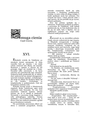 niewiele rozmawiali. Sycili się sobą nawzajem z drapieżną zachłannością, wiedząc, że znów czeka ich długa rozłąka, a każde spotkanie może być ostatnim. Ten związek był chory i oboje zdawali sobie z tego sprawę, ale nie potrafili się go wyrzec, niczym narkotyku. Dwa dni później spotkała się z Adrianem. Pospiesznie podążyli na północ, z powrotem do Talabheim. Jeśli jednak spodziewała się, że Cień dyskretnie uda, że nic się nie stało, była w błędzie. Już na najbliższym popasie nie mógł sobie odmówić małej przyjemności. muga cienia Część trzecia. XVI. E lizabeth wróciła do Talabheim po niecałych dwóch miesiącach. W Nuln wszystko było po staremu i nie miała ochoty zostawać tam dłużej, niż musiała. Rozmowa z opatem w niczym jej nie pomogła. Suger nie wiedział nic o Ionie. Doradzał tylko ostrożność, a do bycia ostrożną nie potrzebowała jego ostrzeżeń. Zwłaszcza kiedy przekonała się, że Adrian, choć zachowywał się niemal nienagannie i sprawiał wrażenie zupełnie „wybielonego”, nie mógł się zbliżyć do Świątyni bliżej niż na sto kroków. Utwierdzało to templariuszkę w podejrzeniach. Cień nie był godzien zaufania i tyle. Wybrała nowego konia w klasztornych stajniach. Rosły, izabelowaty ogier nosił wdzięczne imię Konwalia. No cóż, brat masztalerz nadawał koniom dziwne imiona, ale za to szkolił je doskonale. Wyruszyła w powrotną drogę bogatsza o mile pobrzękującą sakiewkę. Termin spotkania z Err'avandrelem zbliżał się. O dziwo, Cień bez żadnych protestów zgodził się na dwudniowe rozstanie. Nie powiedziała mrocznemu elfowi ani słowa o ostatnich przygodach. Zresztą Zatrzymali się na niewielkiej polanie. Ciepły wieczór rozleniwiał do tego stopnia, że Elizabeth zrezygnowała z treningu. Nawet Cień, zamiast wędrować sobie tylko znanymi ścieżkami, wylegiwał się na miękkiej trawie pod drzewem, żując jakąś trawkę i obserwując towarzyszkę spode łba. Templariuszka, rozdrażniona jego spojrzeniami, kręciła się po obozie. - Elfi materac! – syknął cichutko Adrian, kiedy go mijała. Templariuszka zesztywniała, a jej twarz oblała się szkarłatem. Wyszarpnęła z pochwy miecz i podetknęła go Cieniowi pod nos. - Stawaj! Cień spojrzał na nią spode łba. - No litośśści, nie rozśśśmieszaj mnie. Nauczyłem cię tego i owego, ale przeciwnikiem dla mnie jesteś żadnym. Daj se siana! - Stawaj! – wycharczała, dławiąc się wściekłością. - No nie, życie ci zbrzydło? Wyluzuj! – ziewnął Cień. - Obraziłeś mnie, skurwysynu! Za to, co powiedziałeś, zabiłam już pięciu ludzi. Stawaj albo przeproś! – wrzasnęła. - Przepraszszszam. – powiedział spokojnie Cień i sięgnął po świeżą trawkę. Elizabeth opadła szczęka. - Co?! Miała wyjątkowo głupi wyraz twarzy. - Przeprosiłem. Nie ssssssłyszałaś? Cień kpił w żywe oczy – Teraz już nie możesz mnie wyzwać na pojedynek. Templariuszka zawyła z bezsilnej złości i cisnęła miecz na ziemię. Kipiąc wściekłością ruszyła w kierunku lasu, 1 wyładować złość na jakimś niewinnym pniu. Cień rechotał jak stado żab w maju... N astępnego dnia nie raczyła się do niego odezwać. Reszta drogi upłynęłaby w ponurym milczeniu, gdyby nie to, że Schwarzenschwert nie zwykła długo chować urazy. Zresztą w jednej sprawie złośliwy Nachtjaeger miał rację - ciągle nie była godnym go przeciwnikiem. Stwór byl tak niewiarygodnie szybki! A że wciąż podejrzewała go o najgorsze... Nie zamierzała zaniedbywać treningów. Reszta drużyny powitała ich powrót z entuzjazmem. Zaczynali się nudzić, zresztą Kruger zdradzał oznaki znużenia rolą gościnnego gospodarza. Złodzieje odwiedzili już każdy dom wart odwiedzenia, w dodatku ich wyczyny sprawiły, że nocami na ulicach kręciło się więcej strażników niż przekupek za dnia. Kolekcja świeczników, gromadzonych przez Garreta z maniackim uporem, utrudniała znalezienie w magicznym worze czegokolwiek innego. Prawda, że nie ma to jak świecznik, kiedy trzeba kogoś ogłuszyć, ale co za dużo, to i świnia nie zeżre, jak to obrazowo określił Randal. Trochę świeczników opchnęli paserom, ale po jakimś czasie nawet najbardziej zachłanni handlarze nie chcieli przyjąć ani jednego więcej. W końcu zaczęli je przetapiać na sztabki. Oczywiście, sprzedaż takiej ilości srebra zajęła im nieco czasu. Była przy tym śmiertelnie nudnym zajęciem. Czas był najwyższy, by pomyśleć o nowej wyprawie. Tym bardziej, że troje Ionitów zaczął dręczyć niepokój. Nie potrafili powiedzieć nic konkretnego. Nie znali jego przyczyn. Czy były to sny, z których niczego nie pamiętali po przebudzeniu? Czy może nasilające się przezucie, że „coś” się zbliża? Kruger, ewidentnie w chwili umysłowego zaćmienia, zaprosił ich na rodzinne przyjęcie. Licho wie, dlaczego. Może bał się spuścić awanturników z oka na całą noc? W każdym razie poszli. Zrzucili swoje codzienne ubrania i wbili się w „coś porządniejszego”, co zresztą wywołało nieco zamieszania, bo na widok Tanji i Elizabeth ubranych w powłóczyste, wydekoltowane suknie męska część drużyny pospadała z krzeseł. Wojowniczki były wściekłe. Tanja narzekała, że długa spódnica plączę się jej między nogami, Elizabeth sarkała, że wiatr hula jej po cyckach. Na dodatek Kruger kazał im zostawić całą broń w domu! Uznały to za idiotyzm i poukrywały pod szerokimi spódnicami tyle sztyletów, ile tylko się dało. Ciekawa rzecz, Riannon w sukni była jakoś łatwiejsza do zaakceptowania. Pozostawiła dziecko pod opieką Jamesa, wieloletniego sługi Krugera, który widział już niejedno i nic nie było w stanie wyprowadzić go z równowagi. Nawet wrzeszczące co sił w płucach niemowlę. Rodzinne przyjęcie nie było takie straszne, jak się spodziewali. Randal bardzo szybko znalazł kompana do kieliszka w osobie wuja