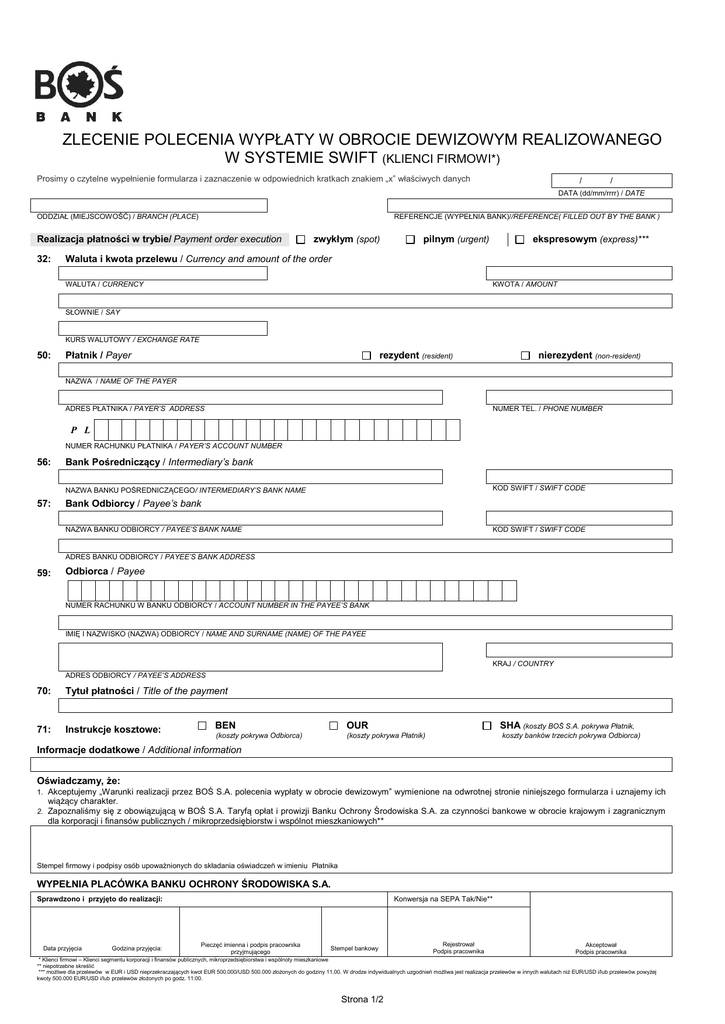 ZLECENIE POLECENIA WYPŁATY W OBROCIE DEWIZOWYM REALIZOWANEGO W SYSTEMIE SWIFT (KLIENCI FIRMOWI*) Prosimy o czytelne wypełnienie formularza i zaznaczenie w odpowiednich kratkach znakiem „x” właściwych danych / / DATA (dd/mm/rrrr) / DATE ODDZIAŁ (MIEJSCOWOŚĆ) / BRANCH (PLACE) REFERENCJE (WYPEŁNIA BANK)//REFERENCE( FILLED OUT BY THE BANK ) Realizacja płatności w trybie/ Payment order execution 32: zwykłym (spot) pilnym (urgent) ekspresowym (express)*** Waluta i kwota przelewu / Currency and amount of the order WALUTA / CURRENCY KWOTA / AMOUNT SŁOWNIE / SAY KURS WALUTOWY / EXCHANGE RATE 50: Płatnik / Payer rezydent (resident) nierezydent (non-resident) NAZWA / NAME OF THE PAYER ADRES PŁATNIKA / PAYER’S ADDRESS NUMER TEL. / PHONE NUMBER P L NUMER RACHUNKU PŁATNIKA / PAYER’S ACCOUNT NUMBER 56: Bank Pośredniczący / Intermediary’s bank KOD SWIFT / SWIFT CODE NAZWA BANKU POŚREDNICZĄCEGO/ INTERMEDIARY’S BANK NAME 57: Bank Odbiorcy / Payee’s bank NAZWA BANKU ODBIORCY / PAYEE’S BANK NAME KOD SWIFT / SWIFT CODE ADRES BANKU ODBIORCY / PAYEE’S BANK ADDRESS 59: Odbiorca / Payee NUMER RACHUNKU W BANKU ODBIORCY / ACCOUNT NUMBER IN THE PAYEE’S BANK IMIĘ I NAZWISKO (NAZWA) ODBIORCY / NAME AND SURNAME (NAME) OF THE PAYEE KRAJ / COUNTRY ADRES ODBIORCY / PAYEE’S ADDRESS 70: Tytuł płatności / Title of the payment 71: Instrukcje kosztowe: BEN OUR (koszty pokrywa Odbiorca) (koszty pokrywa Płatnik) SHA (koszty BOŚ S.A. pokrywa Płatnik, koszty banków trzecich pokrywa Odbiorca) Informacje dodatkowe / Additional information Oświadczamy, że: 1. Akceptujemy „Warunki realizacji przez BOŚ S.A. polecenia wypłaty w obrocie dewizowym” wymienione na odwrotnej stronie niniejszego formularza i uznajemy ich wiążący charakter. 2. Zapoznaliśmy się z obowiązującą w BOŚ S.A. Taryfą opłat i prowizji Banku Ochrony Środowiska S.A. za czynności bankowe w obrocie krajowym i zagranicznym dla korporacji i finansów publicznych / mikroprzedsiębiorstw i wspólnot mieszkaniowych** Stempel firmowy i podpisy osób upoważnionych do składania oświadczeń w imieniu Płatnika WYPEŁNIA PLACÓWKA BANKU OCHRONY ŚRODOWISKA S.A. Sprawdzono i przyjęto do realizacji: Data przyjęcia Godzina przyjęcia: Konwersja na SEPA Tak/Nie** Pieczęć imienna i podpis pracownika przyjmującego Stempel bankowy Rejestrował Podpis pracownika Akceptował Podpis pracownika * Klienci firmowi – Klienci segmentu korporacji i finansów publicznych, mikroprzedsiębiorstwa i wspólnoty mieszkaniowe ** niepotrzebne skreślić *** możliwe dla przelewów w EUR i USD nieprzekraczających kwot EUR 500.000/USD 500.000 złożonych do godziny 11.00. W drodze indywidualnych uzgodnień możliwa jest realizacja przelewów w innych walutach niż EUR/USD i/lub przelewów powyżej kwoty 500.000 EUR/USD i/lub przelewów złożonych po godz. 11:00. Strona 1/2 Warunki realizacji przez Bank Ochrony Środowiska S.A., zwany dalej „BOŚ S.A.” lub „Bank”, zleceń polecenia wypłaty w obrocie dewizowym realizowanego w systemie SWIFT, zwane dalej „Warunkami” 1. BOŚ S.A. realizuje polecenia wypłaty do banków mających siedzibę za granicą lub banków krajowych od Płatników (rezydentów / nierezydentów) posiadających rachunek w Banku na rzecz Odbiorcy wskazanego przez Płatnika. 2. Na podstawie pisemnego „Zlecenia polecenia wypłaty w obrocie dewizowym realizowanego w systemie SWIFT”, zwanego dalej „Zleceniem”, stanowiącego integralną całość z niniejszymi Warunkami, złożonego przez Płatnika w placówce Banku, Bank zobowiązuje się do realizacji – na warunkach określonych w tym Zleceniu, niniejszych Warunkach oraz zgodnie z powszechnie obowiązującymi przepisami prawa, w tym w szczególności prawa dewizowego – polecenia wypłaty do banku mającego siedzibę za granicą lub banku krajowego, w określonej przez Płatnika wysokości, na rzecz Odbiorcy wskazanego przez Płatnika. 3. Płatnik zobowiązany jest prawidłowo, dokładnie i czytelnie wskazać w Zleceniu dane niezbędne do prawidłowej realizacji polecenia wypłaty, zgodnie z opisem pól występujących w formularzu Zlecenia. 4. Bank nie ponosi odpowiedzialności za niewykonanie lub nienależyte wykonanie Zlecenia, jeżeli nastąpiło ono wskutek nieprawidłowego, niedokładnego lub nieczytelnego podania danych przez Płatnika na formularzu Zlecenia. 5. Odpowiedzialność Banku za niewykonanie lub opóźnienie w realizacji polecenia wypłaty jest wyłączona, jeżeli niewykonanie lub opóźnienie nastąpiły wskutek: - wystąpienia siły wyższej, - wykonywania przez Bank czynności w związku z przeciwdziałaniem praniu pieniędzy oraz finansowaniu terroryzmu. 6. Bank przyjmuje do realizacji Zlecenia Płatnika w ustalonych przez Bank godzinach. Godziny te podawane są do wiadomości w placówkach Banku oraz publikowane na stronie internetowej Banku. Zlecenie przyjęte przez Bank po ustalonych godzinach realizowane będzie następnego dnia roboczego, po dniu jego przyjęcia do realizacji. 7. Jeżeli Zlecenie nie kwalifikuje się do wykonania przez Bank, z uwagi na: nieprawidłowe jego sporządzenie przez Płatnika, błędy, sprzeczne dane, brak niezbędnych informacji lub brak na rachunku bankowym Płatnika środków wystarczających na pokrycie kwoty Zlecenia i prowizji, realizacja Zlecenia zostaje wstrzymana przez Bank do momentu sprostowania danych i błędów, uzupełnienia informacji oraz środków na rachunku Płatnika. 8. W zależności od wybranej przez Płatnika na Zleceniu opcji kosztowej, opłaty, prowizje i koszty realizacji polecenia wypłaty pobierane są z rachunku wskazanego w Dyspozycji do pobierania opłat i prowizji od poleceń wypłaty złożonej w placówce Banku prowadzącej rachunek Płatnika lub jeśli Płatnik nie złożył takiej dyspozycji, z ogólnego rachunku do opłat i prowizji, a w przypadku braku wskazania takich rachunków lub braku wystarczającego salda na tych rachunkach - z rachunku tran