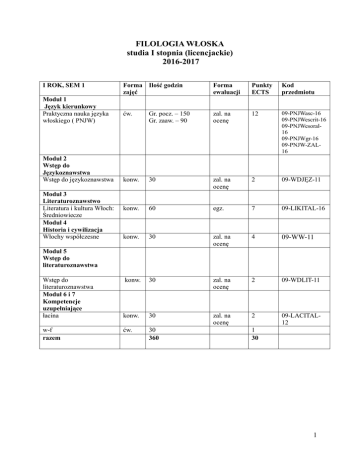 FILOLOGIA WŁOSKA studia I stopnia (licencjackie) 2016-2017 I ROK, SEM 1 Moduł 1 Język kierunkowy Praktyczna nauka języka włoskiego ( PNJW) Moduł 2 Wstęp do Językoznawstwa Wstęp do językoznawstwa Moduł 3 Literaturoznawstwo Literatura i kultura Włoch: Średniowiecze Moduł 4 Historia i cywilizacja Włochy współczesne Forma Ilość godzin zajęć Forma ewaluacji Punkty ECTS Kod przedmiotu ćw. Gr. pocz. – 150 Gr. zaaw. – 90 zal. na ocenę 12 09-PNJWasc-16 09-PNJWescrit-16 09-PNJWesoral16 09-PNJWgr-16 09-PNJW-ZAL16 konw. 30 zal. na ocenę 2 09-WDJĘZ-11 konw. 60 egz. 7 09-LIKITAL-16 konw. 30 zal. na ocenę 4 09-WW-11 konw. 30 zal. na ocenę 2 09-WDLIT-11 konw. 30 zal. na ocenę 2 09-LACITAL12 ćw. 30 360 Moduł 5 Wstęp do literaturoznawstwa Wstęp do literaturoznawstwa Moduł 6 i 7 Kompetencje uzupełniające łacina w-f razem 1 30 1 Forma Ilość godzin zajęć Forma ewaluacji Punkty ECTS Kod przedmiotu ćw. Gr. pocz. – 150 Gr. zaaw. – 90 egz. 10 09PNJWasc-26 09PNJWescrit26 09PNJWesoral26 09-PNJWgr26 09-PNJWEGZ-26 konw. 60 egz. 4 09-FITAL11 konw. 60 egz. 5 09LIKITAL26 Moduł 4 Drugi język nowożytny Język francuski ćw. 90 egz. 8 09FRITAL1-15 09FRITAL2-15 09FRITAL3-15 09-FRITALEGZ-15 Moduł 5 Kompetencje uzupełniające łacina ćw. 30 egz. 2 09LACITAL22 ćw. 30 420 I ROK, SEM 2 Moduł 1 język kierunkowy Praktyczna nauka języka włoskiego ( PNJW) Moduł 2 Językoznawstwo Fonetyka i fonologia języka włoskiego Moduł 3 Literaturoznawstwo Literatura i kultura Włoch: Prehumanizm i Humanizm w-f razem 1 30 2 II ROK, SEM 3 Moduł 1 język kierunkowy Praktyczna nauka języka włoskiego ( PNJW) Forma Ilość godzin zajęć Forma ewaluacji Punkty ECTS Kod przedmiotu ćw. 150 Zal. na ocenę 10 09-PNJWasc-36 09-PNJWescrit36 09-PNJWesoral36 09-PNJWgr-36 09PNJWlett/Comp12 09-PNJW-ZAL36 konw. 60 egz. 4 09-MITAL-11 konw. 60 egz. 6 09-LIKITAL36 konw. 30 zal. na ocenę 2 09-AJĘZITAL11 konw. 90 egz. 8 09-FRITAL1-25 09-FRITAL2-25 09-FRITAL3-25 09-FRITAL4-25 09-FRITAL5-25 09-FRITAL6-25 09-FRITALEGZ-25 Moduł 2 Językoznawstwo Morfologia języka włoskiego Moduł 3 Literaturoznawstwo Literatura i kultura Włoch: Renesans i Manieryzm Moduł 4 Historia i cywilizacja Wprowadzenie do akwizycji języków romańskich Moduł 5 Drugi język nowożytny Język francuski razem 390 30 3 II ROK, SEM 4 Moduł 1 język kierunkowy Praktyczna nauka języka włoskiego ( PNJW) Forma Ilość godzin zajęć Forma ewaluacji Punkty ECTS Kod przedmiotu ćw. 150 egz. 10 09-PNJWasc-46 09-PNJWescrit46 09-PNJWesoral46 09-PNJWgr-46 09PNJWlett/comp22 09-PNJW-EGZ46 konw. 60 egz. 4 09-SITAL-12 konw. 60 egz. 6 09-LIKITAL-46 konw. 30 zal. na ocenę 2 09-HWITAL11 ćw. 90 egz. 8 09-FRITAL1-35 09-FRITAL2-35 09-FRITAL3-35 09-FRITAL4-35 09-FRITAL5-35 09-FRITAL6-35 09-FRITALEGZ-35 Moduł 2 Językoznawstwo Składnia języka włoskiego Moduł 3 Literaturoznawstwo Literatura kultura Włoch: Barok, Klasycyzm, Oświecenie Moduł 4 Akwizycja i komunikacja Historia języka Moduł 5 Drugi język nowożytny Język francuski razem 390 30 4 Forma Ilość godzin zajęć Forma ewaluacji Punkty ECTS Kod przedmiotu ćw. 120 zal. na ocenę 8 09PNJWasc-56 09PNJWescrit56 09PNJWesoral56 09-PNJWgr56 09-PNJWZAL-56 Składnia języka włoskiego konw. 45 egz. 3 Historia języka włoskiego konw. 30 egz. 2 09-SITAL22 09-HITAL11 w/ćw 60 egz. 4 09LIKITAL56 konw. 60 zal. na ocenę 2 09-PLJĘZ11 09-PLLIT11 Moduł 5 Drugi język nowożytny Język francuski ćw. 90 egz. 6 09FRITAL1-45 09FRITAL2-45 09FRITAL3-45 09-FRITALEGZ-45 Moduł 6 Kompetencje uzupełniające Technologie informacyjne konw. 30 zal. na ocenę 2 09TINFITAL11 III ROK, SEM 5 Moduł 1 język kierunkowy Praktyczna nauka języka włoskiego ( PNJW) Moduł 2 Językoznawstwo Moduł 3 Literaturoznawstwo Literatura Włoch: XIX wiek Moduł 4 Specjalizacja – proseminarium Językoznawcze i Literaturoznawcze Praktyki zawodowe 90 3 razem 435 + 90 godz. praktyki 30 5 III ROK, SEM 6 Moduł 1 język kierunkowy Praktyczna nauka języka włoskiego ( PNJW) Forma Ilość godzin zajęć Forma ewaluacji Punkty ECTS Kod przedmiotu ćw. 120 egz. 10 09-PNJWasc66 09PNJWescrit-66 09PNJWesoral-66 09-PNJWgr-66 09-PNJWEGZ-66 konw. 30 zal. na ocenę 2 09-GKITAL11 w/ćw 60 egz. 4 09-LIKITAL66 konw. 30 zal. na ocenę 2 09-HITAL-11 sem. 30 egz. lic 10 09-SLJĘZ-11 09-SLLIT-11 Moduł 2 Językoznawstwo Gramatyka kontrastywna Moduł 3 Literaturoznawstwo Literatura Włoch: Schyłek XIX w., pierwsza połowa XX w. Moduł 4 Historia i cywilizacja Historia sztuki włoskiej Moduł 5 Specjalizacja Seminarium licencjackie ( wg. wyboru) Językoznawcze Literaturoznawcze Moduł 6 Kompetencje uzupełniające Praktyki zawodowe razem 60 2 330 30 Lata 1-3 na studiach licencjackich: 2325 godzin 6 FILOLOGIA ROMAŃSKA/HISZPAŃSKA/WŁOSKA – SPECJALNOŚĆ NAUCZYCIELSKA STUDIA I STOPNIA rok studiów semestr wykład / ćwiczenia ilość godzin egzamin / zaliczenie pkt ECTS Psychologia – moduł 2.1 09-PSYCHOL-11 I 1 w. 30 zal. na ocenę 2 Pedagogika – moduł 2.1 09-PED_IIw-11 I 1 w. 30 zal. na ocenę 2 Podstawy dydaktyki – moduł 3.1 09-podstdyd-11 I 1 k. 30 zal. na ocenę 2 Prawne aspekty zawodu nauczyciela *– moduł 2.1 09-PrawnaOd-11 I 2 w. 5 zal Udzielanie pierwszej pomocy* – moduł 2.1 09-PPomoc-11 I 2 ćw. 3 zal BHP dla nauczycieli* – moduł 2.1 09-BHPNAUCZ-11 I 2 w. 2 zal Pedagogika* – moduł 2.1 09-PED-modul21-11 I 2 ćw. 10 zal Emisja głosu* - moduł 2.1 09-EMGŁOS-11 I 1 ćw. 10 zal. na ocenę Psychologia na II etapie edukacyjnym – moduł 2.2.II 09-PSYCH_II-11 I 2 ćw. 30 zal. na ocenę Pedagogika na II etapie edukacyjnym – moduł 2.2.II 09-PED_II-11 I 2 ćw. 30 zal. na ocenę Przedmiot 1 przedmioty oznaczone gwiazdką tworzą jeden blok 2 7 Praktyka psychologiczno-pedagogiczna – moduł 2.3.II 09-PED_PRAKT-11 Dydaktyka języka francuskiego/włoskiego/hiszpańskiego na II etapie edukacyjnym – moduł 3.2.II 09-DJFHW_II-12 Dydaktyka języka francuskiego/włoskiego/hiszpańskiego na II etapie edukacyjnym – modu