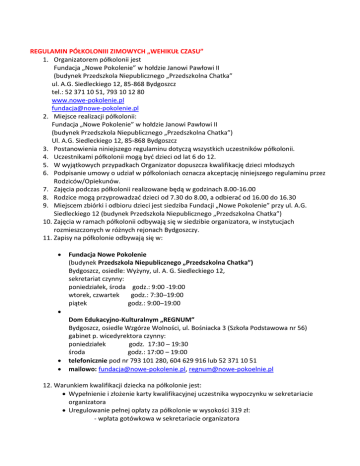 REGULAMIN PÓŁKOLONIII ZIMOWYCH „WEHIKUŁ CZASU” 1. Organizatorem półkolonii jest Fundacja „Nowe Pokolenie” w hołdzie Janowi Pawłowi II (budynek Przedszkola Niepublicznego „Przedszkolna Chatka” ul. A.G. Siedleckiego 12, 85-868 Bydgoszcz tel.: 52 371 10 51, 793 10 12 80 www.nowe-pokolenie.pl [email protected] 2. Miejsce realizacji półkolonii: Fundacja „Nowe Pokolenie” w hołdzie Janowi Pawłowi II (budynek Przedszkola Niepublicznego „Przedszkolna Chatka”) Ul. A.G. Siedleckiego 12, 85-868 Bydgoszcz 3. Postanowienia niniejszego regulaminu dotyczą wszystkich uczestników półkolonii. 4. Uczestnikami półkolonii mogą być dzieci od lat 6 do 12. 5. W wyjątkowych przypadkach Organizator dopuszcza kwalifikację dzieci młodszych 6. Podpisanie umowy o udział w półkoloniach oznacza akceptację niniejszego regulaminu przez Rodziców/Opiekunów. 7. Zajęcia podczas półkolonii realizowane będą w godzinach 8.00-16.00 8. Rodzice mogą przyprowadzać dzieci od 7.30 do 8.00, a odbierać od 16.00 do 16.30 9. Miejscem zbiórki i odbioru dzieci jest siedziba Fundacji „Nowe Pokolenie” przy ul. A.G. Siedleckiego 12 (budynek Przedszkola Niepublicznego „Przedszkolna Chatka”) 10. Zajęcia w ramach półkolonii odbywają się w siedzibie organizatora, w instytucjach rozmieszczonych w różnych rejonach Bydgoszczy. 11. Zapisy na półkolonie odbywają się w: Fundacja Nowe Pokolenie (budynek Przedszkola Niepublicznego „Przedszkolna Chatka”) Bydgoszcz, osiedle: Wyżyny, ul. A. G. Siedleckiego 12, sekretariat czynny: poniedziałek, środa godz.: 9:00 -19:00 wtorek, czwartek godz.: 7:30–19:00 piątek godz.: 9:00–19:00 Dom Edukacyjno-Kulturalnym „REGNUM” Bydgoszcz, osiedle Wzgórze Wolności, ul. Bośniacka 3 (Szkoła Podstawowa nr 56) gabinet p. wicedyrektora czynny: poniedziałek godz. 17:30 – 19:30 środa godz.: 17:00 – 19:00 telefonicznie pod nr 793 101 280, 604 629 916 lub 52 371 10 51 mailowo: [email protected], [email protected] 12. Warunkiem kwalifikacji dziecka na półkolonie jest: Wypełnienie i złożenie karty kwalifikacyjnej uczestnika wypoczynku w sekretariacie organizatora Uregulowanie pełnej opłaty za półkolonie w wysokości 319 zł: - wpłata gotówkowa w sekretariacie organizatora - wpłata na konto 45 1940 1076 3092 2420 0000 0000 z dopiskiem Półkolonie zimowe_data półkolonii (18-22.01.2016 lub 25-29.01.2016)_ imię i nazwisko dziecka Wypełnienie załącznika dotyczącego udziału dziecka w wycieczkach i spacerach organizowanych w trakcie półkolonii na terenie Bydgoszczy (załącznik nr 4) Podpisanie umowy o udział dziecka w półkoloniach 13. Warunki odbioru dziecka z półkolonii. Dziecko może odebrać osoba upoważniona, legitymująca się dokumentem tożsamości oraz pisemnym upoważnieniem od Rodzica / Opiekuna (załącznik nr 2) 14. W przypadku samodzielnego powrotu dziecka do domu, Rodzice / Opiekunowie są zobowiązani przedłożyć stosowne oświadczenie (załącznik nr 3) 15. Rezygnacja z półkolonii lub części zajęć nie zwalnia z obowiązku wniesienia pełnej opłaty za turnus ani nie uprawnia do ubiegania się o zwrot kosztów. 16. Uczestnicy półkolonii mają prawo do: - spokojnego wypoczynku, - uczestniczenia we wszystkich programowych zajęciach, organizowanych podczas półkolonii, - korzystania ze wszystkich urządzeń i sprzętów niezbędnych do realizacji programu półkolonii - uzyskania niezbędnej pomocy od wychowawcy lub kierownika półkolonii 16. Uczestnicy półkolonii mają obowiązek: - podporządkowania się poleceniom wychowawcy i kierownika półkolonii, - przestrzegania ramowego harmonogramu dnia i programu półkolonii, - brania czynnego udziału w zajęciach, - przestrzegania przepisów BHP, PPOŻ oraz wewnętrznych zasad spisanych na początku warsztatów - respektowania zapisów niniejszego regulaminu. - postępowania zgodnie z ogólnie przyjętymi zasadami kultury i etyki, - przestrzegania zasad higieny osobistej, dbania o dobrą atmosferę w grupie, - szanowania rzeczy własnych i kolegów, - natychmiastowego powiadomienia wychowawcy lub kierownika o zaistniałych problemach i wypadkach, 17. Za umyślne szkody wyrządzone przez dziecko, materialnie odpowiedzialni są Rodzice / Opiekunowie. 18. Samowolne oddalenie się Dziecka od opiekunów, niewykonywanie poleceń wychowawców, jak również nieprzestrzeganie regulaminu będzie karane upomnieniem, naganą, a w ostateczności wykluczeniem uczestnika z udziału w półkoloniach. 19. Opłata za półkolonie w przypadku karnego wykluczenia uczestnika za rażące naruszenie niniejszego regulaminu nie będzie zwracana. 20. Organizator półkolonii zobowiązuje się do zapewnienia: - 3 posiłków dziennie (II śniadanie, obiad i podwieczorek), - napojów bez ograniczeń (woda, sok, herbata) - wykwalifikowanej opieki pedagogicznej do zajęć edukacyjnych, - realizacji zajęć zgodnych z programem półkolonii - materiałów edukacyjnych do zajęć, - natychmiastowego powiadomienia rodziców lub opiekunów uczestnika półkolonii o zaistniałych wypadkach, urazach, problemach wychowawczych, 21. Organizatorzy nie odpowiadają materialnie za rzeczy wartościowe przyniesione na zajęcia przez uczestników półkolonii. 22. Organizatorzy półkolonii zastrzegają sobie prawo do niewielkich zmian w programie półkolonii podyktowanymi szczególnymi względami, na które organizatorzy nie mają bezpośredniego wpływu. 23. W przypadkach nieuregulowanych niniejszym Regulaminem zastosowanie mają przepisy kodeksu cywilnego. 24. Regulamin wchodzi w życie z dniem podpisania