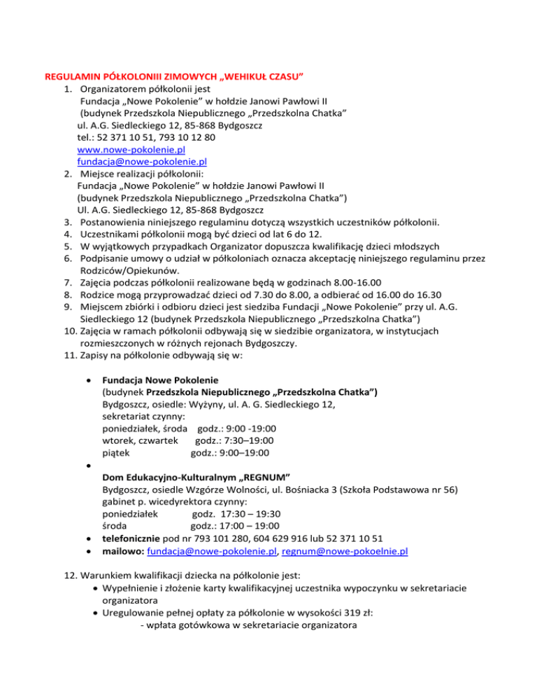 REGULAMIN PÓŁKOLONIII ZIMOWYCH „WEHIKUŁ CZASU” 1