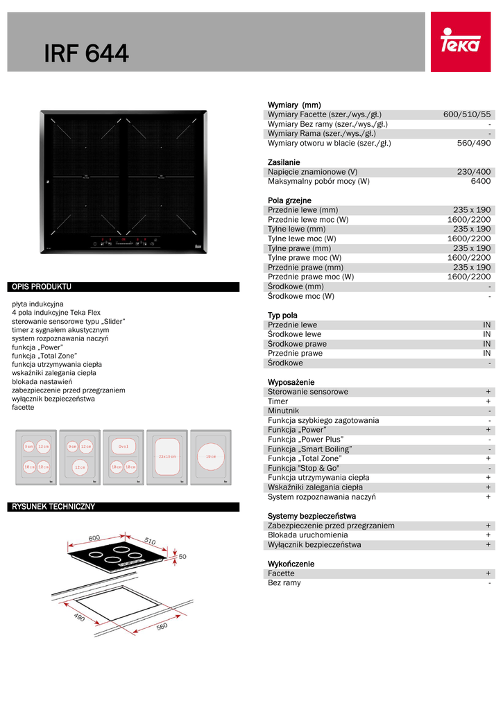 IRF 644 Wymiary (mm) Wymiary Facette (szer./wys./gł.) Wymiary Bez ramy (szer./wys./gł.) Wymiary Rama (szer./wys./gł.) Wymiary otworu w blacie (szer./gł.) Zasilanie Napięcie znamionowe (V) Maksymalny pobór mocy (W) OPIS PRODUKTU płyta indukcyjna 4 pola indukcyjne Teka Flex sterowanie sensorowe typu „Slider” timer z sygnałem akustycznym system rozpoznawania naczyń funkcja „Power” funkcja „Total Zone” funkcja utrzymywania ciepła wskaźniki zalegania ciepła blokada nastawień zabezpieczenie przed przegrzaniem wyłącznik bezpieczeństwa facette Pola grzejne Przednie lewe (mm) Przednie lewe moc (W) Tylne lewe (mm) Tylne lewe moc (W) Tylne prawe (mm) Tylne prawe moc (W) Przednie prawe (mm) Przednie prawe moc (W) Środkowe (mm) Środkowe moc (W) Typ pola Przednie lewe Środkowe lewe Środkowe prawe Przednie prawe Środkowe 600/510/55 560/490 230/400 6400 235 x 190 1600/2200 235 x 190 1600/2200 235 x 190 1600/2200 235 x 190 1600/2200 IN IN IN IN - Wyposażenie Sterowanie sensorowe Timer Minutnik Funkcja szybkiego zagotowania Funkcja „Power” Funkcja „Power Plus” Funkcja „Smart Boiling” Funkcja „Total Zone” Funkcja "Stop & Go" Funkcja utrzymywania ciepła Wskaźniki zalegania ciepła System rozpoznawania naczyń + + + + + + + Systemy bezpieczeństwa Zabezpieczenie przed przegrzaniem Blokada uruchomienia Wyłącznik bezpieczeństwa + + + Wykończenie Facette Bez ramy + - RYSUNEK TECHNICZNY