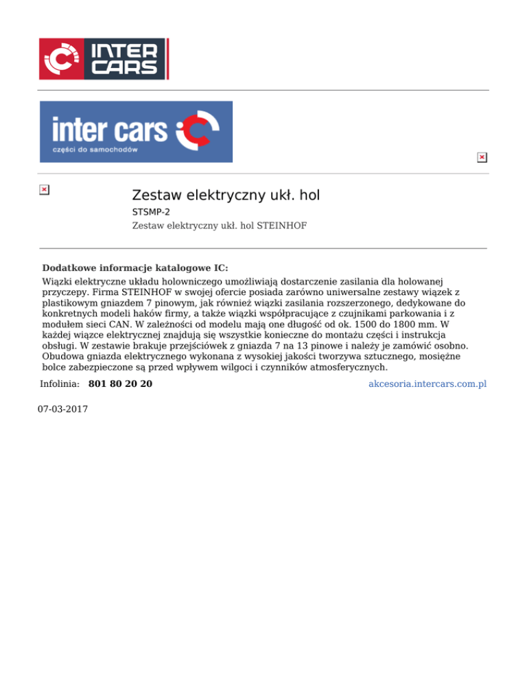 Zestaw elektryczny ukł. hol STSMP-2 Zestaw elektryczny ukł. hol STEINHOF Dodatkowe informacje katalogowe IC: Wiązki elektryczne układu holowniczego umożliwiają dostarczenie zasilania dla holowanej przyczepy. Firma STEINHOF w swojej ofercie posiada zarówno uniwersalne zestawy wiązek z plastikowym gniazdem 7 pinowym, jak również wiązki zasilania rozszerzonego, dedykowane do konkretnych modeli haków firmy, a także wiązki współpracujące z czujnikami parkowania i z modułem sieci CAN. W zależności od modelu mają one długość od ok. 1500 do 1800 mm. W każdej wiązce elektrycznej znajdują się wszystkie konieczne do montażu części i instrukcja obsługi. W zestawie brakuje przejściówek z gniazda 7 na 13 pinowe i należy je zamówić osobno. Obudowa gniazda elektrycznego wykonana z wysokiej jakości tworzywa sztucznego, mosiężne bolce zabezpieczone są przed wpływem wilgoci i czynników atmosferycznych. Infolinia: 801 80 20 20 07-03-2017 akcesoria.intercars.com.pl