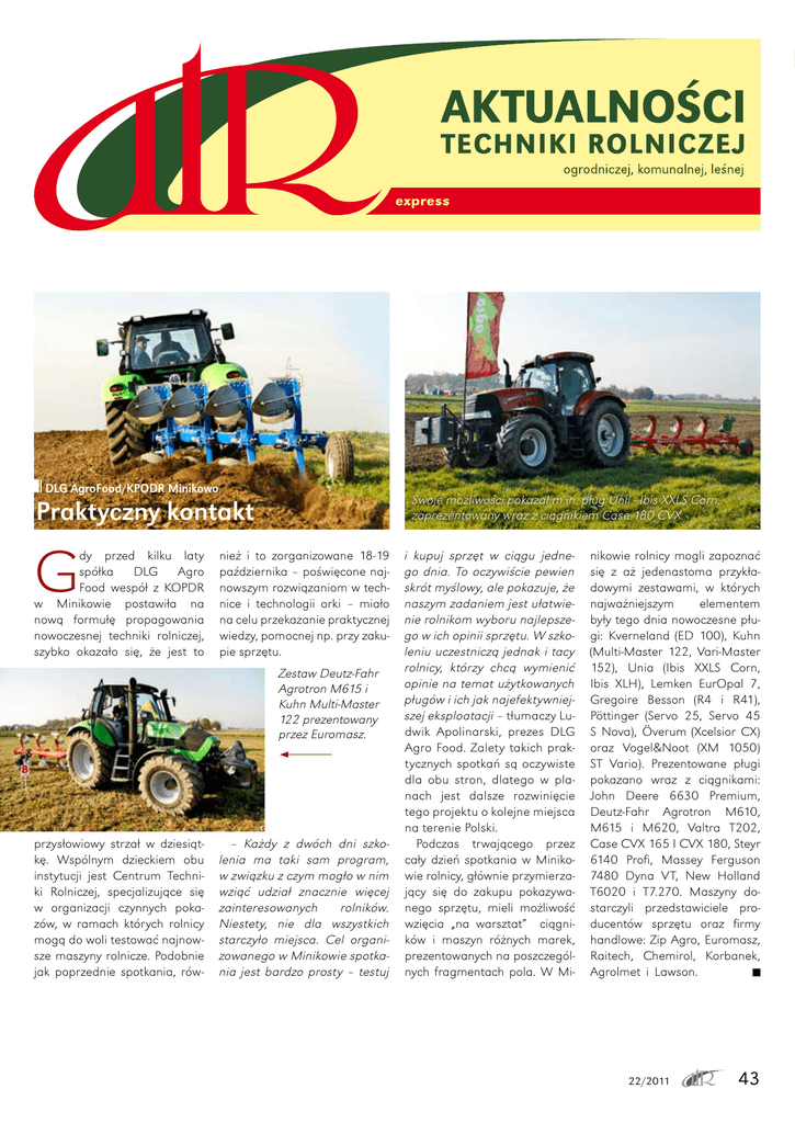 aktualności branżowe DLG AgroFood/KPODR Minikowo Swoje możliwości pokazał m.in. pług Unii - Ibis XXLS Corn, zaprezentowany wraz z ciągnikiem Case 180 CVX. Praktyczny kontakt G dy przed kilku laty spółka DLG Agro Food wespół z KOPDR w Minikowie postawiła na nową formułę propagowania nowoczesnej techniki rolniczej, szybko okazało się, że jest to nież i to zorganizowane 18-19 października – poświęcone najnowszym rozwiązaniom w technice i technologii orki – miało na celu przekazanie praktycznej wiedzy, pomocnej np. przy zakupie sprzętu. Zestaw Deutz-Fahr Agrotron M615 i Kuhn Multi-Master 122 prezentowany przez Euromasz. przysłowiowy strzał w dziesiątkę. Wspólnym dzieckiem obu instytucji jest Centrum Techniki Rolniczej, specjalizujące się w organizacji czynnych pokazów, w ramach których rolnicy mogą do woli testować najnowsze maszyny rolnicze. Podobnie jak poprzednie spotkania, rów- – Każdy z dwóch dni szkolenia ma taki sam program, w związku z czym mogło w nim wziąć udział znacznie więcej zainteresowanych rolników. Niestety, nie dla wszystkich starczyło miejsca. Cel organizowanego w Minikowie spotkania jest bardzo prosty – testuj i kupuj sprzęt w ciągu jednego dnia. To oczywiście pewien skrót myślowy, ale pokazuje, że naszym zadaniem jest ułatwienie rolnikom wyboru najlepszego w ich opinii sprzętu. W szkoleniu uczestniczą jednak i tacy rolnicy, którzy chcą wymienić opinie na temat użytkowanych pługów i ich jak najefektywniejszej eksploatacji – tłumaczy Ludwik Apolinarski, prezes DLG Agro Food. Zalety takich praktycznych spotkań są oczywiste dla obu stron, dlatego w planach jest dalsze rozwinięcie tego projektu o kolejne miejsca na terenie Polski. Podczas trwającego przez cały dzień spotkania w Minikowie rolnicy, głównie przymierzający się do zakupu pokazywanego sprzętu, mieli możliwość wzięcia „na warsztat” ciągników i maszyn różnych marek, prezentowanych na poszczególnych fragmentach pola. W Mi- nikowie rolnicy mogli zapoznać się z aż jedenastoma przykładowymi zestawami, w których najważniejszym elementem były tego dnia nowoczesne pługi: Kverneland (ED 100), Kuhn (Multi-Master 122, Vari-Master 152), Unia (Ibis XXLS Corn, Ibis XLH), Lemken EurOpal 7, Gregoire Besson (R4 i R41), Pöttinger (Servo 25, Servo 45 S Nova), Överum (Xcelsior CX) oraz Vogel&Noot (XM 1050) ST Vario). Prezentowane pługi pokazano wraz z ciągnikami: John Deere 6630 Premium, Deutz-Fahr Agrotron M610, M615 i M620, Valtra T202, Case CVX 165 I CVX 180, Steyr 6140 Profi, Massey Ferguson 7480 Dyna VT, New Holland T6020 i T7.270. Maszyny dostarczyli przedstawiciele producentów sprzętu oraz firmy handlowe: Zip Agro, Euromasz, Raitech, Chemirol, Korbanek, Agrolmet i Lawson. 22/2011 43