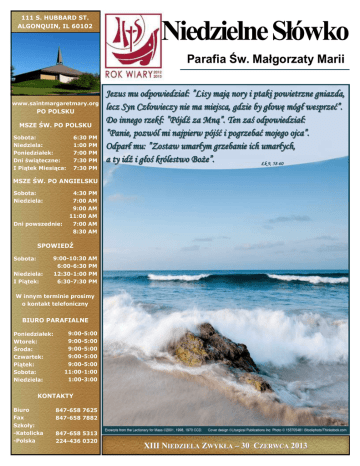 111 S. HUBBARD ST. ALGONQUIN, IL 60102 Niedzielne Słówko Parafia Św. Małgorzaty Marii www.saintmargaretmary.org PO POLSKU MSZE ŚW. PO POLSKU Sobota: Niedziela: Poniedziałek: Dni świąteczne: I Piątek Miesiąca: 6:30 1:00 7:00 7:30 7:30 PM PM PM PM PM Jezus mu odpowiedział: ”Lisy mają nory i ptaki powietrzne gniazda, lecz Syn Człowieczy nie ma miejsca, gdzie by głowę mógł wesprzeć”. Do innego rzekł: ”Pójdź za Mną”. Ten zaś odpowiedział: ”Panie, pozwól mi najpierw pójść i pogrzebać mojego ojca”. Odparł mu: ”Zostaw umarłym grzebanie ich umarłych, a ty idź i głoś królestwo Boże”. Łk 9, 58-60 MSZE ŚW. PO ANGIELSKU Sobota: Niedziela: Dni powszednie: 4:30 7:00 9:00 11:00 7:00 8:30 PM AM AM AM AM AM SPOWIEDŹ Sobota: Niedziela: I Piątek: 9:00-10:30 AM 6:00-6:30 PM 12:30-1:00 PM 6:30-7:30 PM W innym terminie prosimy o kontakt telefoniczny BIURO PARAFIALNE Poniedziałek: Wtorek: Środa: Czwartek: Piątek: Sobota: Niedziela: 9:00-5:00 9:00-5:00 9:00-5:00 9:00-5:00 9:00-5:00 11:00-1:00 1:00-3:00 KONTAKTY Biuro Fax Szkoły: -Katolicka -Polska 847-658 7625 847-658 7882 847-658 5313 224-436 0320 XIII NIEDZIELA ZWYKŁA – 30 CZERWCA 2013 Niedzielne Słówko Refleksja Nie przesadzajmy Człowiek chcący założyć ogród czy park nie będzie szedł do lasu lub sadu, by odciąć od korzenia dorosłe drzewa i przesadzić je swój teren. Wsadza najpierw nasionko w małą skrzyneczkę z ziemią, a gdy okaże się, że nasionko zakiełkowało, przenosi je do swego ogrodu. Nasionko wcale nie rośnie najpierw w górę, lecz w dół. Powołanie także nie zaczyna się od żądania dojrzałości, lecz od małego, jedynego wezwania, od najmniejszego kroku. Życie duchowe zaczyna swe dojrzewanie od najmniejszego kroku. Nie możemy przesadzać z żądaniami wobec siebie, wobec innych, a co najważniejsze, wobec samego Gdy dopełniał się czas wzięcia Jezusa z tego świata, życia. Ewangelia według św. Łukasza 9,51 - 62 Jezus nie żądał i nie żąda wiele. Od każdego z tych trzech zażądał tylko jednego, ale zdaje się, że żaden z nich nawet tego nie spełnił. Pierwszy z kandydatów do królestwa sam zaproponował wędrowanie za Jezusem. Jezus wskazał mu, że nie może oczekiwać stabilizacji – gniazdka czy norki – lecz może spodziewać się braku oparcia w czymkolwiek i kimkolwiek. Jedną z poważniejszych przeszkód na chrześcijańskiej drodze jest przesadzone żądanie od życia: dążenie do tego, by stało się ono gniazdkiem albo norką. Jak wielu kapituluje, gdy nie jest tak, jak pragnęli! I to nie tylko kapituluje w powołaniu, ale nawet nie chce im się żyć! Dane nam jest życie, ale trzeba nie tylko zgodzić się na nie, ale nawet chcieć go takim, jakie ono jest, a nie takim, jakie sobie wyobrażamy. postanowił udać się do Jerozolimy i wysłał przed sobą posłańców. Ci wybrali się w drogę i przyszli do pewnego miasteczka samarytańskiego, by Mu przygotować pobyt. Nie przyjęto Go jednak, ponieważ zmierzał do Jerozolimy. Widząc to, uczniowie Jakub i Jan rzekli: ”Panie, czy chcesz, a powiemy, żeby ogień spadł z nieba i zniszczył ich?”. Lecz On odwróciwszy się zabronił im. I udali się do innego miasteczka. A gdy szli drogą, ktoś powiedział do Niego: ”Pójdę za Tobą, dokądkolwiek się udasz”. Jezus mu odpowiedział: ”Lisy mają nory i ptaki powietrzne gniazda, lecz Syn Człowieczy nie ma miejsca, gdzie by głowę mógł wesprzeć”. Do innego rzekł: ”Pójdź za Mną”. Ten zaś odpowiedział: ”Panie, pozwól mi najpierw pójść i pogrzebać mojego ojca”. Odparł mu: ”Zostaw umarłym grzeNie dopuszczaj myśli, że śmierć wydobyłaby cię z kłopotów. banie ich umarłych, a ty idź i głoś królestwo Boże”. Nie wyobrażaj sobie, że trumna to norka albo że przytulnym Jeszcze inny rzekł: ”Panie, chcę pójść za Tobą, ale pozwól mi najpierw pożegnać się z moimi w domu”. gniazdkiem byłoby nieistnienie. Myśli samobójcze bywają Jezus mu odpowiedział: ”Ktokolwiek przykłada rękę dowodem, że nie wybraliśmy życia takiego, jakim ono jest, do pługa, a wstecz się ogląda, nie nadaje się do króale ciągle upieramy się przy wizji życia idyllicznego. lestwa Bożego”. Wykorzystajmy dwuznaczność słowa korona, bo nie tylko mówi się tak o dojrzałym rozgałęzieniu na drzewie, ale też o diademie królewskim, symbolu osiągnięcia szczytu kariery. Korona jest na dojrzałych drzewach, a nie na młodych albo tych, które dopiero puściły pierwsze pędy! Jeśli życie zaczyna się od ziarna, a nie od korony, to nie wolno zapominać, że ziarno musi obumrzeć. Tymczasem chcemy być drzewem z koroną możliwości i doskonałości, sprawności i talentów, ale bez korzenia wyrastającego z ziarna. Chcemy nosić niewidzialne korony, ale omijając wszystkie szczeble egzystencjalnego awansu. Chcemy fruwać jak ptaki i wić sobie ciepłe gniazdko, albo schować się przed wszystkimi nieszczęściami w norce, gdy tymczasem nie wykluliśmy się jeszcze z jajka ani nie wyrosły nam jeszcze pióra, i nie namęczyliśmy się przy wykopywaniu norki. Ale szczęśliwy jest nie ten, kogo spotyka powodzenie, lecz ten, kto potrafi być zadowolony nawet z niepowodzenia! Zmniejszmy oczekiwania od życia. To przesada, gdy oczekujemy od życia, że zawsze będzie udane i zawsze będzie przynosiło dla nas ptasie mleczko i krecią drzemkę. Augustyn Pelanowski OSPPE Niedzielne Słówko Ogłoszenia W poniedziałek 1-go lipca zapraszamy na Mszę Świętą o 7 wieczorem i adorację. Przypominamy i zachęcamy do osobistej adoracji Najświętszego Sakramentu. Możliwość adoracji Pana Jezusa w Eucharystii jest w każdą środę tygodnia. Rozpoczyna się po Mszy św. o godz. 8:30 rano i kończy następnego dnia przed pierwszą Mszą o godz. 7 rano. W czwartek 4-go lipca przypada Święto Niepodległości. Msza św. w tym dniu będzie o godz. 9 rano w języku angielskim. W tym dniu jak równi