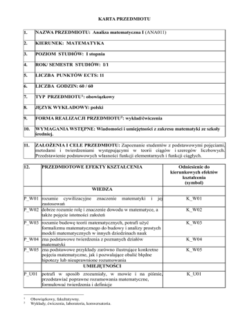KARTA PRZEDMIOTU 1. NAZWA PRZEDMIOTU: Analiza matematyczna I (ANA011) 2. KIERUNEK: MATEMATYKA 3. POZIOM STUDIÓW: I stopnia 4. ROK/ SEMESTR STUDIÓW: I/1 5. LICZBA PUNKTÓW ECTS: 11 6. LICZBA GODZIN: 60 / 60 7. TYP PRZEDMIOTU1: obowiązkowy 8. JĘZYK WYKŁADOWY: polski 9. FORMA REALIZACJI PRZEDMIOTU2: wykład/ćwiczenia 10. WYMAGANIA WSTĘPNE: Wiadomości i umiejętności z zakresu matematyki ze szkoły średniej. 11. ZAŁOŻENIA I CELE PRZEDMIOTU: Zapoznanie studentów z podstawowymi pojęciami, metodami i twierdzeniami występującymi w teorii ciągów i szeregów liczbowych. Przedstawienie podstawowych własności funkcji elementarnych i funkcji ciągłych. 12. PRZEDMIOTOWE EFEKTY KSZTAŁCENIA Odniesienie do kierunkowych efektów kształcenia (symbol) WIEDZA P_W01 rozumie cywilizacyjne znaczenie matematyki i jej zastosowań P_W02 dobrze rozumie rolę i znaczenie dowodu w matematyce, a także pojęcie istotności założeń K_W01 P_W03 rozumie budowę teorii matematycznych, potrafi użyć formalizmu matematycznego do budowy i analizy prostych modeli matematycznych w innych dziedzinach nauk P_W04 zna podstawowe twierdzenia z poznanych działów matematyki P_W05 zna podstawowe przykłady zarówno ilustrujące konkretne pojęcia matematyczne, jak i pozwalające obalić błędne hipotezy lub nieuprawnione rozumowania UMIEJĘTNOŚCI K_W03 P_U01 potrafi w sposób zrozumiały, w mowie i na piśmie, przedstawiać poprawne rozumowania matematyczne, formułować twierdzenia i definicje K_U01 1 2 Obowiązkowy, fakultatywny. Wykłady, ćwiczenia, laboratoria, konwersatoria. K_W02 K_W04 K_W05 P_U02 posługuje się rachunkiem zdań i kwantyfikatorów i potrafi poprawnie używać go także w języku potocznym P_U03 umie prowadzić łatwe i średnio trudne dowody metodą indukcji zupełnej; potrafi definiować funkcje i relacje rekurencyjne P_U04 umie stosować system logiki klasycznej do formalizacji teorii matematycznych P_U05 umie operować pojęciem liczby rzeczywistej; zna przykłady liczb niewymiernych i przestępnych P_U06 potrafi definiować funkcje, także z wykorzystaniem przejść granicznych, i opisywać ich własności P_U07 posługuje się w różnych kontekstach pojęciem zbieżności i granicy; potrafi - na prostym i średnim poziomie trudności - obliczać granice ciągów i funkcji, badać zbieżność bezwzględną i warunkową szeregów P_U08 potrafi interpretować i wyjaśniać zależności funkcyjne, ujęte w postaci wzorów, tabel, wykresów, schematów i stosować je w zagadnieniach praktycznych P_U09 potrafi mówić o zagadnieniach matematycznych zrozumiałym, potocznym językiem KOMPETENCJE SPOŁECZNE K_U02 P_K01 ma świadomość ograniczenia poziomu swojej wiedzy i umiejętności, rozumie potrzebę ciągłego dokształcania się zawodowego i rozwoju osobistego, dokonuje samooceny własnych kompetencji i doskonali umiejętności, wyznacza kierunki własnego rozwoju i kształcenia P_K02 potrafi precyzyjnie formułować pytania, służące pogłębieniu własnego zrozumienia danego tematu lub odnalezieniu brakujących elementów rozumowania P_K03 potrafi formułować opinie na temat podstawowych zagadnień matematycznych K_K01 13. P_W01, P_W02, P_W03, P_W04, P_W05, P_U01, P_U02, P_U03, P_U04, P_U05, P_U06, P_U07, P_U08, P_U09, P_K01, P_K02, P_K03 4 K_U04 K_U08 K_U09 K_U10 K_U11 K_U35 K_K02 K_K07 METODY OCENY EFEKTÓW KSZTAŁCENIA Symbol przedmiotowego efektu kształcenia 3 K_U03 Metody (sposoby) oceny3 Typ oceny4 Forma dokumentacji Ocenianie ciągłe (bieżące przygotowanie do zajęć), śródsemestralne zaliczenie pisemne, końcowe zaliczenia pisemne. Formująca Prace domowe, sprawdziany i kolokwia w formie pisemnej. Ocenianie ciągłe (bieżące przygotowanie do zajęć), śródsemestralne zaliczenie pisemne, śródsemestralne zaliczenie ustne, końcowe zaliczenia pisemne, końcowe zaliczenia ustne, egzamin pisemny, egzamin ustny, praca semestralna, ocena umiejętności ruchowych, praca dyplomowa, projekt, kontrola obecności Formująca, podsumowująca. P_W01, P_W02, P_W03, P_W04, P_W05, P_U01, P_U02, P_U03, P_U04, P_U05, P_U06, P_U07, P_U08, P_U09, P_K01, P_K03 P_K01 Egzamin pisemny, egzamin ustny. Podsumowująca Egzamin klasyczny w formie pisemnej i ustnej. Kontrola obecności 14. KRYTERIA OCENY OSIĄGNIĘTYCH EFEKTÓW KSZTAŁCENIA (opisowe, procentowe, punktowe, inne ……………………………. formy oceny do wyboru przez wykładowcę) EFEKTY KSZTAŁCENIA NA OCENĘ 3,0 P_W01, P_W02, P_W03, P_W04, P_W05, P_U01, P_U02, P_U03, P_U04, P_U05, P_U06, P_U07, P_U08, P_U09, P_K01, P_K03 50% - 60% NA OCENĘ 3,5 61% - 70% NA OCENĘ 4.0 71% - 80% NA OCENĘ 4,5 81% - 90% NA OCENĘ 5,0 91% - 100% 15. WARUNKI UZYSKANIA ZALICZENIA PRZEDMIOTU: Osiągnięcie założonych efektów kształcenia i pozytywny wynik zaliczenia egzaminu pisemnego egzaminu ustnego 16. TREŚCI PROGRAMOWE Treść zajęć 1. 2. 5 Wykłady Liczby rzeczywiste: aksjomatyka ciała liczb rzeczywistych, liczby naturalne, wymierne i niewymierne, zasada Archimedesa, gęstość liczb wymiernych i niewymiernych w zbiorze liczb rzeczywistych, przedziały, twierdzenie Ascoliego, nieprzeliczalność przedziału. Ciągi liczbowe: zbieżność ciągów liczbowych, podstawowe własności ciągów zbieżnych, twierdzenie Bolzano-Weierstrassa, granica dolna i górna ciągu liczbowego, liczba e, funkcje wykładnicza i loga- Forma zajęć5 (liczba godz.) Wykład (10 godz.) Wykład (15 godz.) Wykłady, ćwiczenia, laboratoria, samodzielne prowadzenie zajęć przez studenta. Symbol przedmiotowych efektów kształcenia P_W01, P_W02, P_W03, P_W04, P_W05, P_U01, P_U02, P_U03, P_U04, P_U05, P_U09, P_K01, P_K02, P_K03 P_W01, P_W02, P_W03, P_W04, P_W05, P_U01, P_U02, P_U03, rytmiczna. 3. Zwartość, spójność, zupełność podzbiorów prostej rzeczywistej. Wykład (5 godz.) 4. Szeregi liczbowe: szeregi zbieżne, suma szeregu, kryteria zbieżności, zbieżność bezwzględna, zbieżność warunkowa, twierdzenie Riemanna, twierdzenie Dir