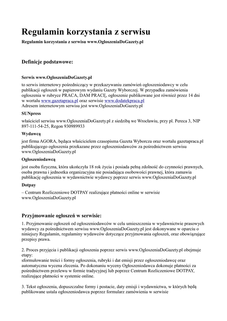 Regulamin korzystania z serwisu Regulamin korzystania z serwisu www.OgloszeniaDoGazety.pl Definicje podstawowe: Serwis www.OgloszeniaDoGazety.pl to serwis internetowy pośredniczący w przekazywaniu zamówień ogłoszeniodawcy w celu publikacji ogłoszeń w papierowym wydaniu Gazety Wyborczej. W przypadku zamówienia ogłoszenia w rubryce PRACA, DAM PRACĘ, ogłoszenie publikowane jest również przez 14 dni w wortalu www.gazetapraca.pl oraz serwisie www.dodatekpraca.pl Adresem internetowym serwisu jest www.OgloszeniaDoGazety.pl SUNpress właściciel serwisu www.OgloszeniaDoGazety.pl z siedzibą we Wrocławiu, przy pl. Pereca 3, NIP 897-111-54-25, Regon 930989933 Wydawcą jest firma AGORA, będąca właścicielem czasopisma Gazeta Wyborcza oraz wortalu gazetapraca.pl publikującego ogłoszenia przekazane przez ogłoszeniodawców za pośrednictwem serwisu www.OgloszeniaDoGazety.pl Ogłoszeniodawcą jest osoba fizyczna, która ukończyła 18 rok życia i posiada pełną zdolność do czynności prawnych, osoba prawna i jednostka organizacyjna nie posiadająca osobowości prawnej, która zamawia publikację ogłoszenia w wydawnictwie wydawcy poprzez serwis www.OgloszeniaDoGazety.pl Dotpay – Centrum Rozliczeniowe DOTPAY realizujące płatności online w serwisie www.OgloszeniaDoGazety.pl Przyjmowanie ogłoszeń w serwisie: 1. Przyjmowanie ogłoszeń od ogłoszeniodawców w celu umieszczenia w wydawnictwie prasowych wydawcy za pośrednictwem serwisu www.OgloszeniaDoGazety.pl jest dokonywane w oparciu o niniejszy Regulamin, regulaminy wydawców dotyczące przyjmowania ogłoszeń, oraz obowiązujące przepisy prawa. 2. Proces przyjęcia i publikacji ogłoszenia poprzez serwis www.OgloszeniaDoGazety.pl obejmuje etapy: sformułowanie treści i formy ogłoszenia, rubryki i dat emisji przez ogłoszeniodawcę oraz automatyczna wycena zlecenia. Po dokonaniu wyceny Ogłoszeniodawca dokonuje płatności za pośrednictwem przelewu w formie tradycyjnej lub poprzez Centrum Rozliczeniowe DOTPAY, realizujące płatności w systemie online. 3. Tekst ogłoszenia, dopuszczalne formy i postacie, daty emisji i wydawnictwa, w których będą publikowane ustala ogłoszeniodawca poprzez formularz zamówienia w serwisie www.OgloszeniaDoGazety.pl 4. Treść ogłoszeń nie może być sprzeczna z prawem, zasadami współżycia społecznego oraz regulaminami i zasadami wydawców. SUNpress nie ponosi odpowiedzialności za treść ogłoszeń ani za użyte w nim elementy graficzne. SUNpress zastrzega sobie prawo odmowy przyjęcia ogłoszenia i przekazania do publikacji, bez podania przyczyny. 5. Ogłoszeniodawca zgodnie z obowiązującym prawem prasowym, zobowiązany jest do przekazania swoich poprawnych danych osobowych i adresowych (imię, nazwisko, nr telefonu), umieszczanych na zamówieniu. Serwis nie udostępnia tych danych osobom trzecim. Przetwarzanie zbieranych danych odbywa się zgodnie z przepisami ustawy o ochronie danych osobowych i ustawy o świadczeniu usług drogą elektroniczną. 6. Daty emisji ogłoszeń w serwisie www.OgloszeniaDoGazety.pl wyznaczane są na podstawie wymagań Wydawcy Płatności za ogłoszenia: 1. Serwis www.OgloszeniaDoGazety.pl wymaga wniesienia zapłaty za zgłoszone do publikacji ogłoszenia, zanim nastąpi przekazanie ich do publikacji. 2. Klienci posiadający dostęp do swoich kont poprzez Internet (i możliwość wykonywania przelewów) mogą dokonać zapłaty za zlecanie ogłoszeń bezpośrednio na konto SUNpress. Numer konta SUNpress znajduje sie w serwisie www.OgloszeniaDoGazety.pl w zakładce: DANE DO PRZELEWU lub bezpośrednio w przypadku nadania ogłoszenia drobnego w kroku 3 zamówienia. Faktury: 1. ogłoszeniodawca wyraża zgodę na wystawienie przez SUNpress faktury VAT bez jego podpisu oraz do wysyłki faktury drogą elektroniczną w formacie PDF. 2.W przypadku chęci otrzymania faktury papierowej opatrzonej pieczątkami ogłoszeniodawca prześle taką prośbę na adres e-mail SUNpress podany w zakładce KONTAKT lub za pośrednictwem formularza kontaktowego dostępnego w zakładce KONTAKT Reklamacje: 1. Jeśli ogłoszenie zgłoszone przez Ogłoszeniodawcę kwalifuje sie do publikacji, zostają one automatycznie wysłane do Wydawcy. Wstrzymanie publikacji ogłoszeń lub ich wycofywanie przed publikacją winno być zgłoszone telefonicznie pod numery wskazane w serwisie www.OgloszeniaDoGazety.pl w zakładce KONTAKT lub na adres: [email protected] 2. Reklamacje dotyczące realizacji usługi ogłoszeniodawca zobowiązany jest zgłaszać do na adres [email protected] nie później niż w ciągu dwóch dni roboczych licząc od dnia pierwszej reklamowanej publikacji. 3. Jeżeli reklamacja dotyczy wad zawinionych przez www.OgloszeniaDoGazety.pl to SUNpress w uzgodnieniu z ogłoszeniodawcą zobowiązany jest usunąć wady w reklamowanym ogłoszeniu lub ustalić rekompensatę dla ogłoszeniodawcy. Rekompensata ta nie może przekraczać kwoty pobranej od ogłoszeniodawcy za publikację ogłoszenia. Inne: 1. SUNpress nie ponosi odpowiedzialności wobec ogłoszeniodawcy za niewykonanie lub nienależyte wykonanie usług z przyczyn leżących po stronie osób trzecich lub spowodowanych działaniami siły wyższej. 2. Ogłoszeniodawca zobowiązany jest do naprawienia wszelkich szkód powstałych po stronie SUNpress w związku z treścią zamieszczonego ogłoszenia lub dołączonymi do niego elementami graficznymi, w tym i do poniesienia niezbędnych kosztów postępowań spornych, wpisów sądowych, kosztów zastępstwa procesowego i innych uzasadnionych wydatków SUNpress poniesionych w związku z roszczeniami osób trzecich. 3. Ogłoszeniodawca jest wyłącznie odpowiedzialny za zapewnienie, że przysługują mu prawa na dobrach niematerialnych (autorskie, pokrewne, wynalazcze, z tytułu tajemnicy przedsiębiorstwa i inne) do posługiwania się użytymi w zleconych do publikacji ogłoszeniach - informacjami, danymi, fragmentami utworów lub innymi elementami stanowiącymi przedmiot j