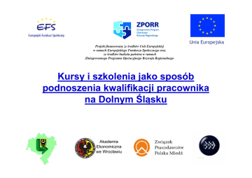 Projekt finansowany ze środków Unii Europejskiej w ramach Europejskiego Funduszu Społecznego oraz ze środków budżetu państwa w ramach Zintegrowanego Programu Operacyjnego Rozwoju Regionalnego Unia Europejska Kursy i szkolenia jako sposób podnoszenia kwalifikacji pracownika na Dolnym Śląsku Akademia Ekonomiczna we Wrocławiu Prezentowane wyniki pochodzą z dwóch badań ankietowych: • badanie oczekiwań pracodawców (XI 2005r.) • oczekiwań pracujących (I 2006r.) Obydwa badania wykonał instytut ASM – Centrum Badań i Analiz Rynku w ramach projektu „WIEDZA PLUS 2” Badanie pracodawców: • badanie zostało przeprowadzone w listopadzie 2005r. • badanie zostało przeprowadzone techniką ankietową za pomocą specjalnie stworzonego kwestionariusza wywiadu • próba badawcza objęła 2000 pracodawców • analizy były prowadzone oddzielnie dla firm zatrudniających do 9 osób i pow. 9 pracowników oraz w podziale na sekcje PKD Badanie pracujących: • badanie zostało przeprowadzone w styczniu 2006r. • badanie zostało przeprowadzone techniką ankietową za pomocą specjalnie stworzonego kwestionariusza wywiadu • próba badawcza objęła 2400 osób pracujących z woj.. dolnośląskiego • analizy były prowadzone z uwzględnieniem typu stanowiska, na jakim pracują respondenci Celem prezentacji będzie przedstawienie aktywności pracodawców woj. dolnośląskiego w zakresie podnoszenia kwalifikacji pracowników Korzystanie ze szkoleń zewnętrznych przez przedsiębiorstwa woj. dolnośląskiego (w %; N=2000) nie 56,8% tak 42,3% trudno powiedzieć 0,9% Rodzaje kursów i szkoleń zewnętrznych, z jakich korzystają przedsiębiorstwa woj. dolnośląskiego (w %; N=846)* 30,3 praktyczne wykonywanie zawodu 29,6 specjalistyczne kursy zawodowe 17,4 finanse i księgowość 6,5 sprzedaż, obsługa klienta 5,0 ubezpieczenia 3,4 marketing uprawnienia do obsługi wózków widłowych, koparek 2,0 szkolenia komputerowe 1,7 zarządzanie jakością 1,5 jezyki obce 1,5 obsługa maszyn i urządzeń (tokarki, spawarki etc.) 1,4 zarządzanie zasobami ludzkimi 1,4 obsługa urządzeń biurowych 1,0 22,4 inne 0 * Na wykresie zaprezentowano odpowiedzi, które uzyskały pow. 1% wskazań. 40 Bardzo mała korzyść 1 pracujący (N=1294) pracodawcy (N=846) 4,1 4,1 3 2 3,7 3,8 finanse, ksiegowość 4,1 kurs językowy 3,9 4,3 4,1 zarządzanie zasobami ludzkimi 4,0 4,2 4,2 praktyczne wykonywanie zawodu 3,7 3,9 4,2 ubezpieczenia 4,0 obsługa urządzeń biurowych 3,8 4,2 sprzedaż, obsługa klienta 4,0 4,3 szkolenia komputerowe 4,5 4,3 specjalistyczne kursy zawodowe 4,1 4,3 rozwój osobisty 4,4 zarządzanie jakością 4 4,5 marketing 4,3 kurs szybkiego czytania 4,5 uprawnienia do obsł. wózków widł. Bardzo duża korzyść 5 5,0 obsługa maszyn i urządzeń prawo jazdy (wszystkie kategorie) Ocena efektywności szkoleń i kursów 5,0 4,2 4,0 4,0 Plany przedsiębiorstw woj. dolnośląskiego związane z wydatkami na doszkalanie pracowników w najbliższych latach (2006, 2007) (w %; N=2000) nie zmieniać 55,3% zmniejszyć 1,2% zwiększyć 9,5% trudno powiedzieć 34,0% Organizowanie szkoleń przez firmy, w których pracują respondenci (w %; N=2400) Proszę powiedziec, czy Pana/i firma organizuje kursy lub szkolenia dla swoich pracowników? tak 77,1 nie 21,0 trudno powiedziec 1,9 0 100 Organizowanie szkoleń przez firmy, w których pracują respondenci wg przynależności do sekcji PKD (w %; N=2400) Proszę powiedziec, czy Pana/i firma organizuje kursy lub szkolenia dla swoich pracowników? 100 96,6 85,7 84,6 95,8 82,4 76,3 75,0 77,8 71,4 62,1 50,0 56,6 47,6 43,6 zespoły eksterytorialne działalnośc usł., komunalna ochrona zdrowia edukacja administracja obsł. nieruchomości transport hotele i restauracje handel budownictwo energia, gaz, woda przetwórstwo przem. górnictwo rolnictwo 0 pośr. finansowe 22,2 Organizowanie szkolen przez firmy, w których pracuja respondenci wg lokalizacji firmy – glówna siedziba (w %; N=2400) Prosze powiedziec, czy Pana/i firma organizuje kursy lub szkolenia dla swoich pracowników? 100 86,8 89,0 87,1 79,2 86,3 80,0 77,4 74,2 84,5 85,7 75,6 75,0 73,5 69,5 67,1 77,3 67,1 66,7 81,3 67,6 84,2 76,7 80,0 75,0 78,4 72,0 65,3 64,9 67,5 Jelenia Góra Legnica Wrocław milicki ząbkowicki trzebnicki głogowski lwówecki kamiennogórski jeleniogórski wołowski polkowicki lubiński oławski bolesławiecki świdnicki górowski zgorzelecki lubański legnicki jaworski złotoryjski wałbrzyski dzierżoniowski kłodzki średzki oleśnicki strzeliński wrocławski 0 Osoby pracujące podejmujące „na własną rękę” działania w celu podniesienia swoich kwalifikacji (w %; N=2400) nie 54,9% tak 45,1% Osoby pracujące podejmujące „na własną rękę” działania w celu podniesienia swoich kwalifikacji – wg stażu pracy (w %) 72,3 do 1 roku (N=177) powyżej 1 roku do 2 lat (N=121) 63,6 62,9 powyżej 2 lat do 5 lat (N=278) powyżej 5 lat do 10 lat (N=394) 51,5 34,9 powyżej 10 lat (N=1425) 0 80 Rodzaje działań podejmowanych samodzielnie przez osoby pracujące w celu podniesienia swoich kwalifikacji (w %; N=1083) 48,4 edukacja szkolna/studia 42,9 kursy/szkolenia 24,7 samokształcenie 1,6 inne formy 0 60 Rodzaje kursów i szkoleń, jakie podejmowały osoby pracujące „na własną rękę” (w %; N=465)* jezyki obce 37,8 23,2 praktyczne wykonywanie zawodu 17,2 szkolenia komputerowe specjalistyczne kursy zawodowe 15,9 prawo jazdy (wszystkie kategorie) 11,8 finanse i księgowość 8,4 rozwój osobisty (autoprezentacja, kreatywne myślenie) 4,5 3,9 marketing 2,8 sprzedaż, obsługa klienta zarządzanie zasobami ludzkimi 2,8 fundusze unijne, pozyskiwanie środków 2,2 obsługa urządzeń biurowych 1,5 ubezpieczenia 1,3 uprawnienia do obsługi wózków widłowych, koparek 1,3 0 * Na wykresie przedstawiono odpowiedzi, które uzyskały pow. 1% wskazań. 50 1 2 zarządzanie jakością 4,0 obsługa maszyn i urządzeń 4,0 zarządzanie zasobami ludzkimi 4 kurs językowy 4,0 uprawni
