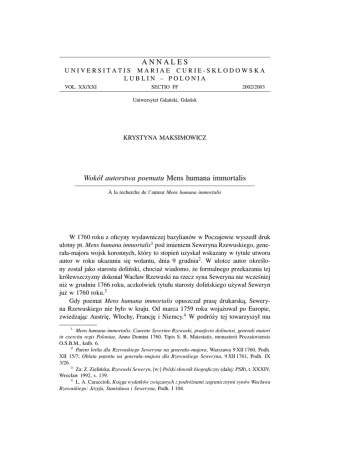 ANNALES UNIVERSITATIS MARIAE CURIE-SKŁODOWSKA LUBLIN – POLONIA VOL. XX/XXI SECTIO FF 2002/2003 Uniwersytet Gdański, Gdańsk KRYSTYNA MAKSIMOWICZ Wokół autorstwa poematu Mens humana immortalis À la recherche de l’auteur Mens humana immortalis W 1760 roku z oficyny wydawniczej bazylianów w Poczajowie wyszedł druk ulotny pt. Mens humana immortalis1 pod imieniem Seweryna Rzewuskiego, generała-majora wojsk koronnych, który to stopień uzyskał wskazany w tytule utworu autor w roku ukazania się wolantu, dnia 9 grudnia2 . W ulotce autor określony został jako starosta doliński, chociaż wiadomo, że formalnego przekazania tej królewszczyzny dokonał Wacław Rzewuski na rzecz syna Seweryna nie wcześniej niż w grudniu 1766 roku, aczkolwiek tytułu starosty dolińskiego używał Seweryn już w 1760 roku.3 Gdy poemat Mens humana immortalis opuszczał prasę drukarską, Seweryna Rzewuskiego nie było w kraju. Od marca 1759 roku wojażował po Europie, zwiedzając Austrię, Włochy, Francję i Niemcy.4 W podróży tej towarzyszył mu 1 Mens humana immortalis. Canente Severino Rzewuski, praefecto dolinensi, generali maiori in exercitu regis Poloniae, Anno Domini 1760. Tipis S. R. Maiestatis, monasterii Poczaioviensis O.S.B.M., knlb. 6. 2 Patent króla dla Rzewuskiego Seweryna na generała–majora, Warszawa 9 XII 1760, Podh. XII 15/7; Oblata patentu na generała–majora dla Rzewuskiego Seweryna, 9 XII 1761, Podh. IX 3/26. 3 Za: Z. Zielińska, Rzewuski Seweryn, [w:] Polski słownik biograficzny (dalej: PSB), t. XXXIV, Wrocław 1992, s. 139. 4 L. A. Caraccioli, Księga wydatków związanych z podróżnami zagranicznymi synów Wacława Rzewuskiego: Józefa, Stanisława i Seweryna, Podh. I 104. 2 KRYSTYNA MAKSIMOWICZ guwerner Louis-Antoine Caraccioli, uczony Włoch należący do księży oratorianów. Mentor podhorecki był człowiekiem o dużych aspiracjach intelektualnych, posiadał wysoką kulturę literacką. Ogromny rozgłos zyskała jego praca Lettres intéressantes du pape Clément XIV, długo uważana za autentyczne dzieło papieża.5 Dużą poczytnością cieszyły się rozprawy Caracciolego o treści religijno-moralnej, z których duchowni prowincjonalni — jak podaje biografka Włocha — czerpali tematy do swoich kazań.6 Jego prace przekładano na kilka języków, w tym na język polski. Caraccioli jest autorem biografii Wacława Rzewuskiego pt. La Vie du comte Wenceslas Rzewuski, grand général et premier sénateur de Pologne, do której materiałów dostarczył mu Seweryn Rzewuski. W tym dziele przyznał on autorstwo poematu Mens humana immortalis Wacławowi Rzewuskiemu.7 Niestety apologetyczna biografia pióra Caracciolego nie jest wolna od błędów. Spróbujmy zatem dociec, czy nie mylił się w sprawie interesującej nas atrybucji autorskiej. Pytanie jest zasadne, gdyż historycy literatury nie dają w tej materii jednakowej odpowiedzi. Pogląd Caracciolego przyznający autorstwo poematu Wacławowi Rzewuskiemu powtórzył Michał Hieronim Juszyński w pracowicie napisanej bibliografii poetów polskich8 i ta wersja trafiła do Bibliografii Polskiej Karola Estreichera9 . Józef Hieronim Rychter wpisał utwór na konto Seweryna Rzewuskiego, któremu poświęcił dwa krótkie szkice literackie10 , a Janina Majerowa we Wstępie do wydania Tragedii i komedii Wacława Rzewuskiego stwierdziła, iż Seweryn był jedynym synem hetmana, „[. . . ] pod którego imieniem Wacław Rzewuski nie ogłosił żadnego ze swoich pism, posługując się stale imionami dwóch starszych, i to konsekwentnie także dla rodzajów twórczości: Józef był rzekomym autorem pism literackich, Stanisław — publicystą”11 . W ten sposób badaczka ta odrzuciła sugestię autorstwa Wacława Rzewuskiego. W rzeczywistości sprawa atrybucji autorskiej poematu Mens humana immortalis jest bardziej skomplikowana i wychodzi poza przedstawione tu stanowiska 5 Lettres intéressantes du pape Clément XIV, t. I–II, Paryż 1775. Wyd. następne: Paryż 1776 (osiem wyd.); t. III: Paryż 1777 (cztery wyd.). Przekł. pol.: K. Moszczyński, Listy papieża Klemensa XIV Ganganellego, t. I–II, Kraków 1778–1779. 6 H. Waniczkówna, Caraccioli Ludwik Antoni, [w:] PSB, t. III, Kraków 1937, s. 202–203. 7 Wyd.: Liège 1782, s. 28. 8 M. H. Juszyński, Dykcjonarz poetów polskich, t. II, Kraków 1820, s. 145–146. 9 K. Estreicher, Bibliografia polska, t. XXVI, Kraków 1915, s. 556. Zob. też: Bibliografia literatury polskiej „Nowy Korbut”, t. VI/I, Warszawa 1970, s. 134. 10 J. H. Rychter, Hetman Rzewuski jako poeta, „Tygodnik Ilustrowany” 1884, nr 96, s. 283; id., Nie wydane poezje Seweryna Rzewuskiego, „Wiadomości Bibliograficzne” 1884, R. 3, s. 182–183. 11 J. Majerowa, Wstęp do: W. Rzewuski, Tragedie i komedie, Warszawa 1962, s. 37. WOKÓŁ AUTORSTWA POEMATU MENS HUMANA IMMORTALIS 3 badaczy. W znacznym stopniu problem ten rozwiązuje przekład poematu na język polski dokonany przez Seweryna Rzewuskiego, poprzedzony wierszowanym listem dedykacyjnym do kasztelana bełskiego Ewarysta Andrzeja Kuropatnickiego, właściciela dóbr tarnowieckich w powiecie jasielskim. Adresat dedykacji należał do ówczesnej elity intelektualnej kraju i spokrewniony był z wieloma przedniejszym rodami: Łaszczami, Tarłami, Załuskimi, Sapiehami, a przez małżeństwo z Katarzyną Łętowską spowinowacił się z Jordanami, Morsztynami i Lubomirskimi. Nie bez wpływu na wysoką pozycję Kuropatnickich były też zapewne zażyłe stosunki z Kazimierzem Poniatowskim, starszym bratem Stanisława Augusta, dzierżącym urząd podkomorzego koronnego.12 Kuropatnicki znany był z różnorakiej działalności, ale na szczególną uwagę zasługuje jego pasja bibliofilska. Z pieczołowitością gromadził dokumentację obejmującą wiele dziedzin życia, zwłaszcza politycznego, kulturalnego i literackiego. Zebrane przez niego Collectanea liczą około 60 tomów, wśród nich bogaty zespół gazetek pisanych z lat 1759–17