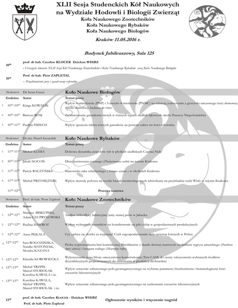 XLII Sesja Studenckich Kół Naukowych na Wydziale Hodowli i Biologii Zwierząt Koła Naukowego Zootechników Koła Naukowego Rybaków Koła Naukowego Biologów Kraków 11.05.2016 r. Budynek Jubileuszowy, Sala 125 1000 1010 prof. dr hab. Czesław KLOCEK Dziekan WHiBZ - Uroczyste otwarcie XLII Sesji Kół Naukowego Zootechników i Koła Naukowego Rybaków oraz Koła Naukowego Biologów Prof. dr hab. Piotr ZAPLETAL – Przedstawienie jury i zasad oceny referatów Moderator Dr Irena Grześ Koło Naukowe Biologów Godzina Autor Temat pracy Kinga KOWALIK Wpływ 4-nitrofenolu (PNP) i 3-metylo-4-nitofenolu (PNMC) na sekrecję jodotyronin z gruczołu tarczowego kury domowej (Gallus domesticus); badania in vitro 1. 1030-1040 2. 1040-1050 Bartosz ROM Zróżnicowanie gatunkowe motyli w różnych typach siedlisk łąkowych okolic Puszczy Niepołomickiej 3. 1050-1100 Paulina ŚMIECH Wpływ spożycia mleka różnych gatunków na poziom cukru we krwi człowieka Moderator Dr inż. Paweł Szczerbik Koło Naukowe Rybaków Godzina Autor Temat pracy 1. 1100-1110 Michał KLIMA Dobowa dynamika zespołów ryb w płytkich siedliskach Czarnej Nidy 2. 1010-1120 Jakub NOCOŃ Dieta kormorana czarnego (Phalacrocorax carbo) na terenie Krakowa 3. 1120-1130 Patryk RACZYŃSKI Stanowiska raka szlachetnego (Astacus astacus ) w okolicach Krakowa 4. 1130-1140 Michał PRZYSIĘŻNIK Wpływ metody połowu na wyniki badań monitoringowych ichtiofauny na przykładzie rzeki Wisły w rejonie Krakowa 1140-1200 Przerwa kawowa Moderator Prof. dr hab. Piotr Zapletal Koło Naukowe Zootechników Godzina Autor Temat pracy Mariusz BISKUPSKI, Adam CZUPRYNOWSKI Analiza mikroflory bakteryjnej jamy ustnej psów w Jakucku 1. 1200-1210 2. 1210-1220 Paulina HAWROT Wpływ wybranych czynników na kształtowanie się płci cieląt w gospodarstwach produkcyjnych 3. 1220-1230 Anna PĘKALA Czy opłaca się skórka za wyprawę? Czyli zagospodarowanie skór zwierząt łownych w Polsce 4. 1230-1240 Sara ROGOZIŃSKA, Natalia MATONIAK, Monika KAZANA Próba wyprowadzenia linii komórkowej fibroblastów z tkanki skórnej martwych osobników tygrysa amurskiego (Panthera tigris altaica) i kangura rudego (Macropus rufus) 5. 1240-1250 Klaudia KOROWIECKA Wykorzystanie testu błony omoczniowo-kosmówkowej (Test CAM) do oceny toksyczności wybranych środków dezynfekcyjnych proponowanych do stosowania w produkcji drobiarskiej 6. 1250-1300 Michał TRZPIS Marcel STODOLAK Karolina KAWALA i in. Wpływ sztucznie zaburzonego pola geomagnetycznego na wybrane parametry biochemiczne i hematologiczne krwi szczurów laboratoryjnych 7. 1300-1310 Karolina KAWALA, Michał TRZPIS, Marcel STODOLAK i in. Wpływ sztucznie zaburzonego pola geomagnetycznego na zachowanie szczurów laboratoryjnych 1330 prof. dr hab. Czesław KLOCEK - Dziekan WHiBZ Prof. dr hab. Piotr Zapletal Ogłoszenie wyników i wręczenie nagród