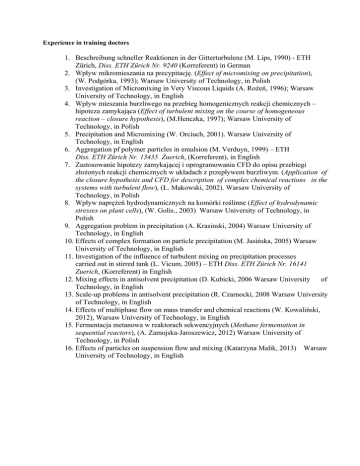 Experience in training doctors 1. Beschreibung schneller Reaktionen in der Gitterturbulenz (M. Lips, 1990) - ETH Zürich, Diss. ETH Zürich Nr. 9240 (Korreferent) in German 2. Wpływ mikromieszania na precypitację. (Effect of micromixing on precipitation), (W. Podgórka, 1993); Warsaw University of Technology, in Polish 3. Investigation of Micromixing in Very Viscous Liquids (A. Rożeń, 1996); Warsaw University of Technology, in English 4. Wpływ mieszania burzliwego na przebieg homogenicznych reakcji chemicznych – hipoteza zamykająca (Effect of turbulent mixing on the course of homogeneous reaction – closure hypothesis), (M.Henczka, 1997); Warsaw University of Technology, in Polish 5. Precipitation and Micromixing (W. Orciuch, 2001). Warsaw University of Technology, in English 6. Aggregation pf polymer particles in emulsion (M. Verduyn, 1999) – ETH Diss. ETH Zürich Nr. 13435 Zuerich, (Korreferent), in English 7. Zastosowanie hipotezy zamykającej i oprogramowania CFD do opisu przebiegi złożonych reakcji chemicznych w układach z przepływem burzliwym. (Application of the closure hypothesis and CFD for description of complex chemical reactions in the systems with turbulent flow), (Ł. Makowski, 2002). Warsaw University of Technology, in Polish 8. Wpływ naprężeń hydrodynamicznych na komórki roślinne (Effect of hydrodynamic stresses on plant cells), (W. Golis., 2003) Warsaw University of Technology, in Polish 9. Aggregation problem in precipitation (A. Krasinski, 2004) Warsaw University of Technology, in English 10. Effects of complex formation on particle precipitation (M. Jasińska, 2005) Warsaw University of Technology, in English 11. Investigation of the influence of turbulent mixing on precipitation processes carried out in stirred tank (L. Vicum, 2005) – ETH Diss. ETH Zürich Nr. 16141 Zuerich, (Korreferent) in English 12. Mixing effects in antisolvent precipitation (D. Kubicki, 2006 Warsaw University of Technology, in English 13. Scale-up problems in antisolvent precipitation (R. Czarnocki, 2008 Warsaw University of Technology, in English 14. Effects of multiphase flow on mass transfer and chemical reactions (W. Kowaliński, 2012), Warsaw University of Technology, in English 15. Fermentacja metanowa w reaktorach sekwencyjnych (Methane fermentation in sequential reactors), (A. Zamojska-Jaroszewicz, 2012) Warsaw University of Technology, in Polish 16. Effects of particles on suspension flow and mixing (Katarzyna Malik, 2013) Warsaw University of Technology, in English