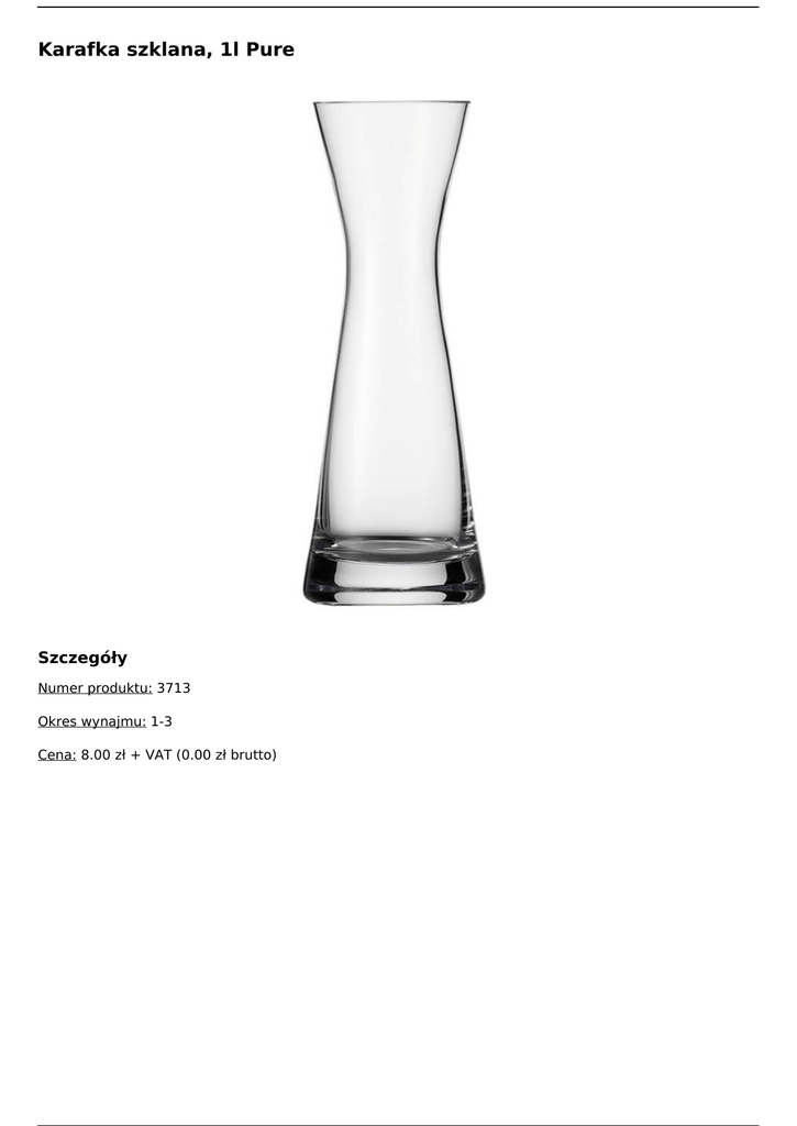 Karafka szklana, 1l Pure Szczegóły Numer produktu: 3713 Okres wynajmu: 1-3 Cena: 8.00 zł + VAT (0.00 zł brutto) Powered by TCPDF (www.tcpdf.org)