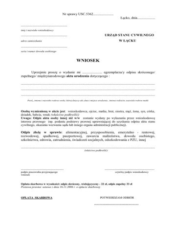 Nr sprawy USC.5362....................... Łącko, dnia.................... .................................................... imię i nazwisko wnioskodawcy .................................................... URZĄD STANU CYWILNEGO W ŁĄCKU adres zamieszkania .................................................... seria i numer dowodu osobistego WNIOSEK Uprzejmie proszę o wydanie mi ...................... egzemplarza/y odpisu skróconego/ zupełnego/ międzynarodowego aktu urodzenia dotyczącego : ....................................................................................................................................................... ....................................................................................................................................................... ....................................................................................................................................................... Pesel, imiona i nazwisko rodowe osoby, której dotyczy akt, data i miejsce urodzenia , imiona rodziców, nazwisko rodowe matki Osobą wymienioną w akcie jest: wnioskodawca, ojciec, matka, brat, siostra, mąż, żona, syn, córka, dziadek, babcia, wnuk (właściwe podkreślić) Uwaga: Odpis aktu osoby innej niż w/w zostanie wydany po wykazaniu przez wnioskodawcę interesu prawnego (np. podaniu podstawy prawnej uprawniającej do uzyskania odpisu aktu stanu cywilnego, okazania wezwania sądu lub innego organu administracji publicznej). Odpis złożę w sprawie: alimentacyjnej, przysposobienia, emerytalno - rentowej, rozwodowej, spadkowej, paszportowej, zawarcia małżeństwa, dowodu osobistego, szkolnictwa, zdrowia, zatrudnienia, świadczeń socjalnych, odszkodowania z PZU, innej ....................................................................................................................................................... (właściwe podkreślić) ................................................ podpis pracownika przyjmującego wniosek ........................................................ czytelny podpis wnioskodawcy Opłata skarbowa w wysokości: odpis skrócony, wielojęzyczny - 22 zł, odpis zupełny 33 zł Postawa prawna: ustawa z dnia 16.11.2006 r. o opłacie skarbowej. OPŁATA SKARBOWA POTWIERDZAM ODBIÓR ............................................................