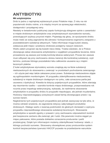 ANTYBIOTYKI Mit antybiotyków Drób to jedno z najchętniej wybieranych przez Polaków mięs. Z roku na rok popularność drobiu rośnie, a to między innymi za sprawą jego właściwości, dostępności i przystępnej ceny. Niestety w świadomości publicznej często funkcjonują obiegowe opinie o zawartości w mięsie drobiowym antybiotyków oraz antybiotykowych stymulatorów wzrostu, powodujących szybszy przyrost mięśni. Pojawiają się głosy, że spożywanie drobiu może nieść ze sobą zagrożenia dla zdrowia i funkcjonowania organizmu związane z pozostałościami substancji aktywnych. Takie informacje mogą budzić obawy, zwłaszcza jeśli mięso i przetwory drobiowe podajemy naszym dzieciom. Warto zatem przyjrzeć się tej kwestii nieco bliżej. Trzeba wiedzieć, że w Polsce obowiązuje zakaz stosowania antybiotyków z wyjątkiem przypadków leczenia, które prowadzone są zawsze pod ścisłą kontrolą lekarza weterynarii. Proces ten zawsze musi odbywać się przy zachowaniu okresu karencji dla konkretnej substancji, czyli terminu, podczas którego pozostałości leku całkowicie usuwane są z mięśni leczonych ptaków. Z kolei antybiotykowe stymulatory wzrostu znajdują się na liście substancji niedozwolonych do stosowania u zwierząt i w produktach pochodzenia zwierzęcego – ich użycie jest więc także zakazane przez prawo. Substancje niedozwolone objęte są ogólnopolskim monitoringiem. W przypadku zidentyfikowania niedozwolonej substancji w mięsie drobiowym dostępnym na rynku, cała oznaczona partia jest usuwana z dystrybucji. Kwestia ta dotyczy pojedynczych przypadków, które zdarzają się niezmiernie rzadko – szerokie kontrole mięsa drobiowego, przeprowadzane rok rocznie przez inspekcję weterynaryjną, wykazały, że nadmierne stosowanie antybiotyków w przypadku drobiu to przypadki niepokojące, ale jednak incydentalne. Hodowcy nieprzestrzegający powyższych zasad łamią obowiązujące prawo i są surowo karani. Nagłośnienie tych pojedynczych przypadków jest jednak zazwyczaj na tyle silne, iż można odnieść wrażenie, że zagrożenie dotyczy całej kategorii produktów drobiowych. Dlatego warto z rezerwą podchodzić do głośnych doniesień o wykryciu przypadku nieprawidłowego stosowania substancji leczniczych. Stosowanie antybiotyków w sposób zgodny z prawem i przy zachowaniu odpowiednich kontroli jest bezpieczne zarówno dla zwierząt, jak i ludzi. Dla pewności można sięgać po mięso pakowane, które posiada dokładne oznaczenia producenta i partii produkcyjnej. Dzięki tym informacjom możemy zidentyfikować hodowcę i stado, z którego pochodzi surowiec. Stosowany obowiązkowo przez producentów system kontroli bezpieczeństwa żywności HACCP pozwala na prześledzenie warunków chowu, w tym kwestii związanych z dobrostanem zwierząt czy jego żywieniem. System gwarantuje także, że w przypadku zagrożenia występowania w mięsie pozostałości substancji aktywnych, cała partia produkcyjna jest usuwana z rynku. Można więc mieć pewność, że prawidłowo oznakowane mięso i jego przetwory dostępne w sklepach są bezpieczne.
