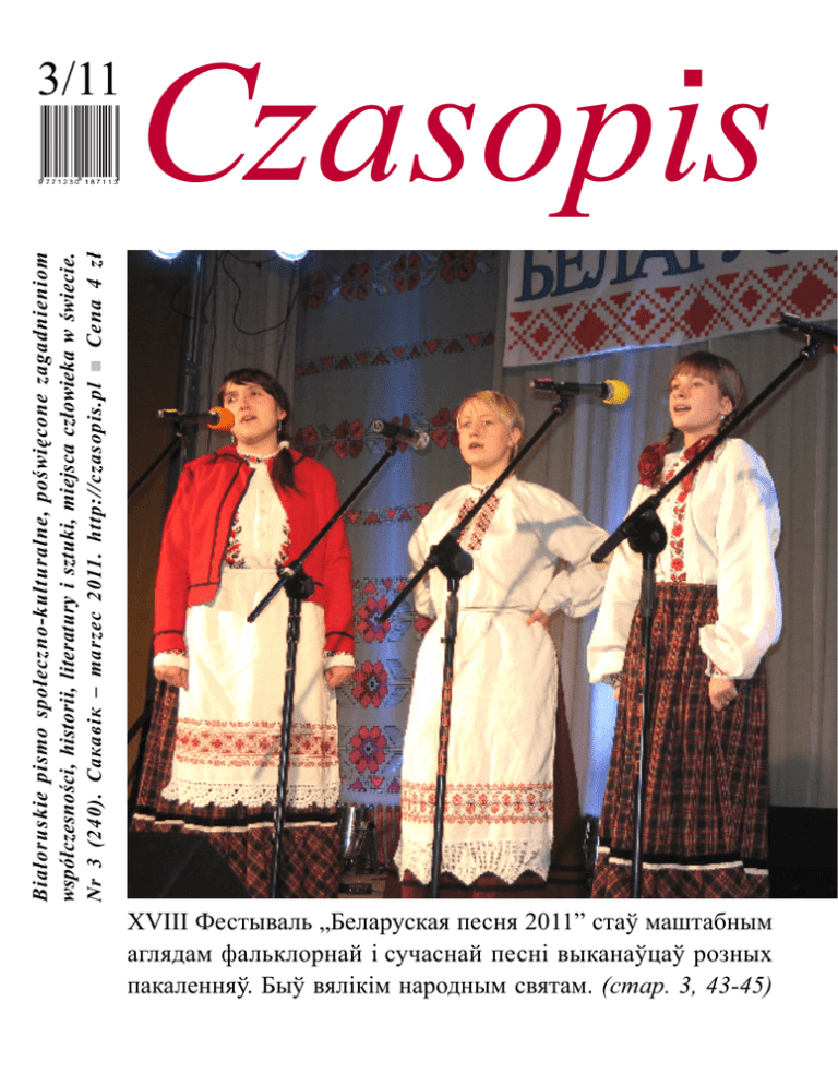 Białoruskie pismo społeczno-kulturalne, poświęcone zagadnieniom współczesności, historii, literatury i sztuki, miejsca człowieka w świecie. Nr 3 (240). Сакавік – marzec 2011. http://czasopis.pl ■ Cena 4 zł 3/11 Czasopis XVIII Фестываль „Беларуская песня 2011” стаў маштабным аглядам фальклорнай і сучаснай песні выканаўцаў розных пакаленняў. Быў вялікім народным святам. (стар. 3, 43-45) – Uważam, że obawy mniejszości są całkowicie bezzasadne i szczera deklaracja nie niesie żadnego zagrożenia. Zachęcałabym do spisywania się przez Int... (str. 20) – Я дамовіўся, што паразмаўляю з жонкамі затрыманых. У момант, калі я браў у іх інтэрв’ю, да мяне падышлі супрацоўнікі КДБ і папр... (str. 22) – Na Sądny Dzień wszyscy Żydzi udawali się do synagogi, w której paliły się grube, na pół metra wysokie świece. Nasi chłopcy czasem robili żart, któ... (str. 28) ■Сакрат Яновіч. Знак катастрофы? У гэтую зіму я атрымліваў пісьмы і тэлефоны ад равесных мне людзей... str. 4 ■Tamara Bołdak-Janowska. Czarka na pasaszok. Cudne są białoruskie piosenki i pieśni biesiadne, m.in. „Czarka... str. 6 ■Krzysztof Goss. Dwie tożsamości w jednej. Zbliżający się spis powszechny budzi w środowiskach mniejszościowych... str. 8 ■Doroteusz Fionik. Narodowość – białoruska, język – ruski podlaski. W związku z czekającym nas spisem powsze... str. 9 ■Janusz Korbel. Podróże kształcą. Białowieski Park Narodowy zorganizował seminarium poświęcone rewaloryzacji... str. 10 ■Opinie, cytaty. – Tegoroczny festiwal piosenki białoruskiej pobił dotychczasowe rekordy – zarówno pod względem... str. 12 ■Minął miesiąc. W regionie. 28 stycznia w Instytucie Pamięci Narodowej w Białymstoku odbyło się spotkanie „Rela... str. 13 ■Яшчэ і пад наглядам Эўропы. На пачатку лютага Беласток наведалі спэцыялісты Рады Эўропы, як... str. 19 ■Spisujmy się przez internet. Rozmowa z Ewą KamińskąGawryluk, dyrektorem Urzędu Statystycznego w Bi... str. 20 ■Беларуская ноч таксама скончыцца на світанні. „Беларуская ўлада пачала выкарыстоўваць мет ... str. 22 ■Zanurzona w przyrodzie i historii. Rozmowa z Ewą Zwierzyńską – lekarzem, fotografikiem, dziennikarką... str. 25 ■Ich święta. Każdy naród posiada i celebruje własne święta i tradycje religijne. Orlę od zawsze zamieszkiwał... str. 28 ■Календарыюм. Сакавік – гадоў таму. 445 – 11 сакавіка 1566 г. быў зацьверджаны Другі статут Вялікага Княс... str. 31 ■Eugeniusz Czyżewski. Echa Ostoi Utraconej. 23. Biały listy zrobił i każdemu gospodarzowi do podpisu dawał, że... str. 34 ■Franciszek Olechnowicz. Przygody Kaziuka Surwiłły. 34. Na skraju zatrzymałem się i czekałem. W zmroku za... str. 36 ■Васіль Петручук. 42. Справа ў маім розуме – хай яго Бог крые якім – і характары. Калі б я нават праз тыдзе... str. 37 ■Успаміны з 1958 г. Жылі мы ў Варшаве. Бліжэй нам было да працы. Даязджалі мы да працы на вул. Кручу тольк... str. 38 ■Władza wiedziała lepiej. Rocznice bywają okazją do świętowania wydarzeń sprzed lat. W okresie powojennym na... str. 41 ■Беларуская песня 2011. Лаўрэаты XVIII Агульнапольскага фестывалю „Беларуская песня ‘2011”... str. 43 ■За кардонам Бацькаўшчыны. У апошні дзень старога году атрымала я ад спадара Юркі Туронка ягоныя... str. 46 ■Druga młodość Białorusi. Niedawno zostałam postawiona wobec dość zaskakująco brzmiącej tezy: Na Białorus... str. 48 На вокладцы: „Жэмэрва” з падбельскіх Студзіводаў Фота Юркі Хмялеўскага Jerzy Chmielewski Od Redaktora. Lut(d)owy festiwal piosenki białoruskiej znów przyciągnął tłumy tak wykonawców, jak i publiczności. Ta sztandarowa impreza BTSK od lat jest swoistym samograjem, robionym rok w rok według jednego – prostego i niewyszukanego – schematu. Nie zmienia się scenografia, sposób doboru wykonawców ani scenariusz. Jak na dzisiejsze czasy impreza ciągle ma dość siermiężny charakter, a występy z reguły są mało widowiskowe. Nikomu to jednak nie przeszkadza, liczy się bowiem nieustająca fascynacja samą piosenką, a nie jej walory artystyczne. W tym roku do eliminacji rejonowych przystąpiło blisko sto chórów, zespołów i solistów – łącznie około czterystu osób. 90 proc. wykonawców dopuszczono do etapu centralnego. Trudno tu zatem mówić o konkursowej rywalizacji, a już szczególnie na Sokólszczyźnie, gdzie na eliminacje w Dąbrowie Białostockiej zgłosił się tylko duet Zaranica z Krynek. Miałem okazję przysłuchiwać się występom podczas przeglądu rejonowego dla uczestników z powiatu białostockiego, a następnie eliminacji centralnych. Chociaż nie jestem ani wielkim znawcą, ani fanem piosenek w takim wykonaniu, to czułem pewien niedosyt. Niestety z roku na rok na tym festiwalu jest coraz mniej autentyzmu i kultury zakorzenionej w naszym regionie. Żywy folklor w zasadzie już wymarł. Poza wspomnianą Zaranicą i Żemerwą z Bielska Podlaskiego, mało kto z młodszego pokolenia po taki repertuar już sięga. Większość wykonawców – także do