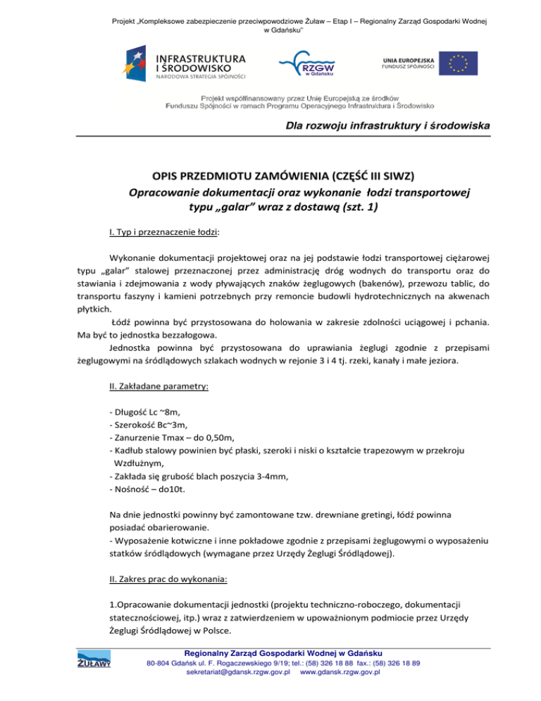 Projekt „Kompleksowe zabezpieczenie przeciwpowodziowe Żuław – Etap I – Regionalny Zarząd Gospodarki Wodnej w Gdańsku” Dla rozwoju infrastruktury i środowiska OPIS PRZEDMIOTU ZAMÓWIENIA (CZĘŚĆ III SIWZ) Opracowanie dokumentacji oraz wykonanie łodzi transportowej typu „galar” wraz z dostawą (szt. 1) I. Typ i przeznaczenie łodzi: Wykonanie dokumentacji projektowej oraz na jej podstawie łodzi transportowej ciężarowej typu „galar” stalowej przeznaczonej przez administrację dróg wodnych do transportu oraz do stawiania i zdejmowania z wody pływających znaków żeglugowych (bakenów), przewozu tablic, do transportu faszyny i kamieni potrzebnych przy remoncie budowli hydrotechnicznych na akwenach płytkich. Łódź powinna być przystosowana do holowania w zakresie zdolności uciągowej i pchania. Ma być to jednostka bezzałogowa. Jednostka powinna być przystosowana do uprawiania żeglugi zgodnie z przepisami żeglugowymi na śródlądowych szlakach wodnych w rejonie 3 i 4 tj. rzeki, kanały i małe jeziora. II. Zakładane parametry: - Długość Lc ~8m, - Szerokość Bc~3m, - Zanurzenie Tmax – do 0,50m, - Kadłub stalowy powinien być płaski, szeroki i niski o kształcie trapezowym w przekroju Wzdłużnym, - Zakłada się grubość blach poszycia 3-4mm, - Nośność – do10t. Na dnie jednostki powinny być zamontowane tzw. drewniane gretingi, łódź powinna posiadać obarierowanie. - Wyposażenie kotwiczne i inne pokładowe zgodnie z przepisami żeglugowymi o wyposażeniu statków śródlądowych (wymagane przez Urzędy Żeglugi Śródlądowej). II. Zakres prac do wykonania: 1.Opracowanie dokumentacji jednostki (projektu techniczno-roboczego, dokumentacji statecznościowej, itp.) wraz z zatwierdzeniem w upoważnionym podmiocie przez Urzędy Żeglugi Śródlądowej w Polsce. Regionalny Zarząd Gospodarki Wodnej w Gdańsku 80-804 Gdańsk ul. F. Rogaczewskiego 9/19; tel.: (58) 326 18 88 fax.: (58) 326 18 89 [email protected] www.gdansk.rzgw.gov.pl 2.Budowa jednostki z próbami na wodzie i z nadzorem inspektora upoważnionego podmiotu. Szczegółowe parametry łodzi powinny wynikać z dokumentacji technicznej. 3.Konserwacja-malowanie jednostki wg kolorystyki ustalonej przez RZGW Gdańsk. 4.Oznakowanie łodzi: nazwą NOGAT, nr rejestracyjnym, portem macierzystym MALBORK. 5.Wydanie końcowego dokumentu przez: -upoważniony podmiot – świadectwo, orzeczenie tzn. dokument z przeglądu technicznego stwierdzający, że statek spełnia wymagania bezpieczeństwa w zakresie budowy statku, jego stałych urządzeń, wyposażenia, właściwości manewrowych, itp. -Państwową Inspekcję Pracy tzn. orzeczenie o dopuszczeniu statku do eksploatacji pod względem b i hp. 6.Wystąpienie do UŻŚ Gdańsk o wydanie dokumentu bezpieczeństwa łodzi (statku) oraz na podstawie wydanego dokumentu uzupełnienie wyposażenia jednostki. 7.Transport wykonanej łodzi do Malborka na śluzę Rakowiec 6 i jej zwodowanie. Pozostałe uwarunkowania: 1. Przedmiot dostawy musi być trwale oznakowany zgodnie z zasadami obowiązującymi dla przedsięwzięć współfinansowanych z Funduszu Spójności w ramach Programu Operacyjnego Infrastruktura i Środowisko 2007-2013, określonymi m.in. w dokumencie „Zasady Promocji Projektów dla Beneficjentów Programu Operacyjnego Infrastruktura i Środowisko 2007-2013”. 2. Zgodnie z wytycznymi zawartymi w ww. dokumencie, przedmiot zamówienia powinien być oznakowany za pomocą tabliczek lub naklejek o charakterze trwałym, które zawierają: a) znak graficzny i logotyp Unii Europejskiej z podpisem: „Unia Europejska. Fundusz Spójności”, b) znak graficzny i logotyp Programu Operacyjnego „Infrastruktura i Środowisko 2007-2013”, c) znak graficzny i logotyp Beneficjenta – Regionalnego Zarządu Gospodarki Wodnej w Gdańsku, d) zapis: Zakup współfinansowany przez Unię Europejską ze środków Funduszu Spójności w ramach Programu Infrastruktura i Środowisko. 3. Dokładny sposób oznakowania (naklejka, tabliczka bądź grawer) zostanie w każdym z przypadków uzgodniony z Zamawiającym. 4. Zamawiający przekaże Wykonawcy niezbędne materiały potrzebne do sporządzenia oznakowania (w tym logotyp RZGW Gdańsk) oraz poda kolorystykę jednostki. 5. Przed przystąpieniem do oznakowania przedmiotu zamówienia Wykonawca przedstawi Zamawiającemu do akceptacji wizualizację tj. projekt graficzny (w formacie PDF i źródłowym) poszczególnych tabliczek/naklejek z naniesionymi logotypami/napisami wymaganymi przez Zamawiającego. 6. Rejestrację w UŻŚ z wydaniem dokumentu dokonuje Zamawiający, natomiast wydanie dokumentu bezpieczeństwa UŻŚ dokonuje Wykonawca z wnioskowaniem Zamawiającego. Regionalny Zarząd Gospodarki Wodnej w Gdańsku 80-804 Gdańsk ul. F. Rogaczewskiego 9/19; tel.: (58) 326 18 88 fax.: (58) 326 18 89 [email protected] www.gdansk.rzgw.gov.pl 2