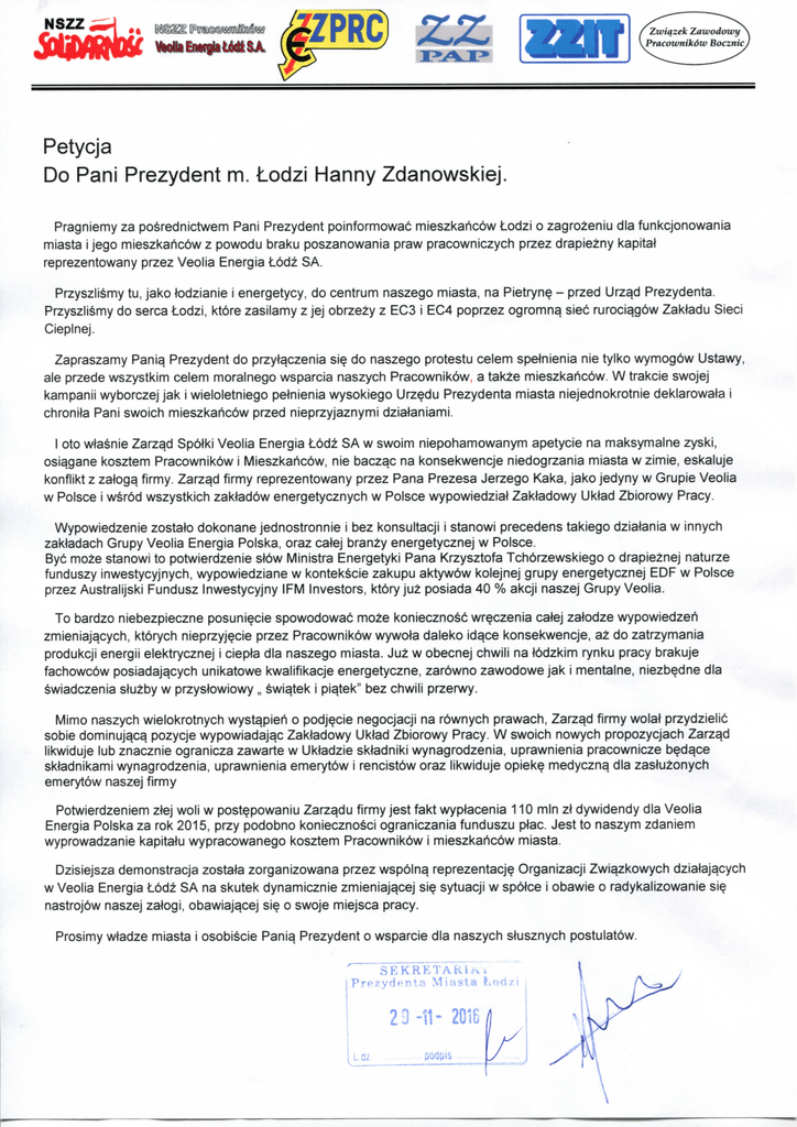 NSZZ f Zwiqzek Zawodoivy\ yPracoivnikdw Bocznic) ViNlaEiNrgiatMiSJL Petycja Do Pani Prezydent m. Lodzi Hanny Zdanowskiej. Pragniemy z a posrednictwem Pani Prezydent poinformowac mieszkaricow Lodzi o zagrozeniu dia funkcjonowania miasta i jego mieszkaricow z powodu braku poszanowania praw pracowniczych przez drapiezny kapitat reprezentowany przez Veolia Energia Lodz S A . Przyszlismy tu, jako todzianie i energetycy, do centrum naszego miasta, na Pietryn? - przed Urz^d Prezydenta. Przyszlismy do serca Lodzi, ktore zasilamy z jej obrzezy z E C 3 i E C 4 poprzez ogromn^ siec ruroci^gow ZaWadu Sieci Cieplnej. Zapraszamy P a n i ^ Prezydent do przyl^czenia s i ? do naszego protestu celem spelnienia nie tyiko wymogow Ustawy, ale przede wszystkim celem moralnego wsparcia naszych Pracownikow a takze mieszkaricow. W trakcie swojej kampanii wyborczej jak i wieloletniego petnienia wysokiego Urz^du Prezydenta miasta niejednokrotnie deklarowala i chronila Pani swoich mieszkaricow przed nieprzyjaznymi dzialaniami. I oto wlasnie Zarzad Spotki Veolia Energia Lodz S A w swoim niepohamowanym apetycie na maksymalne zyski, osiagane kosztem Pracownikow i Mieszkaricow, nie baczac na konsekwencje niedogrzania miasta w zimie, eskaluje konflikt z zatog^ firmy. Zarzqd firmy reprezentowany przez Pana P r e z e s a Jerzego Kaka, jako jedyny w Grupie Veolia w Polsce i wsr6d wszystkich zaWadow energetycznych w Polsce wypowiedzial ZaWadowy UWad Zbiorowy Pracy. Wypowiedzenie zostato dokonane jednostronnie i bez konsultacji i stanowi precedens takiego dziatania w innych zaWadach Grupy Veolia Energia Polska, oraz catej branzy energetycznej w Polsce. Bye moze stanowi to potwierdzenie slow Ministra Energetyki P a n a Krzysztofa Tchorzewskiego o drapieznej naturze funduszy inwestycyjnych, wypowiedziane w kontek^cie zakupu aktyw6w kolejnej grupy energetycznej E D F w Polsce przez Australijski Fundusz Inwestycyjny IFM Investors, ktory juz posiada 40 % akcji naszej Grupy Veolia. To bardzo niebezpieczne posuni^cie spowodowad moze koniecznoSc wr^czenia catej zatodze wypowiedzeri zmieniajqcych, ktorych nieprzyj^cie przez Pracownikow wywota daleko idqce konsekwencje, az do zatrzymania produkcji energii elektrycznej i ciep+a dIa naszego miasta. J u z w obecnej chwili na lodzkim rynku pracy brakuje fachowc6w posiadajqcych unikatowe kwalifikacje energetyczne, zar6wno zawodowe jak i mentalne, niezb^dne dIa swiadczenia sluzby w przystowiowy „ swi^tek i pi^tek" bez chwili przerwy. Mimo naszych wielokrotnych wyst^pieri o podj^cie negocjacji na rownych prawach, Zarzad firmy wolal przydzielic sobie dominuj^c^ pozycje wypowiadaj^c ZaWadowy Uktad Zbiorowy Pracy. W swoich nowych propozycjach Zarzad likwiduje lub znacznie ogranicza zawarte w Uktadzie skladniki wynagrodzenia, uprawnienia pracownicze b^d^ce sWadnikami wynagrodzenia, uprawnienia emerytow i rencistow oraz likwiduje opiek? medyczn^ dia zastuzonych emerytow naszej firmy Potwierdzeniem zlej woli w post^powaniu Zarzqdu firmy jest fakt wyplacenia 110 min z\y dIa Veolia Energia Polska z a rok 2015, przy podobno koniecznoSci ograniczania funduszu plac. J e s t to naszym zdaniem wyprowadzanie kapitalu wypracowanego kosztem Pracownikow i mieszkaricow miasta. Dzisiejsza demonstracja zostala zorganizowana przez wspoln^ reprezentacje Organizacji Zwiazkowych dzialaj^cych w Veolia Energia Lodz S A na skutek dynamicznie zmieniaj^cej s i ? sytuacji w spolce i obawie o radykalizowanie s i ? nastrojbw naszej zatogi, obawiaj^cej s i ? o swoje miejsca pracy. Prosimy wladze miasta i osobiScie P a n i ^ Prezydent o wsparcie dIa naszych stusznych postulatow. ' SEKRETAKl^ Prezydenta Miasta 2 0 -11- 2016 Ldz poacis