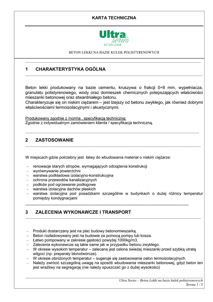 KARTA TECHNICZNA BETON LEKKI NA BAZIE KULEK POLISTYRENOWYCH __________________________________________________________________________________________________ 1 CHARAKTERYSTYKA OGÓLNA ___________________________________________________________________________________________________ Beton lekki produkowany na bazie cementu, kruszywa o frakcji 0÷8 mm, wypełniacza, granulatu polistyrenowego, wody oraz domieszek chemicznych polepszających właściwości mieszanki betonowej oraz stwardniałego betonu. Charakteryzuje się on niskim cięŜarem – jest lŜejszy od betonu zwykłego, jak równieŜ dobrymi właściwościami termoizolacyjnymi i akustycznymi. Produkowany zgodnie z /norma , specyfikacją techniczną: Zgodnie z indywidualnym zamówieniem klienta / specyfikacja techniczną. _________________________________________________________________________________________________ 2 ZASTOSOWANIE __________________________________________________________________________________________________ W miejscach gdzie potrzebny jest łatwy do wbudowania materiał o niskim cięŜarze: – – – – – – – renowacje starych stropów, wymagających odciąŜenia konstrukcji wyrównywanie powierzchni warstwa podkładowa izolacyjno-konstrukcyjna ochrona przewodów kanalizacyjnych podłoŜe pod ogrzewanie podłogowe warstwa izolacyjna dachów płaskich warstwa izolacyjna pod posadzkami szczególnie w budynkach o duŜej róŜnicy temperatur pomiędzy kondygnacjami ____________________________________________________________________________ 3 ZALECENIA WYKONAWCZE I TRANSPORT __________________________________________________________________________________________________ – – – – – – – Produkt dostarczany jest na plac budowy betonomieszarką. Beton rozładowywany jest na budowie za pomocą pompy lub kosza. Łatwo pompowany w zakresie gęstości powyŜej 1000kg/m3. Zalecenia wykonawcze są takie same jak w przypadku betonu zwykłego. W okresie wysokich temperatur – zalecana jest osłona świeŜej mieszanki przed szybką utratą wilgoci (np. preparaty błonotwórcze). W okresie obniŜonych temperatur – sugeruje się zastosowanie osłon termoizolacyjnych. NaleŜy zwrócić szczególną uwagę na sposób wbudowania mieszanki betonowej, gdyŜ beton ten jest wraŜliwy na segregację (nie naleŜy spuszczać go z duŜej wysokości) ___________________________________________________________________________________________________ Ultra Series – Beton Lekki na bazie kulek polistyrenowych Strona 1 / 3 KARTA TECHNICZNA BETON LEKKI NA BAZIE KULEK POLISTYRENOWYCH __________________________________________________________________________________________________ 4 CHARAKTERYSTYKA __________________________________________________________________________________ Lp. Parametr Wartość 1 Konsystencja na budowie mierzona opadem stoŜka /lub inna/ 6-25cm 2 Gęstość mieszanki <2600kg/m3 3 Zawartość powietrza >2% 4 Maksymalny czas zachowania urabialności 90 minut od wyprodukowania 5 Wytrzymałość na ściskanie 4-10 MPa 6 Gęstość w stanie suchym 900-1400 kg/m3 7 Współczynnik przewodnictwa cieplnego λ ≤ 0,350 [W/m·K] (dla gęstości 900 kg/m3) __________________________________________________________________________________________________ 5 KONTROLA JAKOŚCI PRODUKOWANEJ MIESZANKI __________________________________________________________________________________________________ Dostarczana mieszanka betonowa znajduje się pod stałą kontrolną laboratoryjną zarówno na węźle jak i w miejscu jej wbudowania. Podczas kontroli laborant sprawdza konsystencję, gęstość i temperaturę świeŜej mieszanki betonowej, a takŜe pobiera próbki do dalszych badań. __________________________________________________________________________________________________ 6 PIELĘGNACJA __________________________________________________________________________________________________ Pielęgnacja powinna przebiegać tak jak w przypadku betonu zwykłego. W okresie obniŜonych temperatur –sugeruje się zastosowanie osłon termoizolacyjnych. W okresie wysokich temperatur – zalecana jest osłona mieszanki betonowej przed szybka utrata wilgoci (np. preparaty błonotwórcze). ___________________________________________________________________________________________________ Ultra Series – Beton Lekki na bazie kulek polistyrenowych Strona 2 / 3 KARTA TECHNICZNA BETON LEKKI NA BAZIE KULEK POLISTYRENOWYCH _____________________________________________________________________________________________ 7 BEZPIECZEŃSTWO __________________________________________________________________________________________________ Produktu nie moŜna połykać i nie naleŜy go stosować w bezpośrednim kontakcie ze skórą pod groźbą wywołania alergii, wysypki lub oparzenia. Zaleca się zachowanie ostroŜności podczas stosowania produktu. W razie kontaktu betonu ze skórą i/lub oczami naleŜy przemyć obficie wodą i niezwłocznie skontaktować się z lekarzem. ___________________________________________________________________________________________________ Ultra Series – Beton Lekki na bazie kulek polistyrenowych Strona 3 / 3