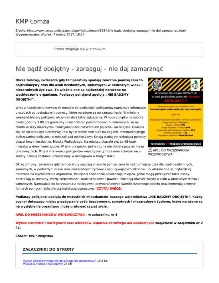 KMP Łomża Źródło: http://www.lomza.policja.gov.pl/po4/aktualnosci/5634,Nie-badz-obojetny-zareaguj-nie-daj-zamarznac.html Wygenerowano: Wtorek, 7 marca 2017, 19:14 Strona znajduje się w archiwum. Nie bądź obojętny – zareaguj – nie daj zamarznąć Okres zimowy, zwłaszcza gdy temperatury spadają znacznie poniżej zera to najtrudniejszy czas dla osób bezdomnych, samotnych, w podeszłym wieku i niezaradnych życiowo. To właśnie one są najbardziej narażone na wychłodzenie organizmu. Podlascy policjanci apelują „NIE BĄDŹMY OBOJĘTNI”. Wraz z nadejściem pierwszych mrozów do podlaskich policjantów napływają informacje o osobach potrzebujących pomocy, które narażone są na zamarznięcie. W miniony weekend bielscy policjanci otrzymali dwa takie zgłoszenia. W nocy z piątku na sobotę około godziny 3.00 przypadkowy przechodzień poinformował mundurowych, że na chodniku leży mężczyzna. Funkcjonariusze natychmiast pojechali na miejsce. Okazało się, że 50-latek był nietrzeźwy i nie był w stanie sam stać na nogach. Przemarzniętego bielszczanina policjanci przekazali pod opiekę żony. Koleją osobą potrzebującą pomocy okazał inny mieszkaniec Bielska Podlaskiego. Na miejscu okazało się, że 48-latek mieszka w drewnianej szopie. W tym przypadku jednak żona nie chciała przyjąć męża pod swój dach. Dzięki interwencji policjantów mężczyzna tymczasowo schronił się u siostry. Dzisiaj zostanie umieszczony w noclegowni w Białymstoku. APEL DO MIESZKAŃCÓW WOJEWÓDZTWA Okres zimowy, zwłaszcza gdy temperatury spadają znacznie poniżej zera to najtrudniejszy czas dla osób bezdomnych, samotnych, w podeszłym wieku oraz niezaradnych życiowo i nadużywających alkoholu. To właśnie one są najbardziej narażone na wychłodzenie organizmu. Policjanci codziennie odwiedzają miejsca, gdzie mogą przebywać takie osoby. Kontrolują pustostany, węzły ciepłownicze, klatki schodowe i piwnice. Składają również wizyty u osób w podeszłym wieku i samotnych. Namawiają do korzystania z noclegowni, przyparafialnych świetlic dziennego pobytu oraz informują o innych formach pomocy, jakie oferują instytucje pomocowe. (CZYTAJ WIĘCEJ) Podlascy policjanci apelują do wszystkich mieszkańców naszego województwa „NIE BĄDŹMY OBOJĘTNI”. Każdy sygnał dotyczący miejsc przebywania osób bezdomnych, samotnych i niezaradnych życiowo, które narażone są na wyziębienie organizmu może uratować czyjeś życie. APEL DO MIESZKAŃCÓW WOJEWÓDZTWA – w załączniku nr 1 Wykaz schronisk i noclegowni oraz ośrodków wsparcia doraźnego dla bezdomnych znajdziesz w załączniku nr 2 i 3. Źródło: KWP Białystok ZAŁĄCZNIKI DO STRONY Wykaz ośrodków wsparcia doraźnego dla bezdomnych 19.5 KB Wykaz schronisk i noclegowni 27 KB Ocena: 0/5 (0) Tweetnij