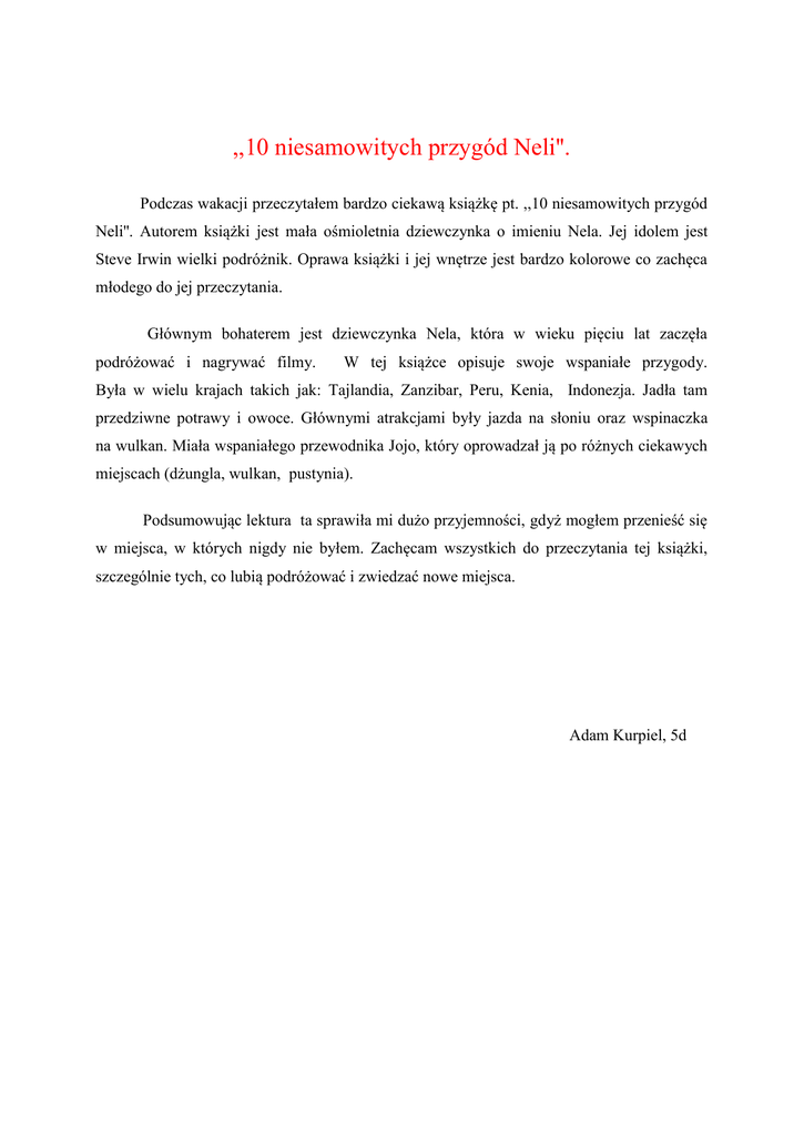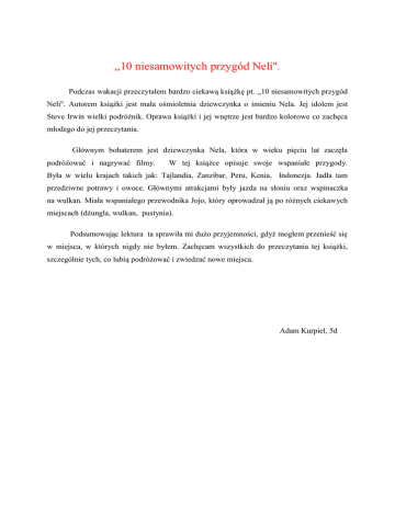 ,,10 niesamowitych przygód Neli''. Podczas wakacji przeczytałem bardzo ciekawą książkę pt. ,,10 niesamowitych przygód Neli''. Autorem książki jest mała ośmioletnia dziewczynka o imieniu Nela. Jej idolem jest Steve Irwin wielki podróżnik. Oprawa książki i jej wnętrze jest bardzo kolorowe co zachęca młodego do jej przeczytania. Głównym bohaterem jest dziewczynka Nela, która w wieku pięciu lat zaczęła podróżować i nagrywać filmy. W tej książce opisuje swoje wspaniałe przygody. Była w wielu krajach takich jak: Tajlandia, Zanzibar, Peru, Kenia, Indonezja. Jadła tam przedziwne potrawy i owoce. Głównymi atrakcjami były jazda na słoniu oraz wspinaczka na wulkan. Miała wspaniałego przewodnika Jojo, który oprowadzał ją po różnych ciekawych miejscach (dżungla, wulkan, pustynia). Podsumowując lektura ta sprawiła mi dużo przyjemności, gdyż mogłem przenieść się w miejsca, w których nigdy nie byłem. Zachęcam wszystkich do przeczytania tej książki, szczególnie tych, co lubią podróżować i zwiedzać nowe miejsca. Adam Kurpiel, 5d