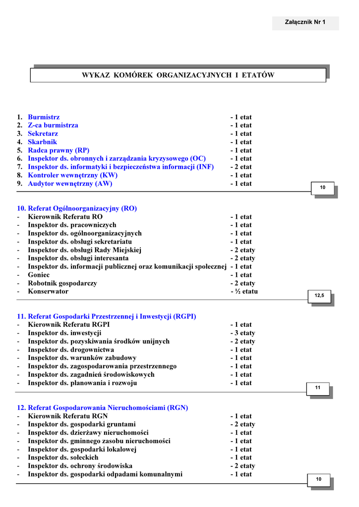 Załącznik Nr 1 WYKAZ KOMÓREK ORGANIZACYJNYCH I ETATÓW 1. 2. 3. 4. 5. 6. 7. 8. 9. Burmistrz Z-ca burmistrza Sekretarz Skarbnik Radca prawny (RP) Inspektor ds. obronnych i zarządzania kryzysowego (OC) Inspektor ds. informatyki i bezpieczeństwa informacji (INF) Kontroler wewnętrzny (KW) Audytor wewnętrzny (AW) - 1 etat - 1 etat - 1 etat - 1 etat - 1 etat - 1 etat - 2 etat - 1 etat - 1 etat 10. Referat Ogólnoorganizacyjny (RO) - Kierownik Referatu RO - Inspektor ds. pracowniczych - Inspektor ds. ogólnoorganizacyjnych - Inspektor ds. obsługi sekretariatu - Inspektor ds. obsługi Rady Miejskiej - Inspektor ds. obsługi interesanta - Inspektor ds. informacji publicznej oraz komunikacji społecznej - Goniec - Robotnik gospodarczy - Konserwator - 1 etat - 1 etat - 1 etat - 1 etat - 2 etaty - 2 etaty - 1 etat - 1 etat - 2 etaty - ½ etatu 11. Referat Gospodarki Przestrzennej i Inwestycji (RGPI) - Kierownik Referatu RGPI - Inspektor ds. inwestycji - Inspektor ds. pozyskiwania środków unijnych - Inspektor ds. drogownictwa - Inspektor ds. warunków zabudowy - Inspektor ds. zagospodarowania przestrzennego - Inspektor ds. zagadnień środowiskowych - Inspektor ds. planowania i rozwoju - 1 etat - 3 etaty - 2 etaty - 1 etat - 1 etat - 1 etat - 1 etat - 1 etat 12. Referat Gospodarowania Nieruchomościami (RGN) - Kierownik Referatu RGN - Inspektor ds. gospodarki gruntami - Inspektor ds. dzierżawy nieruchomości - Inspektor ds. gminnego zasobu nieruchomości - Inspektor ds. gospodarki lokalowej - Inspektor ds. sołeckich - Inspektor ds. ochrony środowiska - Inspektor ds. gospodarki odpadami komunalnymi - 1 etat - 2 etaty - 1 etat - 1 etat - 1 etat - 1 etat - 2 etaty - 1 etat 10 12,5 11 10 13. Referat Finansowo – Budżetowy (RF) - Kierownik Referatu RF - Inspektor ds. wymiaru podatkowego - Inspektor ds. księgowości należności niepodatkowych - Inspektor ds. obsługi kasy - Inspektor ds. płac i księgowości budżetowej - Inspektor ds. ewidencji dochodów i wydatków - Inspektor ds. księgowości podatkowej - Inspektor ds. finansowo-budżetowych - Inspektor ds. księgowości budżetowej - Inspektor ds. księgowości opłaty za gospodarowanie odpadami komunalnymi - 1 etat - 2 etaty - 1 etat - 1 etat - 1 etat - 2 etaty - 1 etat - 2 etaty - 1 etat - 1 etat 14. Referat Oświaty, Sportu, Kultury i Spraw Społecznych (ROSK) - Kierownik Referatu ROSK - Inspektor ds. oświaty, kultury i spraw społecznych - Inspektor ds. technicznych - Inspektor ds. promocji - Inspektor ds. współpracy z zagranicą - Inspektor ds. ewidencji gospodarczej - 1 etat - 2 etaty - 1 etat - 1 etat - 1 etat - 1 etat 15. Urząd Stanu Cywilnego - Kierownik USC - Z-ca Kierownika - Inspektor ds. ewidencji ludności - Inspektor ds. dowodów osobistych - 1 etat - 1 etat - 1 etat - 1 etat Razem etatów: 13 7 4 67,5 SCHEMAT ORGANIZACYJNY URZĘDU MIEJSKIEGO W BARLINKU RADCA PRAWNY REFERAT OŚWIATY, SPORTU, KULTURY I SPRAW SPOŁECZNYCH BURMISTRZ KIEROWNIK ROSK SKARBNIK RP INSPEKTOR DS. OBRONNYCH I ZARZĄDZANIA KRYZYSOWEGO OC INSPEKTOR DS. INFORMATYKI I BEZPIECZEŃSTWA INFORMACJI INF KONTROLER WEWNĘTRZNY KW AUDYTOR WEWNĘTRZNY AW SEKRETARZ ZASTĘPCA BURMISTRZA PEŁNOMOCNIK OCHRONY INFORMACJI NIEJAWNYCH USC KIEROWNIK USC REFERAT REFERAT REFERAT REFERAT FINANSOWO – BUDŻETOWY GOSPODARKI PRZESTRZENNEJ I INWESTYCJI GOSPODAROWANIA NIERUCHOMOŚCIAMI OGÓLNO – ORGANIZACYJNY KIEROWNIK RGPI KIEROWNIK RGN KIEROWNIK RF Z-CA KIEROWNIKA USC EWIDENCJA LUDNOŚCI KIEROWNIK RO DOWODY OSOBISTE