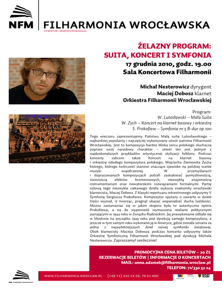 ŻELAZNY PROGRAM: SUITA, KONCERT I SYMFONIA 17 grudnia 2010, godz. 19.00 Sala Koncertowa Filharmonii Michał Nesterowicz dyrygent Maciej Dobosz klarnet Orkiestra Filharmonii Wrocławskiej Program: W. Lutosławski – Mała Suita W. Zych – Koncert na klarnet basowy i orkiestrę S. Prokofiew – Symfonia nr 5 B-dur op.100 Tego wieczoru zaprezentujemy Państwu Małą suitę Lutosławskiego – najbardziej popularny i najczęściej wykonywany utwór patrona Filharmonii Wrocławskiej. Jest to kompozycja bardzo bliska sercu polskiego słuchacza poprzez swój narodowy charakter – utwór ten jest jednym z najdoskonalszych przykładów artystycznej stylizacji folkloru. Podczas koncerty zabrzmi także Koncert na klarnet basowy i orkiestrę młodego kompozytora polskiego, Wojciecha Ziemowita Zycha którego, którego twórczość stanowi znaczące zjawisko na polskiej scenie muzyki współczesnej. W przemyślanych i dopracowanych kompozycjach potrafi zaskakiwać pomysłowością, świeżością efektów brzmieniowych, niezwykłą znajomością instrumentarium oraz nowatorskimi rozwiązaniami formalnymi. Partię solową tego niezwykle ciekawego dzieła wykona znakomity wrocławski klarnecista, Maciej Dobosz. Z klasyki repertuaru orkiestrowego usłyszymy V Symfonię Sergiusza Prokofiewa. Kompozytor spytany o zawarte w dziele treści wyznał, iż tworząc, pragnął ukazać wspaniałość ducha ludzkości. Można zastanawiać się w jakim stopniu była to autentyczna opinia Prokofiewa, a na ile wypowiedź wymuszona realiami politycznymi panującymi w 1944 roku w Związku Radzieckim. Jej prawykonanie odbyło się w Moskwie na początku 1945 roku pod dyrekcją samego kompozytora, a jeszcze w tym samym roku wykonano ją w Ameryce, gdzie została uznana za jedno z najwybitniejszych dzieł nowej symfoniki światowej. Obok klarnecisty Macieja Dobosza podczas koncertu usłyszymy także Orkiestrę Symfoniczną Filharmonii Wrocławskiej pod dyrekcją Michała Nesterowicza. Zapraszamy! serdecznie! PROMOCYJNA CENA BILETÓW – 20 ZŁ REZERWACJE BILETÓW | INFORMACJE O KONCERTACH MAIL: [email protected] TELEFON: 71/330 52 24