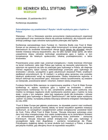 Poniedziałek, 22 października 2012 Konferencja obywatelska Dobrodziejstwo czy przekleństwo? Ryzyka i skutki wydobycia gazu z łupków w Polsce Warszawa – Dziś w Warszawie szerokie porozumienie międzynarodowych organizacji pozarządowych oraz naukowców zbierze się podczas konferencji, aby krytycznie ocenić ambicje polskiego rządu odnośnie wykorzystania potencjału złóż łupków. Konferencja warszawskiego biura Fundacji im. Heinricha Boella oraz Food & Water Europe po raz pierwszy po całym ciągu debat komercyjnych na temat gazu łupkowego skierowanych do środowisk biznesowych oferuje forum debaty dla obywateli, których kwestie inwestycji dotyczą bezpośrednio, aby nie tylko wyrazić swoje opinie, ale także uzasadnione obawy odnośnie technologii pozyskiwania gazu z łupków, w tym konsekwencje dla lokalnych społeczności, lokalnej przedsiębiorczości, a także środowiska. Prezentowane przez polski rząd, przemysł energetyczny i media branżowe informacje na temat możliwości, jakie daje Polsce gaz łupkowy są niezwykle optymistyczne. Ten optymizm nie ogranicza się tylko do potencjału gazu łupkowego w Polsce, ale obejmuje również negatywny wpływ rozwoju wielkoskalowego przemysłu gazu łupkowego na środowisko i zdrowie, szczególnie w gęsto zaludnionych obszarach Polski, wrażliwych siedliskach przyrodniczych, itp. W mediach i w polityce głosy sprzeciwu oraz postulaty lokalnych społeczności wciąż są marginalizowane. Obawy mieszkańców regionów, w których dokonuje się poszukiwań gazu, dotyczące metody szczelinowania, są uważane za niedojrzałe, powodowane lękiem i strachem, brakiem wiedzy eksperckiej. Fundacja Heinricha Bölla zaprasza na organizowaną wspólnie z Food & Water Europe konferencję nt. wpływu wydobycia gazu z łupków na środowisko i zdrowie. Organizowana konferencja ma na celu uwrażliwienie polskiej opinii publicznej oraz mediów na istniejące negatywne skutki wydobywania zasobów gazu z łupków na dużą skalę i ryzyka z tym związane. Jakie były negatywne skutki dla środowiska i zdrowia eksploatacji gazu łupkowego w Stanach Zjednoczonych? Jaki będzie wpływ wydobycia „łupków” na polską i europejską politykę dotyczącą wdrożenia energetyki niskowęglowej do roku 2050. “Food & Water Europe jest głęboko przekonane, że obywatele powinni mieć możliwość wypowiedzenia się podczas otwartej debaty na temat wszystkich aspektów inwestycji publicznych, ze szczególnym uwzględnieniem polityki energetycznej” powiedział Geert de Cock, Policy officer Food & Water Europe. “Decyzje dotyczące wybranego przez dany kraj miksu energetycznego zbyt często podejmowane są za zamkniętymi drzwiami i po skonsultowaniu jedynie bardzo ograniczonej liczby podmiotów – zazwyczaj branżowych. Decyzje dotyczące polityki energetycznej oraz gazu łupkowego w szczególności będą mieć długofalowe i wymierne konsekwencje dla Polski. Potrzebujemy dogłębnej debaty na temat skutków tych inwestycji w Polsce, a takowa jest jedynie możliwa, gdy oferujemy forum do wypowiedzi wszystkim.” “Gaz łupkowy jest przedstawiany jako jedyne możliwe rozwiązanie dla Polski, aby powiodła się transformacja energetyczna ku gospodarce niskowęglowej i energooszczędnej", dodała Monika Walencka, koordynatorka programu Energia i Klimat warszawskiego biura Fundacji im. Heinricha Bölla. „Przedstawicielstwo Fundacji w Polsce chce umożliwić otwartą debatę na temat tej inwestycji w Polsce, jednak ma to być przejrzysta debata, wsparta o opinie ekspertów z zakresu wpływu na klimat polityki energetycznej i poszczególnych źródeł energii. Chcemy poznać alternatywne scenariusze rozwoju Polski, z wyłączeniem rozwoju wielkoskalowych elektrowni zasilanych paliwami kopalnymi jednocześnie troszcząc się o polskie bezpieczeństwo energetyczne.” ###### Food & Water Europe dokłada w swojej pracy wszelkich starań, aby żywność, woda a także ryby, które konsumujemy były żywnością bezpieczną, dostępną a także produkowaną w sposób zrównoważony. Tak abyśmy mogli się nimi cieszyć tym co jemy i pijemy, oraz ufać, że jest bezpieczne. Kontakt: Geert De Cock tel. +32 (0)2 893 10 45, mobile +32 (0)484 629.491, gdecock(at)fweurope.org Fundacja im. Heinricha Boella w Polsce: prezentujemy zrównoważone, a więc długofalowe, scenariusze rozwoju sektora energetycznego w Europie i Polsce. Promujemy energie odnawialne jako najmniej szkodliwy dla człowieka i środowiska model pozyskiwania potrzebnej energii. Dostarczamy wiedzy w formie publikacji poradników oraz analiz. Wskazujemy na zagrożenia płynące z inwestycji w kosztowne i ryzykowne rozwiązania energetyki atomowej. Inicjujemy debaty na temat pozyskiwania gazu z łupków - nasze debaty toczą się wokół, jak na razie jedynej dostępnej, technologii pozyskiwania gazu z tego źródła - szczelinowania hydraulicznego. Kontakt: Marta Mendec, Tel. 501 787 697, [email protected] Monika Walencka tel.: 601611065 Fundacja im. Heinricha Boella