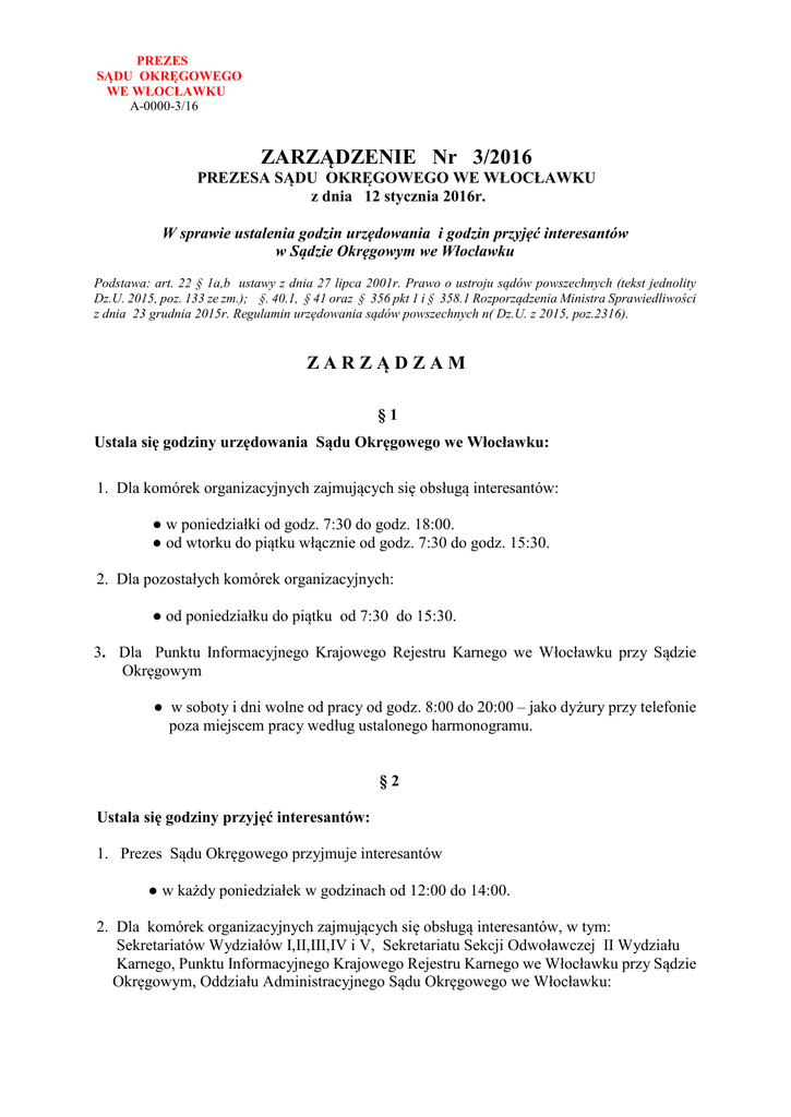PREZES SĄDU OKRĘGOWEGO WE WŁOCŁAWKU A-0000-3/16 ZARZĄDZENIE Nr 3/2016 PREZESA SĄDU OKRĘGOWEGO WE WŁOCŁAWKU z dnia 12 stycznia 2016r. W sprawie ustalenia godzin urzędowania i godzin przyjęć interesantów w Sądzie Okręgowym we Włocławku Podstawa: art. 22 § 1a,b ustawy z dnia 27 lipca 2001r. Prawo o ustroju sądów powszechnych (tekst jednolity Dz.U. 2015, poz. 133 ze zm.); §. 40.1, § 41 oraz § 356 pkt 1 i § 358.1 Rozporządzenia Ministra Sprawiedliwości z dnia 23 grudnia 2015r. Regulamin urzędowania sądów powszechnych n( Dz.U. z 2015, poz.2316). ZARZĄDZAM §1 Ustala się godziny urzędowania Sądu Okręgowego we Włocławku: 1. Dla komórek organizacyjnych zajmujących się obsługą interesantów: ● w poniedziałki od godz. 7:30 do godz. 18:00. ● od wtorku do piątku włącznie od godz. 7:30 do godz. 15:30. 2. Dla pozostałych komórek organizacyjnych: ● od poniedziałku do piątku od 7:30 do 15:30. 3. Dla Punktu Informacyjnego Krajowego Rejestru Karnego we Włocławku przy Sądzie Okręgowym ● w soboty i dni wolne od pracy od godz. 8:00 do 20:00 – jako dyżury przy telefonie poza miejscem pracy według ustalonego harmonogramu. §2 Ustala się godziny przyjęć interesantów: 1. Prezes Sądu Okręgowego przyjmuje interesantów ● w każdy poniedziałek w godzinach od 12:00 do 14:00. 2. Dla komórek organizacyjnych zajmujących się obsługą interesantów, w tym: Sekretariatów Wydziałów I,II,III,IV i V, Sekretariatu Sekcji Odwoławczej II Wydziału Karnego, Punktu Informacyjnego Krajowego Rejestru Karnego we Włocławku przy Sądzie Okręgowym, Oddziału Administracyjnego Sądu Okręgowego we Włocławku: ● w poniedziałki od godz. 9:00 do godz.18:00 (przyjmując, iż będzie to co najmniej 9 godzin w czasie urzędowania sądu). ● od wtorku do piątki włącznie od godz. 8:00 do godz.15:00 (przyjmując, iż będzie to co najmniej 7 godzin w czasie urzędowania sądu): 3. Dla Biura Obsługi Interesantów: ● w poniedziałki od 8:30 do 18:00 z przerwami od 11:00 do 11:15 i od 13:00 do 13:15 (przyjmując, iż będzie to co najmniej 9 godzin w czasie urzędowania sądu). ● od wtorku do piątku od 7:30 do 15:00 z przerwami od 11:00 do 11:15 i od 13:00 do 13:15. (przyjmując, iż będzie to co najmniej 7 godzin w czasie urzędowania sądu). §3 1. Kierownicy poszczególnych komórek organizacyjnych, zajmujących się obsługą interesantów prowadzą harmonogram wydłużonego czasu pracy ( w poniedziałki do godz. 18.00) ustalony dla podległych pracowników. 2. Wydłużony czas pracy w poniedziałki osoby wyznaczonej, zostaje zrównoważony krótszym dobowym czasem pracy do 5,5 godziny w piątki, w tygodniu bezpośrednio po poniedziałku i ta osoba będzie pracowała w piątek od godziny 7.30 do godz.13.00. 3. Zmienia się odpowiednio Ustalenia pkt 3 dla Punktu Informacyjnego Krajowego Rejestru Karnego we Włocławku przy Sądzie Okręgowym wprowadzone Zarządzeniem Nr 28/2008 Prezesa Sądu Okręgowego we Włocławku z dnia 4.07.2008r. 4. Zmienia się odpowiednio pkt 5 Regulaminu BOI w Sądzie Okręgowym we Włocławku, wprowadzonego Zarządzeniem Nr 71/2015 Prezesa Sądu Okręgowego we Włocławku z dnia 15.04.2015r. §4 Tracą moc Zarządzenia Prezesa Sądu Okręgowego we Włocławku: ● Nr 137/2015 z dnia 27 lipca 2015r. , ● Nr 143/2015 z dnia 10 sierpnia 2015r. ● Nr 194/2015 z dnia 23 września 2015r. §5 Niniejsze Zarządzenie obowiązuje z dniem 18 stycznia 2016r. JG/kp Do wiadomości: 1. Przewodniczący Wydziałów 2. Dyrektor Sądu 3. Kierownicy komórek organizacyjnych SO 4. Prezes Sądu Apelacyjnego w Gdańsku 5. Ministerstwo Sprawiedliwości 6. Strona Internetowa SO 7. Tablice informacyjne SO PREZES SĄDU OKRĘGOWEGO we Włocławku A. 0000-1 /16 Z A R Z Ą D Z E N I E Nr 1 /2016 Prezesa Sądu Okręgowego we Włocławku z dnia 12 stycznia 2016r. W sprawie zmiany Regulaminu Biura Obsługi Interesantów w Sądzie Okręgowym we Włocławku Podstawa: art.22 § 1 ust.a w związku z art. 8 ust.2 Ustawy z dnia 27 lipca 2001r. Prawo o ustroju sądów powszechnych (Dz.U. 2015,133 tekst jednolity ze zm.); § 28, § 70, § 97 i § 99 Rozporządzenia Ministra Sprawiedliwości z dnia 23 grudnia 2015r.Regulamin urzędowania sądów powszechnych (Dz.U. 2015,poz.2316); w związku z § 544a Zarządzenia Ministra Sprawiedliwości z dnia 12 grudnia 2003r. w sprawie organizacji i zakresu działania sekretariatów sądowych oraz innych działów administracji sądowej (Dz.Urz. MS. 2003,Nr 5,poz.22 ze zm.). W związku ze zmianą Rozporządzenia Ministra Sprawiedliwości z dnia 23 grudnia 2015r. Regulamin urzędowania sądów powszechnych (Dz.U. 2015,poz.2316); ZARZĄDZAM §1. W Regulaminie Biura Obsługi Interesantów Sądu Okręgowego we Włocławku, wprowadzonym Zarządzeniem Nr 71/2015 Prezesa Sądu Okręgowego we Włocławku z dnia 15 kwietnia 2015r.- wprowadza się następujące zmiany: Zmienia się w § 2 treść punktu 6 w ten sposób, że punkt 6 otrzymuje brzmienie: 6.„Pracownik BOI pod numerem telefonu wskazanym jako numer kontaktowy udziela telefonicznie bez ustalania tożsamości osób telefonujących następujących informacji jawnych o toczących się sprawach: ● tożsamych z udostępnianymi na wokandzie sądowej; w sytuacji przewidzianej w § 70 ust.4 powołanego powyżej Regulaminu urzędowania sądów powszechnych ujawnia się dane przeznaczone do zamieszczenia na wokandzie; § 70 ust.4 – „ Z uwagi na ochronę moralności, bezpieczeństwa państwa i porządku publicznego oraz ze względu na ochronę życia prywatnego lub inny ważny interes prawny, a szczególnie dobro małoletniego pokrzywdzonego przestępstwem, należy odstąpić od podania na wokandzie imion i nazwisk stron lub uczestników postępowania nieprocesowego lub wezwanych osób. W takiej sytuacji podaje się wyłącznie ich inicjały lub nie zamieszcza się żadnych danych identyfikujących te osoby”. ● o terminie i sposobie rozstrzygnięcia sprawy. W § 2 dodaj