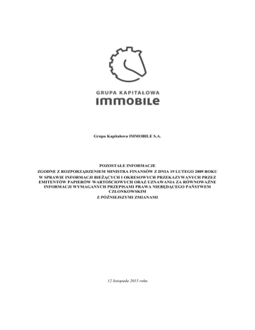Grupa Kapitałowa IMMOBILE S.A. POZOSTAŁE INFORMACJE ZGODNE Z ROZPORZĄDZENIEM MINISTRA FINANSÓW Z DNIA 19 LUTEGO 2009 ROKU W SPRAWIE INFORMACJI BIEŻĄCYCH I OKRESOWYCH PRZEKAZYWANYCH PRZEZ EMITENTÓW PAPIERÓW WARTOŚCIOWYCH ORAZ UZNAWANIA ZA RÓWNOWAŻNE INFORMACJI WYMAGANYCH PRZEPISAMI PRAWA NIEBĘDĄCEGO PAŃSTWEM CZŁONKOWSKIM Z PÓŹNIEJSZYMI ZMIANAMI 12 listopada 2015 roku Grupa Kapitałowa IMMOBILE S.A. Śródroczne sprawozdanie z działalności emitenta za okres 9 miesięcy zakończony dnia 30 września 2015 roku (w tysiącach PLN) Spis treści 1. Najważniejsze informacje ........................................................................................................................... 3 2. Komentarz Zarządu do osiągniętych wyników i działalności Spółki w okresie od 01.01.2015 do 30.09.2015 r. ............................................................................................................................................... 3 2.1. Charakterystyka sprzedaży............................................................................................................... 4 2.2. Wyniki finansowe ............................................................................................................................ 4 3. Opis organizacji Grupy Kapitałowej IMMOBILE, ze wskazaniem jednostek podlegających konsolidacji oraz wskazanie przyczyny i podstawy prawnej braku konsolidacji ...................................... 10 4. Wskazanie skutków zmian w strukturze jednostki gospodarczej, w tym w wyniku połączenia jednostek gospodarczych, przejęcia lub sprzedaży jednostek grupy, inwestycji długoterminowych, podziału, restrukturyzacji i zaniechania działalności ................................................................................ 12 5. Stanowisko Zarządu odnośnie możliwości zrealizowania wcześniej publikowanych prognoz wyników na dany rok w świetle wyników zaprezentowanych w raporcie kwartalnym w stosunku do wyników prognozowanych ....................................................................................................................................... 12 6. Struktura akcjonariatu – wykaz akcjonariuszy posiadających co najmniej 5% ogólnej liczby głosów na WZA na dzień 12.11.2015 r. (na podstawie informacji otrzymanych przez Spółkę zgodnie z Art. 69 ustawy o ofercie publicznej) ................................................................................................................. 13 7. Wykaz akcji lub uprawnień do nich (opcji) będących w posiadaniu grupy osób zarządzających i nadzorujących Spółkę wg stanu na dzień 12.11.2015 r. ............................................................................ 13 8. Postępowania toczące się przed sądem, organem właściwym dla postępowania arbitrażowego lub organem administracji publicznej ............................................................................................................. 14 9. Transakcje z podmiotami powiązanymi, jeżeli są one istotne i zostały zawarte na innych warunkach niż rynkowe ............................................................................................................................................... 15 10. Informacje o udzieleniu przez emitenta lub przez jednostkę od niego zależną poręczeń kredytu lub pożyczki lub udzieleniu gwarancji w okresie od 01.01.2015 do 30.09.2015 r., jeżeli łączna wartość istniejących poręczeń lub gwarancji stanowi równowartość co najmniej 10% kapitałów własnych Spółki. ....................................................................................................................................................... 15 11. Inne informacje, które w ocenie Spółki są istotne dla oceny jego sytuacji kadrowej, majątkowej, finansowej, wyniku finansowego i ich zmian oraz informacje, które są istotne dla oceny możliwości realizacji zobowiązań przez emitenta ........................................................................................................ 15 12. Czynniki, które w ocenie Spółki będą miały wpływ na osiągnięte przez nią wyniki w perspektywie co najmniej jednego kwartału ........................................................................................................................ 16 13. Informacje o niespłaceniu kredytu lub pożyczki lub naruszeniu istotnych postanowień umowy kredytu lub pożyczki, w odniesieniu do których nie podjęto żadnych działań naprawczych do końca okresu sprawozdawczego .......................................................................................................................... 17 2/17 Grupa Kapitałowa IMMOBILE S.A. Śródroczne sprawozdanie z działalności emitenta za okres 9 miesięcy zakończony dnia 30 września 2015 roku (w tysiącach PLN) 1. Najważniejsze informacje 1. Grupa Kapitałowa IMMOBILE S.A. osiąga przychody z najmu aktywów podmiotom z Grupy oraz świadczonych dla nich usług holdingowych, takich jak zarządzanie kadrami, pozyskiwanie finansowania, wsparcie sprawozdawczości finansowej, controlling, wsparcie biznesu, obsługa administracyjna, marketingowa, prawna i inne. 2. Spółka sprzedała do Swojej spółki zależnej HALIFAX P Sp. z o.o. przedsiębiorstwo Stocznia Pomerania w Szczecinie za kwotę 20 mln PLN ponosząc stratę w wysokości 158 tys. PLN. W rachunku zysków i strat transakcja ta została zaprezentowana wynikowo. 3. GK IMMOBILE S.A. dokonała podwyższenia kapitału zakładowego w NOBLES Sp. z o.o. o kwotę 1,5 mln PLN. Środki z tego tytułu zostały przeznaczone przez NOBLES na zakup nieruchomości, na którą docelowo zostanie przeniesiony Zakład Produkcyjny MAKRUM Sp. z o.o. z ul. Leśnej w Bydgoszczy. 4. GK IMMOBILE S.A w okresie objętym sprawozdaniem dokonała sprzedaży 793 533 sztuk akcji własnych osiągając zysk na transakcji w wysokości 607 tys. PLN. Zysk ten nie został ujęty w rachunku zysków 
