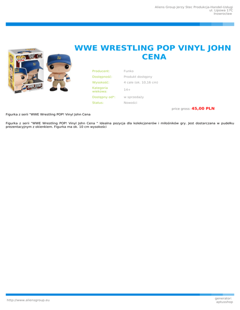 Aliens Group Jerzy Stec Produkcja-Handel-Usługi ul. Lipowa 17C Inowrocław WWE WRESTLING POP VINYL JOHN CENA Producent: Funko Dostępność: Produkt dostępny Wysokość: 4 cale (ok. 10,16 cm) Kategoria wiekowa: 14+ Dostępny od*: w sprzedaży Status: Nowości price gross: 45,00 PLN Figurka z serii "WWE Wrestling POP! Vinyl John Cena Figurka z serii "WWE Wrestling POP! Vinyl John Cena " Idealna pozycja dla kolekcjonerów i miłośników gry. Jest dostarczana w pudełku prezentacyjnym z okienkiem. Figurka ma ok. 10 cm wysokości http://www.aliensgroup.eu generator: aptusshop