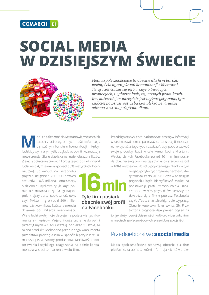 SOCIAL MEDIA W DZISIEJSZYM ŚWIECIE Media społecznościowe to obecnie dla firm bardzo ważny i elastyczny kanał komunikacji z klientami. Tutaj zamieszcza się informacje o bieżących promocjach, wydarzeniach, czy nowych produktach. Im skuteczniej to narzędzie jest wykorzystywane, tym szybciej powstaje potrzeba kompleksowej analizy odzewu ze strony użytkowników. M edia społecznościowe stanowią w ostatnich Przedsiębiorstwa chcą nadzorować przepływ informacji latach źródło ogromnych ilości informacji, w sieci na swój temat, ponieważ coraz więcej firm zaczy- są ważnym kanałem komunikacji między- na korzystać z tego typu rozwiązań, aby popularyzować ludzkiej, wymiany myśli, poglądów, opinii, wyznaczają swoje produkty, bądź w celu komunikacji z klientami. nowe trendy. Skalę zjawiska najlepiej obrazują liczby. Według danych Facebooka ponad 16 mln firm posia- Z sieci społecznościowych korzysta już ponad miliard da obecnie swój profil na tej stronie, co stanowi wzrost ludzi na całym świecie (ponad 50% wszystkich Inter- o 100% w stosunku do roku poprzedniego. Warto w tym nautów). Co minutę na Facebooku pojawia się ponad 700 000 nowych statusów i 0,5 miliona komentarzy, a dziennie użytkownicy „lajkują” ponad 4,5 miliarda razy. Drugi najpopularniejszy portal społecznościowy, 16 mln czyli Twitter – gromadzi 500 milionów użytkowników, którzy generują dziennie pół miliarda wiadomości. Tyle firm posiada obecnie swój profil na Facebooku miejscu przytoczyć prognozę Gartnera, który zakłada, że do 2015 r. ludzie w co drugim przypadku będą identyfikować markę na podstawie jej profilu w social media. Oznacza to, że w 50% przypadków pierwszy raz dowiedzą się o firmie poprzez Facebooka czy YouTube, a nie telewizję, radio czy prasę. Obecnie współczynnik ten wynosi 5%. Przytoczona prognoza daje pewien pogląd na Wielu ludzi podejmuje decyzje na podstawie tych ko- to, jak duży rozwój działalności i odbioru wizerunku firm mentarzy i wpisów. Mają oni duże zaufanie do opinii w mediach społecznościowych przewidują specjaliści. przeczytanych w sieci, uważają, poniekąd słusznie, że ocena produktu dokonana przez innego konsumenta przedstawi prawdę o nim w sposób lepszy niż rekla- Przedsiębiorstwo a social media ma czy opis ze strony producenta. Możliwość monitorowania i szybkiego reagowania na opinie konsu- Media społecznościowe stanowią obecnie dla firm mentów w sieci to marzenie wielu firm. platformę, za pomocą której informują klientów o bie- żących promocjach, wydarzeniach, czy nowych pro- wizerunek marki może zostać uruchomiona w stosunku duktach. w przedsiębiorstwach tworzone są stanowi- do grupy użytkowników, którzy są najbardziej sceptyczni. ska pracy, na których głównym zadaniem jest obsługa profilu firmy na Facebooku lub Twitterze. Pokazuje to, Inna użyteczna funkcjonalność narzędzi do analizy so- jak dużą wagę przykłada się do tego typu kanałów in- cial media to opcja śledzenia poszczególnych użytkow- formacyjnych. Czym innym jest jednak zamieszczanie ników i komentarzy, wraz z sortowaniem ich według nowych informacji, a czym innym analiza odzewu ze określonych kryteriów. Niektóre aplikacje, między innymi strony użytkowników. Często ze względu na bardzo Comarch Social Intelligence, automatycznie oceniają dużą liczbę komentarzy i wątków, ilość osób i czasu wydźwięk każdej opinii i komentarza napisanego przez potrzebnego do takiej analizy jest o wiele większa, niż użytkownika, zapisując wynik w postaci analiz. w ramach do samego moderowania profilu w mediach społecz- doraźnego poprawiania relacji z klientami pracownicy fir- nościowych. Fanpage firmowy stanowi platformę, na my mogą wyszukiwać najbardziej negatywne opinie i na której pojawiają się informacje o marce, poszczegól- nie odpowiadać. Z kolei najzaciętszych krytyków marki nych produktach, kampaniach marketingowych czy warto próbować przeciągnąć na swoją stronę. Już samo sprzedażowych, a także o nowościach wypuszczanych zainteresowanie się firmy wpisem takiej osoby bardzo na rynek. Z drugiej strony użytkownicy dostarczają duże pozytywnie wpływa na odbiór i postrzeganie marki przez ilości informacji zwrotnej, komentując poszczególne odbiorcę. wpisy. Tworzy się w ten sposób duży i skomplikowany zestaw danych, który niesie ze sobą szereg informacji. Obecnie dostępne są już na rynku narzędzia, które pozwalają analizować te dane, dostarczając firmom wymiernych korzyści. Źródła danych dla takich systemów mogą być różne: od serwisów społecznościowych typu Facebook, poprzez blogi, fora, mikroblogi jak Twitter, aż po ankiety i kwestionariusze. Wobec natłoku informacji pojawiających się w sieci, automatyzacja analizy treści Firmy dostrzegły w końcu, jak wielkie korzyści przynosi wykorzystanie Internetu (…). Z pewnością będą więc generować coraz większy popyt, stawiać nowe wymagania. daje przedsiębiorstwu potężne narzędzie oraz pozwala Oprócz obserwowania opinii klientów w kwestiach bar- zaoszczędzić czas i pieniądze. dziej ogólnych, jak zdanie na temat firmy czy wybranej marki, specjaliści od PR śledzą także reakcje na konkretne Analiza przypadku wydarzenia. Do takich wydarzeń należy na przykład nowa kampania reklamowa, wypuszczenie na rynek kolejnego produktu, albo wprowadzenie nowego typu promocji. Analiza rozpoczyna się od zbierania informacji na te- Należy pamiętać, że właśnie w mediach społecznościo- mat profili samych wypowiadających się osób. Możemy wych uzyskamy najszybciej informację zwrotną na temat sprawdzić, do jakiego przedziału wiekowego należą odbioru nowego wydarzenia przez klientów. Co więcej, osoby najczęściej wypowiadające się, czy to kobiety, czy za pomocą forów oraz portali społecznościowych opinie mężczyźni. Oprócz samej ilości wypowiedzi możemy zo- j