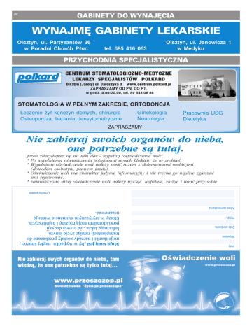 22 GABINETY DO WYNAJÊCIA WYNAJMÊ GABINETY LEKARSKIE Olsztyn, ul. Partyzantów 36 w Poradni Chorób P³uc tel. 695 416 063 Olsztyn, ul. Janowicza 1 w Medyku PRZYCHODNIA SPECJALISTYCZNA CENTRUM STOMATOLOGICZNO-MEDYCZNE LEKARZY SPECJALISTÓW POLKARD Olsztyn (Jaroty) ul. Jaroszyka 3 www.centrum.polkard.pl ZAPRASZAMY OD PN. DO PT. w godz. 8.00-20.00, tel. 89 543 06 86 STOMATOLOGIA W PE£NYM ZAKRESIE, ORTODONCJA Leczenie ¿y³ koñczyn dolnych, chirurgia Osteoporoza, badania densytometryczne Ginekologia Neurologia Pracownia USG Dietetyka ZAPRASZAMY Nie zabieraj swoich organów do nieba, one potrzebne s¹ tutaj. Je¿eli zdecydujesz siê na taki dar - wype³nij "owiadczenie woli". * Po wype³nieniu owiadczenia poinformuj swoich bliskich, ¿e to zrobi³e. * Wype³nione owiadczenie woli nale¿y nosiæ razem z dokumentami osobistymi (dowodem osobistym, prawem jazdy). * Owiadczenie woli ma charakter jedynie informacyjny i nie trzeba go nigdzie zg³aszaæ ani rejestrowaæ. * zamieszczone ni¿ej owiadczenie woli nale¿y wyci¹æ, wype³niæ, z³o¿yæ i nosiæ przy sobie