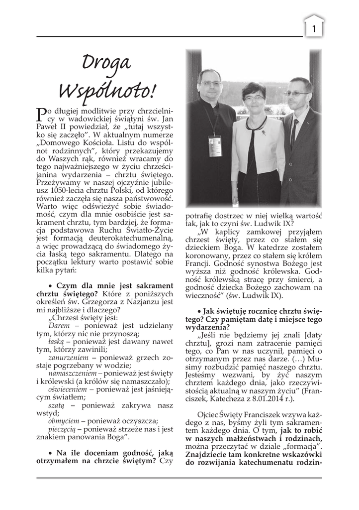 1 Droga Wspólnoto! o długiej modlitwie przy chrzcielnicy w wadowickiej świątyni św. Jan P Paweł II powiedział, że „tutaj wszyst- ko się zaczęło”. W aktualnym numerze „Domowego Kościoła. Listu do wspólnot rodzinnych”, który przekazujemy do Waszych rąk, również wracamy do tego najważniejszego w życiu chrześcijanina wydarzenia – chrztu świętego. Przeżywamy w naszej ojczyźnie jubileusz 1050-lecia chrztu Polski, od którego również zaczęła się nasza państwowość. Warto więc odświeżyć sobie świadomość, czym dla mnie osobiście jest sakrament chrztu, tym bardziej, że formacja podstawowa Ruchu Światło-Życie jest formacją deuterokatechumenalną, a więc prowadzącą do świadomego życia łaską tego sakramentu. Dlatego na początku lektury warto postawić sobie kilka pytań: • Czym dla mnie jest sakrament chrztu świętego? Które z poniższych określeń św. Grzegorza z Nazjanzu jest mi najbliższe i dlaczego? „Chrzest święty jest: Darem – ponieważ jest udzielany tym, którzy nic nie przynoszą; łaską – ponieważ jest dawany nawet tym, którzy zawinili; zanurzeniem – ponieważ grzech zostaje pogrzebany w wodzie; namaszczeniem – ponieważ jest święty i królewski (a królów się namaszczało); oświeceniem – ponieważ jest jaśniejącym światłem; szatą – ponieważ zakrywa nasz wstyd; obmyciem – ponieważ oczyszcza; pieczęcią – ponieważ strzeże nas i jest znakiem panowania Boga”. • Na ile doceniam godność, jaką otrzymałem na chrzcie świętym? Czy potrafię dostrzec w niej wielką wartość tak, jak to czyni św. Ludwik IX? „W kaplicy zamkowej przyjąłem chrzest święty, przez co stałem się dzieckiem Boga. W katedrze zostałem koronowany, przez co stałem się królem Francji. Godność synostwa Bożego jest wyższa niż godność królewska. Godność królewską stracę przy śmierci, a godność dziecka Bożego zachowam na wieczność” (św. Ludwik IX). • Jak świętuję rocznicę chrztu świętego? Czy pamiętam datę i miejsce tego wydarzenia? „Jeśli nie będziemy jej znali [daty chrztu], grozi nam zatracenie pamięci tego, co Pan w nas uczynił, pamięci o otrzymanym przez nas darze. (…) Musimy rozbudzić pamięć naszego chrztu. Jesteśmy wezwani, by żyć naszym chrztem każdego dnia, jako rzeczywistością aktualną w naszym życiu” (Franciszek, Katecheza z 8.01.2014 r.). Ojciec Święty Franciszek wzywa każdego z nas, byśmy żyli tym sakramentem każdego dnia. O tym, jak to robić w naszych małżeństwach i rodzinach, można przeczytać w dziale „formacja”. Znajdziecie tam konkretne wskazówki do rozwijania katechumenatu rodzin- 2 nego oraz zatroszczenia się o formację rodziców i rodziców chrzestnych przynoszących dziecko do sakramentu chrztu świętego. Tematykę sakramentu chrztu świętego podejmujemy w jubileuszowym czasie. Tegoroczne Triduum Paschalne ze swoim szczytem Wigilią Paschalną ma być tym szczególnym momentem, kiedy każdy z nas osobiście odnowi swoje przyrzeczenia chrzcielne. Będzie to zarazem szczytowy moment obchodów jubileuszu 1050-lecia w każdej naszej parafii. Z radością więc zaangażujmy się w przygotowanie i przeżywanie tej liturgii. Uroczystości ogólnopolskie dla wszystkich wiernych odbędą się 16 kwietnia na stadionie miejskim w Poznaniu. Chcemy jako cała wspólnota odpowiedzieć na zaproszenie pasterzy Kościoła, dlatego po wielu rozmowach z małżeństwami odpowiedzialnymi postanowiliśmy, by w tym wyjątkowym roku pielgrzymować jako Domowy Kościół do Poznania zamiast tradycyjnie do Kalisza. Wszystkich chętnych do udziału w tym wydarzeniu zapraszamy do kontaktu ze swoją parą diecezjalną, a o szczegółach wydarzeń związanych z 1050. rocznicą chrztu Polski można przeczytać na stronie: http://chrzest966. pl/ Niech oczekiwaniu na to wydarzenie towarzyszy specjalna modlitwa, której tekst znajduje się poniżej. Drugim ważnym tematem w „Liście”, na który pragniemy zwrócić uwagę, są rekolekcje. Tegoroczne styczniowe spotkanie odpowiedzialnych w Skorzeszycach w głównej mierze było poświęcone temu istotnemu elementowi naszej formacji. Poprzez spotkania w grupach oraz konferencję odkrywaliśmy po raz kolejny charyzmat oazy rekolekcyjnej. Spoglądaliśmy przede wszystkim na to, co pozostawił nam Założyciel, dlatego słowo „wierność” było jednym z częściej powtarzanych – wierność słowom Założyciela, wierność charyzmatowi, który pozostawił, wierność w wizji celu i drogi rekolekcji, wierność… Zachęcając każdego z członków Domowego Kościoła do wierności, zapraszamy do przeczytania konferencji „Znaczenie rekolekcji w formacji Domowego Kościoła”. Ufamy, że dzięki tej refleksji rekolekcjom, które są przed nami, będzie towarzyszyła wierność… – nie sobie, ale słowom Założyciela. Dopełnieniem zawartości „Listu” jest jak zwykle relacja z bardzo wielu wydarzeń z diecezji, świadectwa oraz „znaki czasu”, w których nie mogło zabraknąć jakże aktualnego tematu synodu o misji i powołaniu rodziny w Kościele i w świecie współczesnym – tym razem refleksja dotyczy relacji końcowej, wypracowanej przez ojców synodalnych. Na pewno na czas Wielkiego Postu, Triduum Paschalnego i 50 dni radości paschalnej dobrej lektury nam nie zabraknie J Modlitwa jubileuszowa 1050. rocznicy chrztu Polski Boże nasz Ojcze, w roku jubileuszu Chrztu Polski dziękujemy za łaskę wiary, za Twoje wejście w dzieje każdego z nas i naszej Ojczyzny, za łaskę, która nam nieustannie towarzyszy. Jezu Chryste, Synu Boży, Ty jesteś Panem i Zbawicielem każdego z nas. Pragniemy i prosimy, abyś kierował całym naszym życiem osobistym, rodzinnym i społecznym. Duchu Święty, źródło życia i miłości, wołamy o Twoje dary i charyzmaty, abyśmy mogli poznawać Prawdę, kochać Kościół, służyć braciom i siostrom miłością ofiarną i odważnie głosić 