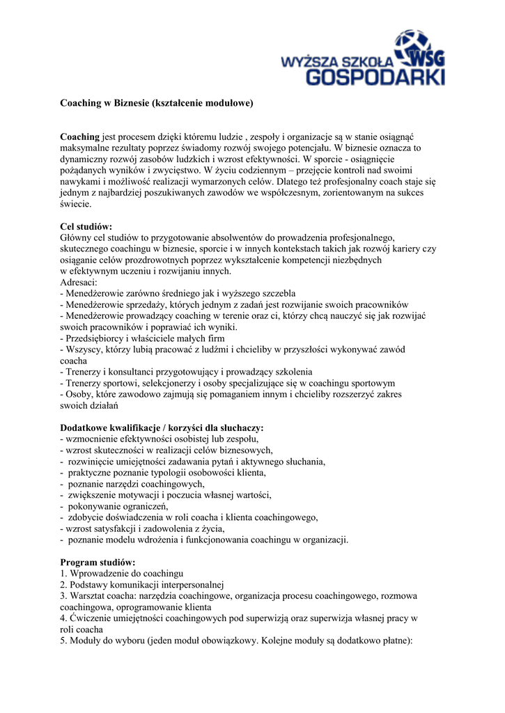 Coaching w Biznesie (kształcenie modułowe) Coaching jest procesem dzięki któremu ludzie , zespoły i organizacje są w stanie osiągnąć maksymalne rezultaty poprzez świadomy rozwój swojego potencjału. W biznesie oznacza to dynamiczny rozwój zasobów ludzkich i wzrost efektywności. W sporcie - osiągnięcie pożądanych wyników i zwycięstwo. W życiu codziennym – przejęcie kontroli nad swoimi nawykami i możliwość realizacji wymarzonych celów. Dlatego też profesjonalny coach staje się jednym z najbardziej poszukiwanych zawodów we współczesnym, zorientowanym na sukces świecie. Cel studiów: Główny cel studiów to przygotowanie absolwentów do prowadzenia profesjonalnego, skutecznego coachingu w biznesie, sporcie i w innych kontekstach takich jak rozwój kariery czy osiąganie celów prozdrowotnych poprzez wykształcenie kompetencji niezbędnych w efektywnym uczeniu i rozwijaniu innych. Adresaci: - Menedżerowie zarówno średniego jak i wyższego szczebla - Menedżerowie sprzedaży, których jednym z zadań jest rozwijanie swoich pracowników - Menedżerowie prowadzący coaching w terenie oraz ci, którzy chcą nauczyć się jak rozwijać swoich pracowników i poprawiać ich wyniki. - Przedsiębiorcy i właściciele małych firm - Wszyscy, którzy lubią pracować z ludźmi i chcieliby w przyszłości wykonywać zawód coacha - Trenerzy i konsultanci przygotowujący i prowadzący szkolenia - Trenerzy sportowi, selekcjonerzy i osoby specjalizujące się w coachingu sportowym - Osoby, które zawodowo zajmują się pomaganiem innym i chcieliby rozszerzyć zakres swoich działań Dodatkowe kwalifikacje / korzyści dla słuchaczy: - wzmocnienie efektywności osobistej lub zespołu, - wzrost skuteczności w realizacji celów biznesowych, - rozwinięcie umiejętności zadawania pytań i aktywnego słuchania, - praktyczne poznanie typologii osobowości klienta, - poznanie narzędzi coachingowych, - zwiększenie motywacji i poczucia własnej wartości, - pokonywanie ograniczeń, - zdobycie doświadczenia w roli coacha i klienta coachingowego, - wzrost satysfakcji i zadowolenia z życia, - poznanie modelu wdrożenia i funkcjonowania coachingu w organizacji. Program studiów: 1. Wprowadzenie do coachingu 2. Podstawy komunikacji interpersonalnej 3. Warsztat coacha: narzędzia coachingowe, organizacja procesu coachingowego, rozmowa coachingowa, oprogramowanie klienta 4. Ćwiczenie umiejętności coachingowych pod superwizją oraz superwizja własnej pracy w roli coacha 5. Moduły do wyboru (jeden moduł obowiązkowy. Kolejne moduły są dodatkowo płatne): Moduł I: rozwój osobisty: - trening asertywności - trening antystresowy - racjonalna terapia zachowań Moduł II: rozwój umiejętności liderskich - trening myślenia strategicznego - trening rozwiazywania sytuacji trudnych w organizacji - wykorzystanie coachingu jako narzędzia kierowania organizacją Moduł III: rozwój umiejętności trenerskich: - analiza potrzeb szkoleniowych - przygotowanie szkolenia i praca z grupą z wykorzystaniem coachingu Moduł IV: współpraca w grupie: - trening kreatywności - podnoszenie efektywności działania organizacji - budowanie pozytywnych relacji w grupie 6. Warsztat menadżera: menadżer jako coach 7. Coaching kariery Forma zaliczenia: Czas trwania studiów: 2 semestry Liczba godzin: 180 Cena: Kierunek studiów podyplomowych Opłata jednorazowa 1 rata Coaching w Biznesie (kształcenie modułowe) 4 000 zł Wysokość jednej raty w systemie 2-ratalnym 2 000 zł