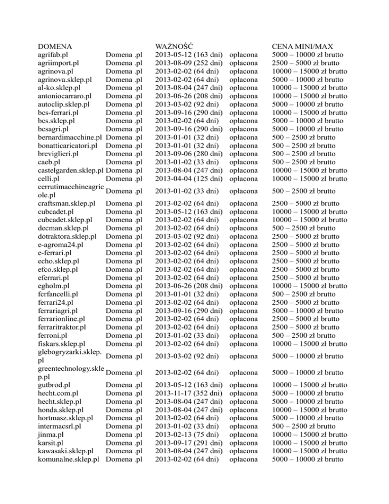 DOMENA agrifab.pl Domena .pl agriimport.pl Domena .pl agrinova.pl Domena .pl agrinova.sklep.pl Domena .pl al-ko.sklep.pl Domena .pl antoniocarraro.pl Domena .pl autoclip.sklep.pl Domena .pl bcs-ferrari.pl Domena .pl bcs.sklep.pl Domena .pl bcsagri.pl Domena .pl bernardimacchine.pl Domena .pl bonatticaricatori.pl Domena .pl breviglieri.pl Domena .pl caeb.pl Domena .pl castelgarden.sklep.pl Domena .pl celli.pl Domena .pl cerrutimacchineagric Domena .pl ole.pl craftsman.sklep.pl Domena .pl cubcadet.pl Domena .pl cubcadet.sklep.pl Domena .pl decman.sklep.pl Domena .pl dotraktora.sklep.pl Domena .pl e-agroma24.pl Domena .pl e-ferrari.pl Domena .pl echo.sklep.pl Domena .pl efco.sklep.pl Domena .pl eferrari.pl Domena .pl egholm.pl Domena .pl fcrfancelli.pl Domena .pl ferrari24.pl Domena .pl ferrariagri.pl Domena .pl ferrarionline.pl Domena .pl ferraritraktor.pl Domena .pl ferroni.pl Domena .pl fiskars.sklep.pl Domena .pl glebogryzarki.sklep. Domena .pl pl greentechnology.skle Domena .pl p.pl gutbrod.pl Domena .pl hecht.com.pl Domena .pl hecht.sklep.pl Domena .pl honda.sklep.pl Domena .pl hortmasz.sklep.pl Domena .pl intermacsrl.pl Domena .pl jinma.pl Domena .pl karsit.pl Domena .pl kawasaki.sklep.pl Domena .pl komunalne.sklep.pl Domena .pl WAŻNOŚĆ 2013-05-12 (163 dni) 2013-08-09 (252 dni) 2013-02-02 (64 dni) 2013-02-02 (64 dni) 2013-08-04 (247 dni) 2013-06-26 (208 dni) 2013-03-02 (92 dni) 2013-09-16 (290 dni) 2013-02-02 (64 dni) 2013-09-16 (290 dni) 2013-01-01 (32 dni) 2013-01-01 (32 dni) 2013-09-06 (280 dni) 2013-01-02 (33 dni) 2013-08-04 (247 dni) 2013-04-04 (125 dni) opłacona opłacona opłacona opłacona opłacona opłacona opłacona opłacona opłacona opłacona opłacona opłacona opłacona opłacona opłacona opłacona CENA MINI/MAX 5000 – 10000 zł brutto 2500 – 5000 zł brutto 10000 – 15000 zł brutto 5000 – 10000 zł brutto 10000 – 15000 zł brutto 10000 – 15000 zł brutto 5000 – 10000 zł brutto 10000 – 15000 zł brutto 5000 – 10000 zł brutto 5000 – 10000 zł brutto 500 – 2500 zł brutto 500 – 2500 zł brutto 500 – 2500 zł brutto 500 – 2500 zł brutto 10000 – 15000 zł brutto 10000 – 15000 zł brutto 2013-01-02 (33 dni) opłacona 500 – 2500 zł brutto 2013-02-02 (64 dni) 2013-05-12 (163 dni) 2013-02-02 (64 dni) 2013-02-02 (64 dni) 2013-03-02 (92 dni) 2013-02-02 (64 dni) 2013-02-02 (64 dni) 2013-02-02 (64 dni) 2013-02-02 (64 dni) 2013-02-02 (64 dni) 2013-06-26 (208 dni) 2013-01-01 (32 dni) 2013-02-02 (64 dni) 2013-09-16 (290 dni) 2013-02-02 (64 dni) 2013-02-02 (64 dni) 2013-01-02 (33 dni) 2013-02-02 (64 dni) opłacona opłacona opłacona opłacona opłacona opłacona opłacona opłacona opłacona opłacona opłacona opłacona opłacona opłacona opłacona opłacona opłacona opłacona 2500 – 5000 zł brutto 10000 – 15000 zł brutto 10000 – 15000 zł brutto 500 – 2500 zł brutto 2500 – 5000 zł brutto 2500 – 5000 zł brutto 2500 – 5000 zł brutto 2500 – 5000 zł brutto 2500 – 5000 zł brutto 2500 – 5000 zł brutto 10000 – 15000 zł brutto 500 – 2500 zł brutto 2500 – 5000 zł brutto 5000 – 10000 zł brutto 2500 – 5000 zł brutto 2500 – 5000 zł brutto 500 – 2500 zł brutto 10000 – 15000 zł brutto 2013-03-02 (92 dni) opłacona 5000 – 10000 zł brutto 2013-02-02 (64 dni) opłacona 5000 – 10000 zł brutto 2013-05-12 (163 dni) 2013-11-17 (352 dni) 2013-08-04 (247 dni) 2013-08-04 (247 dni) 2013-02-02 (64 dni) 2013-01-02 (33 dni) 2013-02-13 (75 dni) 2013-09-17 (291 dni) 2013-08-04 (247 dni) 2013-02-02 (64 dni) opłacona opłacona opłacona opłacona opłacona opłacona opłacona opłacona opłacona opłacona 10000 – 15000 zł brutto 5000 – 10000 zł brutto 5000 – 10000 zł brutto 10000 – 15000 zł brutto 5000 – 10000 zł brutto 500 – 2500 zł brutto 10000 – 15000 zł brutto 10000 – 15000 zł brutto 10000 – 15000 zł brutto 5000 – 10000 zł brutto kosiarki-24.pl Domena .pl kosiarki-online.pl Domena .pl krysiak.sklep.pl Domena .pl kubota.sklep.pl Domena .pl lawnflite.pl Domena .pl limpar.pl Domena .pl limpar.sklep.pl Domena .pl lipco.com.pl Domena .pl lipco.sklep.pl Domena .pl lstractor.pl Domena .pl mahindra.com.pl Domena .pl marolex.sklep.pl Domena .pl matev.pl Domena .pl morselliemaccaferri. Domena .pl pl motogarden.pl Domena .pl mowertech.pl Domena .pl mtd.sklep.pl Domena .pl muratori.pl Domena .pl murray.pl Domena .pl murray.sklep.pl Domena .pl nac.sklep.pl Domena .pl odkurzacze-doDomena .pl lisci.pl odsniezarki.sklep.pl Domena .pl oleo-mac.sklep.pl Domena .pl opryskiwacze.sklep.p Domena .pl l peruzzo.pl Domena .pl ransomes-jacobsen.plDomena .pl ransomesjacobsen.pl Domena .pl 2013-03-02 (92 dni) 2013-03-02 (92 dni) 2013-02-02 (64 dni) 2013-08-04 (247 dni) 2013-09-11 (285 dni) 2013-02-19 (81 dni) 2013-02-02 (64 dni) 2013-04-08 (129 dni) 2013-02-02 (64 dni) 2013-01-02 (33 dni) 2013-01-02 (33 dni) 2013-02-02 (64 dni) 2013-09-11 (285 dni) opłacona opłacona opłacona opłacona opłacona opłacona opłacona opłacona opłacona opłacona opłacona opłacona opłacona 2500 – 5000 zł brutto 2500 – 5000 zł brutto 2500 – 5000 zł brutto 10000 – 15000 zł brutto 5000 – 10000 zł brutto 10000 – 15000 zł brutto 5000 – 10000 zł brutto 5000 – 10000 zł brutto 5000 – 10000 zł brutto 10000 – 15000 zł brutto 10000 – 15000 zł brutto 5000 – 10000 zł brutto 5000 – 10000 zł brutto 2013-01-01 (32 dni) opłacona 500 – 2500 zł brutto 2013-05-11 (162 dni) 2013-05-13 (164 dni) 2013-08-04 (247 dni) 2013-01-01 (32 dni) 2013-02-23 (85 dni) 2013-08-04 (247 dni) 2013-08-04 (247 dni) opłacona opłacona opłacona opłacona opłacona opłacona opłacona 2500 – 5000 zł brutto 5000 – 10000 zł brutto 10000 – 15000 zł brutto 10000 – 15000 zł brutto 10000 – 15000 zł brutto 10000 – 15000 zł brutto 10000 – 15000 zł brutto 2013-03-02 (92 dni) opłacona 5000 – 10000 zł brutto 2013-02-02 (64 dni) opłacona 2013-08-04 (247 dni) opłacona 5000 – 10000 zł brutto 2013-03-