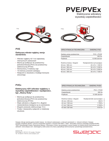 PVE/PVEx Elektryczne wibratory wysokiej częstotliwości PVE Elektryczny wibrator wgłębny, wersja standardowa. • Wibrator wgłębny 42 V do najbardziej intensywnych zastosowań • Można go podłączyć do przetwornicy jednotwornikowej (PVC) lub przetwornicy elektronicznej (PVCE) • Wzmocniony, 5-metrowy wąż • 10-metrowy przewód zasilający • Wyłącznik w obudowie z trwałego tworzywa sztucznego. PVEx Elektryczny 42V wibrator wgłębny o wysokiej częstotliwości i wydajności, typ „Heavy Duty”. • Można go podłączyć do przetwornicy jednotwornikowej (PVC) lub przetwornicy elektronicznej (PVCE) • Węże wibratora o długości 5 m, długości niestandardowe dostępne są na zamówienie • Długość przewodu elektrycznego 15 m • Trwały i niezawodny wyłącznik w metalowej obudowie. PVEx SPECYFIKACJA TECHNICZNA Zasilany przez przetwornice SWEPAC PVE PVC + PVCE Częstotliwość 200 Hz Prędkość 12 000 obr/min Średnica buławy / długość Wydajność/siła wymuszająca 38 mm / 369 mm 20 m3/h / 1 500 N 50 mm / 363 mm 30 m3/h / 3 300 N 58 mm / 430 mm 35 m3/h / 5 600 N 65 mm / 395 mm 40 m3/h / 7 000 N SPECYFIKACJA TECHNICZNA Zasilany przez przetwornice Częstotliwość Prędkość SWEPAC PVEX PVC + PVCE 200 Hz 12 000 obr/min Średnica buławy / długość Wydajność/siła wymuszająca 35 mm / 283 mm 802 N 42 mm / 335 mm 1 750 N 51 mm / 294 mm 2 330 N 57 mm / 337 mm 4 517 N Swepac oferuje szeroką gamę modeli maszyn do różnych zastosowań, w różnych rozmiarach i z różnymi silnikami. Swepac posiada certyfikaty jakości i ochrony środowiska zgodnie z normami ISO 9001 i 14001. Wszystkie maszyny posiadają certyfikat EURO TEST Szwedzkiego Urzędu Testowania Maszyn. Informacje o firmie i jej produktach można znaleźć na naszej stronie internetowej pod adresem: www.swepac.com. Zastrzegamy sobie prawo do zmiany specyfikacji technicznej bez uprzedniego powiadomienia. Swepac AB Blockvägen 3 | SE-341 32 Ljungby | Sweden Tel +46 (0)372-156 00 | www.swepac.com PVE/PVEx_2015-09_PL PVE