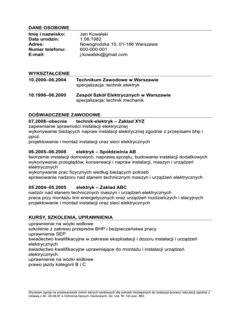 DANE OSOBOWE Imię i nazwisko: Data urodzin: Adres: Numer telefonu: E-mail: WYKSZTAŁCENIE 10.2000–06.2004 10.1996–06.2000 Jan Kowalski 1.08.1982 Nowogrodzka 15, 01-186 Warszawa 600-000-001 [email protected] Technikum Zawodowe w Warszawie specjalizacja: technik elektryk Zespół Szkół Elektrycznych w Warszawie specjalizacja: technik mechanik DOŚWIADCZENIE ZAWODOWE 07.2008–obecnie technik-elektryk – Zakład XYZ zapewnianie sprawności instalacji elektrycznej wykonywanie bieŜących napraw instalacji elektrycznej zgodnie z przepisami bhp i ppoŜ. projektowanie i montaŜ instalacji oraz sieci elektrycznych 06.2005–06.2008 elektryk – Spółdzielnia AB tworzenie instalacji domowych, naprawa sprzętu, budowanie instalacji dodatkowych wykonywanie przeglądów, konserwacji i napraw instalacji, maszyn i urządzeń elektrycznych wykonywanie prac fizycznych według bieŜących potrzeb sprawowanie nadzoru nad stanem technicznym maszyn i urządzeń elektrycznych 05.2004–05.2005 elektryk – Zakład ABC nadzór nad stanem technicznych maszyn i urządzeń elektrycznych praca przy montaŜu linii energetycznych oraz urządzeń rozdzielczych i stacyjnych projektowanie i montaŜ instalacji oraz sieci elektrycznych KURSY, SZKOLENIA, UPRAWNIENIA uprawnienie na wózki widłowe szkolenie z zakresu przepisów BHP i bezpieczeństwa pracy uprawnienia SEP świadectwo kwalifikacyjne w zakresie eksploatacji i dozoru instalacji i urządzeń elektrycznych świadectwo kwalifikacyjne uprawniające do montaŜu i instalacji urządzeń elektrycznych uprawnienie na wózki widłowe prawo jazdy kategorii B i C WyraŜam zgodę na przetwarzanie moich danych osobowych dla potrzeb niezbędnych do realizacji procesu rekrutacji zgodnie z Ustawą z dn. 29.08.97 o Ochronie Danych Osobowych, Dz. Ust. Nr 133 poz. 883. DODATKOWE INFORMACJE Umiejętności znajomość nowoczesnych metod produkcji części do samochodów osobowych zmysł techniczny i zdolności manualne umiejętność dobrej organizacji pracy Języki obce komunikatywna znajomość języka niemieckiego Zainteresowania muzyka elektroniczna, wędkarstwo WyraŜam zgodę na przetwarzanie moich danych osobowych dla potrzeb niezbędnych do realizacji procesu rekrutacji zgodnie z Ustawą z dn. 29.08.97 o Ochronie Danych Osobowych, Dz. Ust. Nr 133 poz. 883.