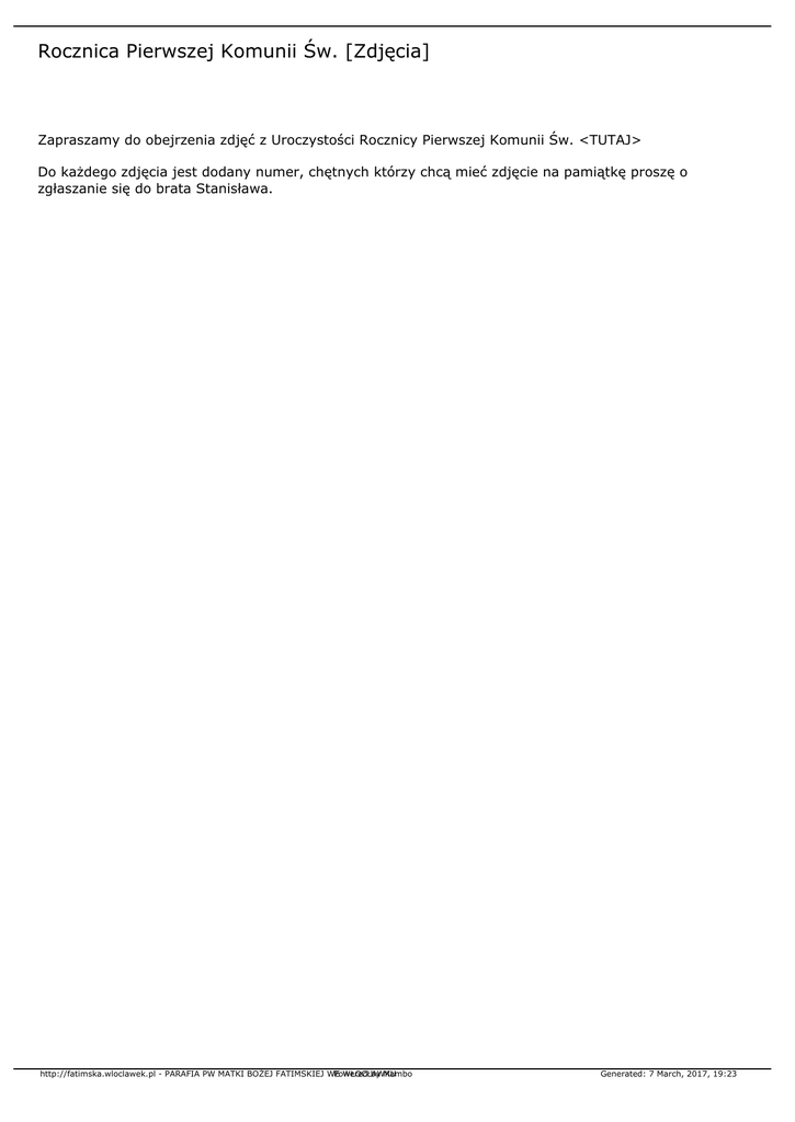 Rocznica Pierwszej Komunii Św. [Zdjęcia] Zapraszamy do obejrzenia zdjęć z Uroczystości Rocznicy Pierwszej Komunii Św. <TUTAJ> Do każdego zdjęcia jest dodany numer, chętnych którzy chcą mieć zdjęcie na pamiątkę proszę o zgłaszanie się do brata Stanisława. http://fatimska.wloclawek.pl - PARAFIA PW MATKI BOŻEJ FATIMSKIEJ WE Powered WŁOCŁAWKU by Mambo Generated: 7 March, 2017, 19:23