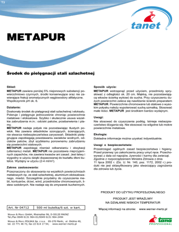 T3 metapur Środek do pielęgnacji stali szlachetnej Skład: METAPUR zawiera poniżej 5% niejonowych substancji powierzchniowo czynnych, środki konserwujące oraz nie zawierające frakcji aromatycznych węglowodory alifatyczne. Współczynnik pH ok. 6. Działanie: Doskonały środek do pielęgnacji stali szlachetnej i eloksalu. Poleruje i pielęgnuje jednocześnie chroniąc powierzchnie metalowe i eloksalowe. Szybko i skutecznie usuwa wszelkie zabrudzenia m.in.: odciski palców, przebarwienia i plamy. METAPUR nadaje połysk nie pozostawiając tłustych powłok. Nie zawiera składników szorujących, ścierających, nie stwarza niebezpieczeństwa zarysowań. Składniki pielęgnujące zapobiegają powstawaniu zacieków wodnych, odcisków palców, zbyt szybkiemu ponownemu zabrudzeniu się powierzchni stalowych. METAPUR zapobiega również odbarwianiu i oksykacji (utlenianiu) metali. METAPUR nie pozostawia nieprzyjemnych zapachów, nie zawiera kwasów ani zasad. Jest łatwy i wygodny w użyciu dzięki dopasowanej do kształtu dłoni butelce. Wydajny w użyciu (2-4 ml/m2). Zakres zastosowania: Przeznaczony do stosowania na wszelkich powierzchniach metalowych np. ze stali szlachetnej, aluminium eloksalowanego, miedzi. Szczególnie przydatny do czyszczenia mebli, kontuarów, drzwi, wind, przedmiotów chromowanych, listew ozdobnych. Nie nadaje się do zmywarek kuchennych. Sposób użycia: METAPUR wstrząsnąć przed użyciem, przedmioty spryskiwać z odległości ok. 20 cm. Miękką, nie pozostawiającą włosów ścierką wytrzeć do sucha. Przy czyszczeniu dużych powierzchni zaleca się nawilżanie ścierek preparatem METAPUR. Powierzchnie chromowane lub stalowe o wysokim połysku należy wypolerować suchą szmatką. Stosować małe ilości. METAPUR jest środkiem bardzo wydajnym. Uwagi: Nie stosować do czyszczenia podłóg. Istnieje niebezpieczeństwo ślizgania się. Nie stosować na wilgotne lub mokre powierzchnie metalowe. Ekologia: Dokładne informacje można uzyskać indywidualnie. Uwagi o bezpieczeństwie: Przestrzegać ogólnych zasad bezpieczeństwa i higieny. Przed przerwą i po zakończeniu pracy umyć ręce. Przechowywać z dala od napojów, żywności i karmy dla zwierząt. Zgodnie z rozporządzeniem Ministra Zdrowia z dnia 11 lipca 2002 r. (Dz. U. Nr. 140, poz. 1172, 2002 r.) produkt nie jest sklasyfikowany jako stwarzający zagrożenia dla zdrowia lub życia. Produkt do użytku profesjonalnego pRODUKT JEST WRAŻLIWY NA DZIAŁANIE NISKICH TEMPERATUR Art. Nr 04712 500 ml butelka/6 szt. w kart. Werner & Mertz GmbH, Rheinallee 96, D-55120 MAINZ Tel./Fax 0049 6131 964-01/0049 6131 964-2494 Werner & Mertz POLSKA Sp. z o.o. 05-270 Marki, ul. Okólna 40, tel. 22 771 46 72, fax 22 614 17 54; www.werner-mertz.pl Więcej informacji na stronie: www.werner-mertz.pl