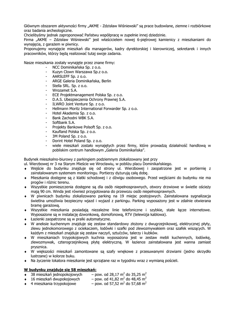 Głównym obszarem aktywności firmy „AKME - Zdzisław Wiśniewski” są prace budowlane, ziemne i rozbiórkowe oraz badania archeologiczne. Chcielibyśmy jednak zaproponować Państwu współpracę w zupełnie innej dziedzinie. Firma „AKME – Zdzisław Wiśniewski” jest właścicielem nowej 6-piętrowej kamienicy z mieszkaniami do wynajęcia, z garażem w piwnicy. Proponujemy wynajęcie mieszkań dla managerów, kadry dyrektorskiej i kierowniczej, sekretarek i innych pracowników, którzy będą realizować tutaj swoje zadania. Nasze mieszkania zostały wynajęte przez znane firmy: - NCC Dominikańska Sp. z o.o. - Kuzyn Clown Warszawa Sp.z o.o. - AARSLEFF Sp. z o.o. - ARGE Galeria Dominikańska, Berlin - Stella SRL. Sp. z o.o. - Wrozamet S.A. - ECE Projektmanagement Polska Sp. z o.o. - D.A.S. Ubezpieczenia Ochrony Prawnej S.A. - ILWRO Joint Venture Sp. z o.o. - Hellmann Moritz International Forwarder Sp. z o.o. - Hotel Akademia Sp. z o.o. - Bank Zachodni WBK S.A. - Softbank S.A. - Projekty Bankowe Polsoft Sp. z o.o. - Kaufland Polska Sp. z o.o. - 3M Poland Sp. z o.o. - Dorint Hotel Poland Sp. z o.o. - wiele mieszkań zostało wynajętych przez firmy, które prowadzą działalność handlową w pobliskim centrum handlowym „Galeria Dominikańska”. Budynek mieszkalno-biurowy z parkingiem podziemnym zlokalizowany jest przy ul. Wierzbowej nr 3 na Starym Mieście we Wrocławiu, w pobliżu placu Dominikańskiego. ♦ Wejście do budynku znajduje się od strony ul. Wierzbowej i zaopatrzone jest w portiernię z zainstalowanym systemem monitoringu. Portierzy dyżurują całą dobę. ♦ Mieszkania dostępne są z klatki schodowej i z dźwigu osobowego. Przed wejściami do budynku nie ma progów i różnic terenu. ♦ Wszystkie pomieszczenia dostępne są dla osób niepełnosprawnych, otwory drzwiowe w świetle ościeży mają 90 cm. Winda jest również przygotowana do przewozu osób niepełnosprawnych. ♦ W piwnicach budynku zlokalizowano parking na 19 miejsc postojowych. Zainstalowana sygnalizacja świetlna umożliwia bezpieczny wjazd i wyjazd z parkingu. Parking wyposażony jest w zdalnie otwierana bramę garażową. ♦ Wszystkie mieszkania posiadają niezależne linie telefoniczne i szybkie, stałe łącze internetowe. Wyposażone są w instalację dzwonkową, domofonową, RTV (telewizja kablowa). ♦ Łazienki zaopatrzone są w pralki automatyczne. ♦ W aneksie kuchennym znajduje się zestaw standardowy złożony z dwugrzejnikowej, elektrycznej płyty, zlewu jednokomorowego z ociekaczem, lodówki i szafki pod zlewozmywakiem oraz szafek wiszących. W każdym z mieszkań znajduje się zestaw naczyń, sztućców, talerzy i kubków. ♦ W mieszkaniach trzypokojowych kuchnia wyposażona jest w zestaw mebli kuchennych, lodówkę, zlewozmywak, czterogrzejnikową płytę elektryczną. W łazience zainstalowana jest wanna zamiast prysznica. ♦ W większości mieszkań zamontowane są szafy wnękowe z przesuwanymi drzwiami (jedno skrzydło lustrzane) w kolorze buku. ♦ Na życzenie lokatora mieszkanie jest sprzątane raz w tygodniu wraz z wymianą pościeli. W budynku znajduje się 58 mieszkań: ♦ 38 mieszkań jednopokojowych – pow. od 28,17 m2 do 35,25 m2 ♦ 16 mieszkań dwupokojowych – pow. od 41,82 m2 do 48,45 m2 ♦ 4 mieszkania trzypokojowe – pow. od 57,52 m2 do 57,68 m2