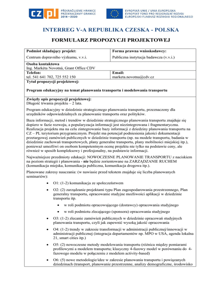INTERREG V-A REPUBLIKA CZESKA - POLSKA FORMULARZ PROPOZYCJI PROJEKTOWEJ Podmiot składający projekt: Forma prawna wnioskodawcy: Centrum dopravního výzkumu, v.v.i. Publiczna instytucja badawcza (v.v.i.) Osoba kontaktowa Ing. Markéta Novotná, Grant Office CDV Telefon: tel. 541 641 702, 725 552 150 Tytuł propozycji projektowej: Email: [email protected] Program edukacyjny na temat planowania transportu i modelowania transportu Zwięzły opis propozycji projektowej: Długość trwania projektu – 2 lata. Program edukacyjny w dziedzinie strategicznego planowania transportu, przeznaczony dla urzędników odpowiedzialnych za planowanie transportu oraz polityków. Baza informacji, metod i trendów w dziedzinie strategicznego planowania transportu znajduje się dopiero w fazie rozwoju, a popularyzacja informacji jest niezintegrowana i fragmentaryczna. Realizacja projektu ma na celu zintegrowanie bazy informacji z dziedziny planowania transportu na CZ – PL terytorium przygranicznym. Projekt ma potencjał podniesienia jakości dokumentacji przetargowej zamówień publicznych w dziedzinie transportu (np. na modele transportu, badania w dziedzinie zachowań transportowych, plany generalne transportu, plany mobilności miejskiej itp.), ponieważ umożliwi on osobom kompetentnym ocenę projektu nie tylko na podstawie ceny, ale również w sposób kompleksowy i profesjonalny, na podstawie informacji. Najważniejsze przedmioty edukacji: NOWOCZESNE PLANOWANIE TRANSPORTU z naciskiem na poziom strategii i planowania - nie będzie zorientowane na ZARZĄDZANIE RUCHEM (komunikacja miejska, komunikacja publiczna, komunikacja drogowa itp.). Planowane zakresy nauczania: (w nawiasie przed tekstem znajduje się liczba planowanych seminariów): O1: (1-2) komunikacja ze społeczeństwem O2: (2) zarządzanie projektami typu Plan zagospodarowania przestrzennego, Plan generalny transportu, opracowanie studyjne możliwości aplikacji w dziedzinie transportu itp. w roli podmiotu opracowującego (dostawcy) opracowania studyjnego w roli podmiotu zlecającego (sponsora) opracowania studyjnego O3: (1-2) zlecanie zamówień publicznych w dziedzinie opracowań studyjnych planowania transportu, czyli jak zapewnić wysoką jakość opracowania O4: (1-2) trendy w zakresie transformacji w administracji publicznej/innowacji w administracji publicznej (integracja departamentów np. MPO w USA, agenda lokalna 21, smart cities itp.) O5: (2) nowoczesne metody modelowania transportu (różnica między pomiarami profilowymi a modelem transportu; klasyczny 4-fazowy model w porównaniu do 4fazowego modelu w połączeniu z modelem activity-based) O6: (5) nowe metodologie/idee w zakresie planowania transportu i powiązanych dziedzinach (transport, planowanie przestrzenne, analizy demograficzne, środowisko naturalne, polityka regionalna, rozwój i urban economy) O7: (2) źródła danych do modelowania transportu i planowania transportu (dane prymarne – badania; dane sekundarne (inne instytucje) i dane tercjarne (modele); dane powszechnie dostępne) W sumie 14 do 17 seminariów. Forma nauczania: seminaria/warsztaty (cały dzień; pół dnia) wycieczki do instytucji i miast → przykłady dobrej praktyki strona internetowa + materiały fachowe + zapis video/audio z seminariów i wycieczek Grupę docelową stanowią urzędnicy samorządów i miast powiatowych, którzy zajmują się transportem i jego rozwojem strategicznym. Ponadto wójtowie lub inni zarządcy samorządów lokalnych, ponieważ kwestie transportu często stanowią temat silnie uwarunkowany politycznie; seminaria w ramach projektu zapewnią argumenty dla zrównoważonego rozwoju infrastruktury transportowej i stanowić będą narzędzia obiektywnej oceny działań. Miejsce realizacji projektu: PL i CZ Partner: Uniwersytet lub instytucja badawcza po stronie polskiej Zakładany zasięg współpracy z partnerem zagranicznym: Zakładany jest równomierny podział działań między obu partnerów, w zależności od doświadczeń w poszczególnych dziedzinach. Cel i produkty projektu: Długotrwałym celem projektu jest umożliwienie osobom kompetentnym podejmowanie świadomych, opartych na informacjach decyzji w zakresie kwestii strategicznych dotyczących transportu. Celem jest również zbudowanie efektywnej administracji publicznej poprzez zwiększenie poziomu informacji i jakości usług świadczonych w interesie publicznym. Kolejnym celem jest zunifikowanie bazy informacji wiedzy w regionach przygranicznych RCz i PL, co umożliwi zrównoważenie ich rozwoju w dziedzinie transportu i przyczyni się do poprawy spójności społecznej i terytorialnej regionu. Jednym z celów projektu jest również poprawa jakości współpracy między regionami przygranicznymi w dziedzinie transportu oraz wymiana know-how, zwłaszcza poprzez realizację wycieczek, mających na celu zapoznanie się z przykładami dobrych praktyk i nawiązanie kontaktów między osobami kompetentnymi, za pośrednictwem wspólnej edukacji. W przypadku aplikacji wiedzy w praktyce, projekt przyczyni się również do podniesienia atrakcyjności regionu dla jego mieszkańców i podmiotów ekonomicznych. Konkretne mierzalne produkty: Liczba przeszkolonych osób. Opublikowane materiały edukacyjne, zapisy wykładów, aplikacje online z materiałami studyjnymi. Pisemna reakcja zwrotna od przeszkolonych osób. Wstępne oszacowanie kosztów: CDV – 5 mln. CZK Partner – 5 mln. CZK Charakterystyka kosztów (wynagrodzenia, rzeczowe, inwestycyjne - konkretnie): Zostanie finalnie rozstrzygnięta, w zależności od uzgodnionych działań z partnerem. Zakładamy koszty wynagrodzeń, koszty usług, stworzenia strony internetowej itp. Stan przygotowania projektu: Przygotowana propozycja projektowa.