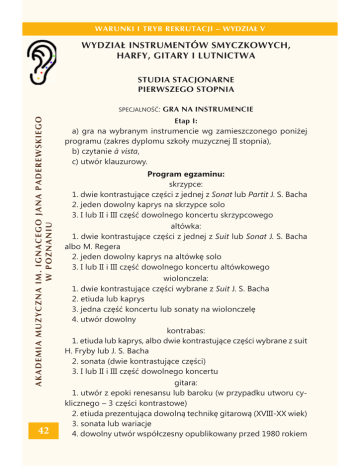 :$581.,,75<%5(.587$&-,q:<'=,$É9 :<'=,$É,167580(17£:60<&=.2:<&+ +$5)<*,7$5<,/871,&7:$ 678',$67$&-21$51( 3,(5:6=(*267231,$ AKADEMIA MUZYCZNA IM. IGNACEGO JANA PADEREWSKIEGO W POZNANIU 63(&-$/12Ğü*5$1$,167580(1&,( 42 EWDS, DJUDQDZ\EUDQ\PLQVWUXPHQFLHZJ]DPLHV]F]RQHJRSRQLīHM SURJUDPX]DNUHVG\SORPXV]NRâ\PX]\F]QHM,,VWRSQLD EF]\WDQLHjYLVWD FXWZyUNODX]XURZ\ 3URJUDPHJ]DPLQX VNU]\SFH GZLHNRQWUDVWXMĆFHF]ċğFL]MHGQHM]SonatOXEPartit -6%DFKD MHGHQGRZROQ\NDSU\VQDVNU]\SFHVROR ,OXE,,L,,,F]ċğýGRZROQHJRNRQFHUWXVNU]\SFRZHJR DOWyZND GZLHNRQWUDVWXMĆFHF]ċğFL]MHGQHM]SuitOXESonat-6%DFKD DOER05HJHUD MHGHQGRZROQ\NDSU\VQDDOWyZNċVROR ,OXE,,L,,,F]ċğýGRZROQHJRNRQFHUWXDOWyZNRZHJR ZLRORQF]HOD GZLHNRQWUDVWXMĆFHF]ċğFLZ\EUDQH]Suit-6%DFKD HWLXGDOXENDSU\V MHGQDF]ċğýNRQFHUWXOXEVRQDW\QDZLRORQF]HOċ XWZyUGRZROQ\ NRQWUDEDV HWLXGDOXENDSU\VDOERGZLHNRQWUDVWXMĆFHF]ċğFLZ\EUDQH]VXLW +)U\E\OXE-6%DFKD VRQDWDGZLHNRQWUDVWXMĆFHF]ċğFL ,OXE,,L,,,F]ċğýGRZROQHJRNRQFHUWX JLWDUD XWZyU]HSRNLUHQHVDQVXOXEEDURNXZSU]\SDGNXXWZRUXF\NOLF]QHJR²F]ċğFLNRQWUDVWRZH HWLXGDSUH]HQWXMĆFDGRZROQĆWHFKQLNċJLWDURZĆ;9,,,;;ZLHN VRQDWDOXEZDULDFMH GRZROQ\XWZyUZVSyâF]HVQ\RSXEOLNRZDQ\SU]HGURNLHP :$581.,,75<%5(.587$&-,q:<'=,$É9 KDUID HWLXGDNRQFHUWRZD;,;;;ZLHN WUDQVNU\SFMHXWZRUyZ-)+lQGOD-6%DFKDOXEAriaL5LJDXdon*.LUFKKRID VRQDWDOXEZDULDFMH;,;;;ZLHN XWZyUGRZROQ\;,;;;ZLHN Uwaga! .RPLVMHHJ]DPLQDF\MQHUH]HUZXMĆVRELHSUDZRGRZ\ERUXXWZRUyZOXELFKF]ċğFLGRSUH]HQWDFML Uwaga! 'R GRNXPHQWyZ QDOHī\ GRâĆF]\ý QXW\ GOD DNRPSDQLDWRUD HJ]DPLQ]NV]WDâFHQLDVâXFKXPRīQDGRQLHJRSU]\VWĆSLýSRX]\VNDQLXZ,HWDSLHSU]\QDMPQLHMSNWZVNDOLSXQNWRZHM 63(&-$/12Ğü/871,&7:2$57<67<&=1( EWDS, DSU]HGVWDZLHQLHGRRFHQ\SU]\QDMPQLHMMHGQHJRZ\NRQDQHJR SU]H]NDQG\GDWDLQVWUXPHQWXPX]\F]QHJR EZ\NRQDQLH]DGDQHJRIUDJPHQWXLQVWUXPHQWXVP\F]NRZHJR FJUDQDZ\EUDQ\PLQVWUXPHQFLH EWDS,, VSUDZG]LDQSUHG\VSR]\FMLVâXFKRZ\FK 678',$67$&-21$51( '58*,(*267231,$ 63(&-$/12Ğü*5$1$,167580(1&,( INFORMATOR ' / $ . $ 1 ' < ' $ 7 £ : 1 $ , 5 2 . 6 7 8 ' , £ : EWDS II DZ\NRQDQLHPLQXWRZHJRSURJUDPX EUR]PRZDNZDOLÀNDF\MQDQDWHPDW]ZLĆ]DQ\]NLHUXQNLHPVWXGLyZ 3URJUDPHJ]DPLQX VNU]\SFH MHGHQGRZROQ\NDSU\VQDVNU]\SFHVROR ,OXE,,L,,,F]ċğýGRZROQHJRNRQFHUWXVNU]\SFRZHJR XWZyUGRZROQ\QDVNU]\SFHVROROXE]WRZDU]\V]HQLHPIRUWHSLDQX DOWyZND MHGHQGRZROQ\NDSU\VQDDOWyZNċVROR ,OXE,,L,,,F]ċğýGRZROQHJRNRQFHUWXDOWyZNRZHJR XWZyUGRZROQ\QDDOWyZNċVROROXE]WRZDU]\V]HQLHPIRUWHSLDQX 43 :$581.,,75<%5(.587$&-,q:<'=,$É9 AKADEMIA MUZYCZNA IM. IGNACEGO JANA PADEREWSKIEGO W POZNANIU ZLRORQF]HOD 44 HWLXGDOXENDSU\V GZLHNRQWUDVWXMĆFHF]ċğFLZ\EUDQH]Suit-6%DFKD SLHUZV]DF]ċğýNRQFHUWXQDZLRORQF]HOċ NRQWUDEDV HWLXGDOXENDSU\VDOERGZLHNRQWUDVWXMĆFHF]ċğFLZ\EUDQH]VXLW +)U\E\OXE-6%DFKD VRQDWDGZLHF]ċğFLNRQWUDVWXMĆFH ,OXE,,L,,,F]ċğýGRZROQHJRNRQFHUWX JLWDUD GRZROQ\ SURJUDP ]UyīQLFRZDQ\ VW\OLVW\F]QLH ]DZLHUDMĆF\ XWZRU\ FRQDMPQLHM]GZyFKHSRNZW\PMHGQDZLċNV]DIRUPD KDUID GRZROQ\ SURJUDP ]UyīQLFRZDQ\ VW\OLVW\F]QLH ]DZLHUDMĆF\ XWZRU\ FRQDMPQLHM]GZyFKHSRNZW\PMHGQDZLċNV]DIRUPD Uwaga! .RPLVMH HJ]DPLQDF\MQH PRJĆ īĆGDý SU]HGVWDZLHQLD SURJUDPX]UHDOL]RZDQHJRQDVWXGLDFK,VWRSQLDDWDNīHUH]HUZXMĆVRELHSUDZRGRZ\ERUXXWZRUyZOXELFK F]ċğFLGRSUH]HQWDFML Uwaga! .DQG\GDFLNWyU]\QLHPDMĆXNRĕF]RQ\FKVWXGLyZPX]\F]Q\FK]GDMĆGRGDWNRZRHJ]DPLQ\]NV]WDâFHQLDVâXFKXRUD]KLVWRULLPX]\NLHJ]DPLQXVWQ\ 63(&-$/12Ğü/871,&7:2$57<67<&=1( DSU]HGVWDZLHQLHGRRFHQ\SU]\QDMPQLHMMHGQHJRZ\NRQDQHJR SU]H]NDQG\GDWDLQVWUXPHQWXPX]\F]QHJR EUR]PRZDNZDOLÀNDF\MQDQDWHPDW]ZLĆ]DQ\]NLHUXQNLHPVWXGLyZ