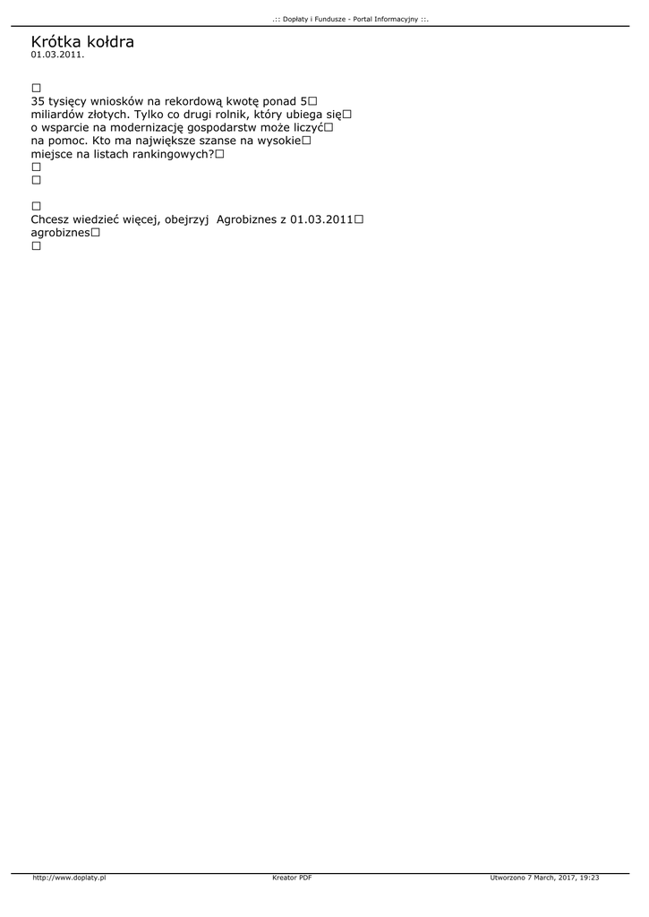 .:: Dopłaty i Fundusze - Portal Informacyjny ::. Krótka kołdra 01.03.2011. 35 tysięcy wniosków na rekordową kwotę ponad 5 miliardów złotych. Tylko co drugi rolnik, który ubiega się o wsparcie na modernizację gospodarstw może liczyć na pomoc. Kto ma największe szanse na wysokie miejsce na listach rankingowych? Chcesz wiedzieć więcej, obejrzyj Agrobiznes z 01.03.2011 agrobiznes http://www.doplaty.pl Kreator PDF Utworzono 7 March, 2017, 19:23