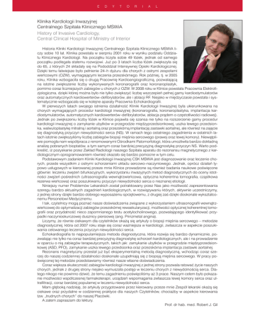 E D Y T O R I A L Klinika Kardiologii Inwazyjnej Centralnego Szpitala Klinicznego MSWiA History of Invasive Cardiology, Central Clinical Hospital of Ministry of Interior Historia Kliniki Kardiologii Inwazyjnej Centralnego Szpitala Klinicznego MSWiA liczy sobie 10 lat. Klinika powstała w sierpniu 2001 roku w wyniku podziału Oddziału Klinicznego Kardiologii. Na początku liczyła sobie 49 łóżek, jednak od samego początku podlegała stałemu rozwojowi. Już po 3 latach liczba łóżek zwiększyła się do 65, z których 24 składały się na Pododdział Intensywnej Opieki Kardiologicznej. Dzięki temu łatwiejsze było pełnienie 24–h dyżuru dla chorych z ostrymi zespołami wieńcowymi (OZW), wymagającymi leczenia przezskórnego. Rok później, tj. w 2005 roku, Klinika wzbogaciła się o drugą Pracownię Kardioangiograficzną, pozwalającą na istotne zwiększenie liczby wykonywanych koronarografii oraz koronaroplastyk, pomimo coraz liczniejszych zabiegów u chorych z OZW. W 2008 roku w Klinice powstała Pracownia Elektrofizjologiczna, dzięki której można było nie tylko zwiększyć liczbę wszczepień pełnej gamy kardiostymulatorów oraz automatycznych kardiowerterów–defibrylatorów, ale i ablacji RF. Niejako w międzyczasie powstała i systematycznie wzbogacała się w kolejne aparaty Pracownia Echokardiografii. W pierwszych latach swojego istnienia działalność Kliniki Kardiologii Inwazyjnej była ukierunkowana na chorych wymagających procedur kardiologii inwazyjnej (koronarografia, koronaroplastyka, implantacja kardiostymulatorów, automatycznych kardiowerterów–defibrylatorów, ablacja prądem o częstotliwości radiowej). Jednak po zwiększeniu liczby łóżek w Klinice pojawiła się szansa nie tylko na rozszerzenie gamy procedur kardiologii inwazyjnej o zamykanie ubytków w przegrodzie międzyprzedsionkowej, uszka lewego przedsionka, walwuloplastykę mitralną i aortalną oraz przezskórną implantację zastawki aortalnej, ale również na zajęcie się diagnostyką przyczyn niewydolności serca (NS). W ramach tego ostatniego zagadnienia w ostatnich latach istotnie zwiększyliśmy liczbę zabiegów biopsji mięśnia sercowego (prawej oraz lewej komory). Niewątpliwie pomogła nam współpraca z renomowanymi Ośrodkami Patomorfologii, która umożliwiła bardzo dokładną analizę pobranych bioptatów, a tym samym coraz bardziej precyzyjną diagnostykę przyczyn NS. Warto podkreślić, iż pozyskanie przez Zakład Radiologii naszego Szpitala aparatu do rezonansu magnetycznego z kardiologicznym oprogramowaniem również okazało się bardzo pomocne w tym celu. Podstawowym zadaniem Kliniki Kardiologii Inwazyjnej CSK MSWiA jest diagnozowanie oraz leczenie chorych, przede wszystkim z ostrymi schorzeniami układu sercowo–naczyniowego. Jednak, oprócz działań typowo usługowych w kierowanej przeze mnie Klinice prowadzone są również badania naukowe poświęcone głównie: leczeniu zwężeń bifurkacyjnych, wykorzystaniu inwazyjnych metod diagnostycznych do oceny istotności zwężeń pośrednich (ultrasonografia wewnątrzwieńcowa, optyczna koherentna tomografia, cząstkowa rezerwa wieńcowa) oraz poszukiwaniu przyczyn niewydolności serca o nieznanej etiologii. Niniejszy numer Problemów Lekarskich został potraktowany przez Nas jako możliwość zaprezentowania szeregu bardzo aktualnych zagadnień kardiologicznych, w rozwiązywaniu których, aktywnie uczestniczymy, z jednej strony dzięki bardzo dobrego wyposażeniu sprzętowemu, z drugiej zaś dzięki doskonale wykształconemu Personelowi Medycznemu. I tak, czytelnicy mogą poznać nasze doświadczenia związane z wykorzystaniem ultrasonografii wewnątrzwieńcowej do optymalizacji zabiegów przezskórnej rewaskularyzacji, możliwości optycznej koherentnej tomografii oraz przydatność nieco zapomnianego testu acetylocholinowego, pozwalającego identyfikować przypadki naczynioskurczowej dusznicy piersiowej (ang. Prinzmetal angina). Liczymy, że równie ciekawym dla czytelników okażą się artykuły o biopsji mięśnia sercowego – metodzie diagnostycznej, która od 2007 roku staje się coraz ważniejsza w kardiologii, zwłaszcza w aspekcie poszukiwania celowanego leczenia przyczyn niewydolności serca. Echokardiografia to najpopularniejsza metoda diagnostyczna, która rozwija się bardzo dynamicznie, pozwalając nie tylko na coraz bardziej precyzyjną diagnostykę schorzeń kardiologicznych, ale i na prowadzenie w oparciu o nią zabiegów terapeutycznych, takich jak: zamykanie ubytków w przegrodzie międzyprzedsionkowej (ASD, PFO), zamykanie uszka lewego przedsionka oraz przezskórna implantacja zastawki aortalnej. Rezonans magnetyczny przestał już być eksperymentalną metodą diagnostyczną, wchodząc coraz szerzej do naszej codziennej działalności doskonale uzupełniają się z biopsją mięśnia sercowego. W pracy poświęconej tej metodzie przedstawiamy również nasze własne doświadczenia. Coraz większa skuteczność zabiegów kardiologii inwazyjnej z jednej strony pozwala ratować życie naszych chorych, jednak z drugiej strony niejako wymuszała postęp w leczeniu chorych z niewydolnością serca. Dlatego nikogo nie powinno dziwić, że temu zagadnieniu poświęciliśmy aż 3 prace. Naszym celem było pokazanie możliwości współczesnej farmakoterapii, urządzeń wspomagania zwłaszcza lewej komory serca oraz ultrafiltracji, coraz bardziej popularnej w leczeniu niewydolności serca. Mam głęboką nadzieję, że artykuły przygotowane przez kierowany przeze mnie Zespół lekarski okażą się ciekawe oraz przydatne w codziennej praktyce dla naszych Czytelników, chociażby w aspekcie kierowania tzw. „trudnych chorych” do naszej Placówki. A zatem zapraszam do lektury. Prof. dr hab. med. Robert J. Gil P R A C E O R Y G I N A L N E Ocena porównawcza wyników implantacji w tętnicach nasierdziowych stentu uwalniającego lek oraz klasycznego stentu metalowego optymalizowanego ultrason