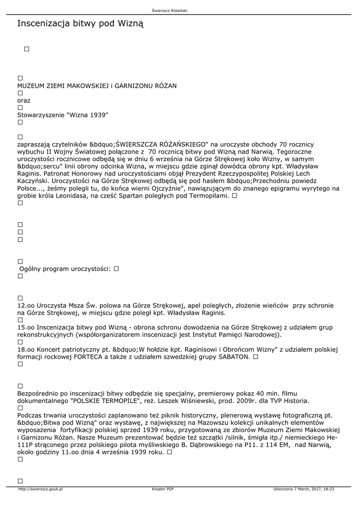Świerszcz Różański Inscenizacja bitwy pod Wizną MUZEUM ZIEMI MAKOWSKIEJ i GARNIZONU RÓŻAN oraz Stowarzyszenie "Wizna 1939" zapraszają czytelników „ŚWIERSZCZA RÓŻAŃSKIEGO" na uroczyste obchody 70 rocznicy wybuchu II Wojny Światowej połączone z 70 rocznicą bitwy pod Wizną nad Narwią. Tegoroczne uroczystości rocznicowe odbędą się w dniu 6 września na Górze Strękowej koło Wizny, w samym „sercu" linii obrony odcinka Wizna, w miejscu gdzie zginął dowódca obrony kpt. Władysław Raginis. Patronat Honorowy nad uroczystościami objął Prezydent Rzeczypospolitej Polskiej Lech Kaczyński. Uroczystości na Górze Strękowej odbędą się pod hasłem „Przechodniu powiedz Polsce..., żeśmy polegli tu, do końca wierni Ojczyźnie", nawiązującym do znanego epigramu wyrytego na grobie króla Leonidasa, na cześć Spartan poległych pod Termopilami. Ogólny program uroczystości: 12.oo Uroczysta Msza Św. polowa na Górze Strękowej, apel poległych, złożenie wieńców przy schronie na Górze Strękowej, w miejscu gdzie poległ kpt. Władysław Raginis. 15.oo Inscenizacja bitwy pod Wizną - obrona schronu dowodzenia na Górze Strękowej z udziałem grup rekonstrukcyjnych (współorganizatorem inscenizacji jest Instytut Pamięci Narodowej). 18.oo Koncert patriotyczny pt. „W hołdzie kpt. Raginisowi i Obrońcom Wizny" z udziałem polskiej formacji rockowej FORTECA a także z udziałem szwedzkiej grupy SABATON. Bezpośrednio po inscenizacji bitwy odbędzie się specjalny, premierowy pokaz 40 min. filmu dokumentalnego "POLSKIE TERMOPILE", reż. Leszek Wiśniewski, prod. 2009r. dla TVP Historia. Podczas trwania uroczystości zaplanowano też piknik historyczny, plenerową wystawę fotograficzną pt. „Bitwa pod Wizną" oraz wystawę, z największej na Mazowszu kolekcji unikalnych elementów wyposażenia fortyfikacji polskiej sprzed 1939 roku, przygotowaną ze zbiorów Muzeum Ziemi Makowskiej i Garnizonu Różan. Nasze Muzeum prezentować będzie też szczątki /silnik, śmigła itp./ niemieckiego He111P strąconego przez polskiego pilota myśliwskiego B. Dąbrowskiego na P11. z 114 EM, nad Narwią, około godziny 11.oo dnia 4 września 1939 roku. http://swierszcz.gouk.pl Kreator PDF Utworzono 7 March, 2017, 18:23 Świerszcz Różański Jeżeli podobała Ci się inscenizacja bitwy o Fort I w Różanie 13 czerwca 2009 roku, na uroczystości w Wiźnie tez nie powinno Ciebie zabraknąć !!! Koncert jest bezpłatny, wstęp na wszystkie wymienione w programie imprezy wolny. Dla osób planujących przyjazd samochodem, a korzystających z nawigacji GPS współrzędne geograficzne miejsca planowanej uroczystości: B=53^12'42"N, L=22^29'46"E . Dla zainteresowanych noclegiem: w związku z planowanymi uroczystościami i koncertem na Górze Strękowej, Gmina Zawady udostępnia dla gości bezpłatnie pole namiotowe. Telefon kontaktowy w tej sprawie 606-530-605. Dostępne są również noclegi w kwaterach agroturystycznych. Informacje o nich można znaleźć na: www.carskitrakt.pl, www.agroturystyka.pl, www.biebrzan.pl, www.wiznaostrowska.bramanabagna.pl, www.nadstrumieniem.pl, www.kasztelanwiski.pl (Zajazd). http://swierszcz.gouk.pl Kreator PDF Utworzono 7 March, 2017, 18:23