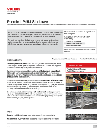 www.dexionpolska.pl +48 22 295 08 00 Panele i Półki Siatkowe Visit www.dexionpolska.pl/Produkty-Kategoria/Magazynowanie-i-obszar-roboczy/Panele-i-Polki-Siatkowe/ for the latest information. Jeżeli chcecie Państwo lepiej wykorzystać przestrzeń w magazynie Panele i Półki Siatkowe is a product in the category lub zwiekszyć bezpieczeństwo i ochronę pracowników to istnieje szereg systemów i produktów pomocnych w tym zadaniu. Magazynowanie i Obszar Podesty zapewniają dodatkową przestrzeń, natomiast systemy siatek mogą chronić pracowników. Ład w magazynie i szybką lokalizację towarów zapewnia właściwy system oznakowania. Roboczy Podesty Wolnostojące Panele i Półki Siatkowe Siatki Zabezpieczające Please visit www.dexionpolska.pl to see our other products. Magazynowanie i Obszar Roboczy › Panele i Półki Siatkowe > Półki Siatkowe Stalowe półki siatkowe stanowić mogą alternatywne wypełnienie drewnianych półek i pełnych paneli stalowych. Umieszcza się je na poziomach belkowych regałów paletowych. Swoje zastosowanie znajdują podczas składowania niewielkich kartonów na niskich poziomach, przeznaczonych do ręcznego pobierania towaru. Mogą nimi również zostać zabezpieczone drogi przejazdowe pod regałami. Dzięki swoim uniwersalnym właściwościom stalowe półki siatkowe znakomicie nadają się do wykorzystania zarówno w standardowych magazynach, jak również w chłodniach i mroźniach, gdzie wymagany jest swobodny przepływ powietrza oraz wyjątkowa dbałość o podtrzymanie odpowiedniej temperatury. Dodatkową zaletą stalowych półek siatkowych jest zapewnienie lepszego bezpieczeństwa niż w przypadku drewnianych wypełnień. Jest to możliwe dzięki umożliwieniu swobodnego przepływ wody ze spryskiwaczy w przypadku pożaru. Opis Panele i półki siatkowe są dostępne w różnych wersjach. Na-belkowe (typ Waterfall) układane bezpośrednio na belkach i 1/3 Polecane Produkty Regały Paletowe Rzędowe Siatki Zabezpieczające www.dexionpolska.pl +48 22 295 08 00 zabezpieczone przed przesuwaniem za pomocą przedłużonej krawędzi przedniej i tylnej. Wpuszczane z belkami standardowymi, gdzie panele umieszczone są pomiędzy belkami i mocowane na kątownikach opierających się o belki. Wpuszczane z belkami kształtowymi, gdzie panele układane są na specjalnym występie belkowym, w ten sposób, że górna krawędź belek i paneli stanowią jedną powierzchnię. Specyfikacja 2/3 www.dexionpolska.pl +48 22 295 08 00 Specyfikacja Magazynowanie i Obszar Roboczy › Panele i Półki Siatkowe Panele i półki siatkowe dostępne są w wersji galwanizowanej jak i malowanej. Wypełnienia panelowe mogą być stosowane na poziomach belkowych zapewniając dokładne ich zakrycie a obciążenie na pojedynczy panel sięga 1500 kg. Standardowe rozwiązania spawanych paneli siatkowych posiadają belki poprzeczne, umożliwiające równomierne rozłożenie obciążenia na poziomie belkowym. Przy dużych obciążeniach stosuje się kraty prasowane z kątownikami pozwalającymi na ich zaczepienie na belkach. 3/3 >