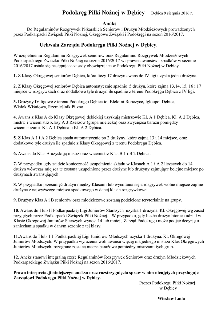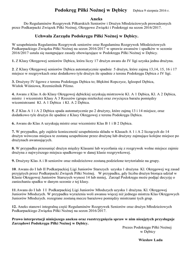 Podokręg Piłki Nożnej w Dębicy Dębica 9 sierpnia 2016 r. Aneks Do Regulaminów Rozgrywek Piłkarskich Seniorów i Drużyn Młodzieżowych prowadzonych przez Podkarpacki Związek Piłki Nożnej, Okręgowe Związki i Podokręgi na sezon 2016/2017. Uchwała Zarządu Podokręgu Piłki Nożnej w Dębicy. W uzupełnieniu Regulaminu Rozgrywek seniorów oraz Regulaminu Rozgrywek Młodzieżowych Podkarpackiego Związku Piłki Nożnej na sezon 2016/2017 w sprawie awansów i spadków w sezonie 2016/2017 ustala się następujące zasady obowiązujące w Podokręgu Piłki Nożnej w Dębicy. 1. Z Klasy Okręgowej seniorów Dębica, która liczy 17 drużyn awans do IV ligi uzyska jedna drużyna. 2. Z Klasy Okręgowej seniorów Dębica automatycznie spadnie 5 drużyn, które zajmą 13,14, 15, 16 i 17 miejsce w rozgrywkach oraz dodatkowo tyle drużyn ile spadnie z terenu Podokręgu Dębica z IV ligi. 3. Drużyny IV ligowe z terenu Podokręgu Dębica to; Błękitni Ropczyce, Igloopol Dębica, Wisłok Wiśniowa, Rzemieślnik Pilzno. 4. Awans z Klas A do Klasy Okręgowej dębickiej uzyskują mistrzowie Kl. A 1 Dębica, Kl. A 2 Dębica, mistrz i wicemistrz Klasy A 3 Rzeszów (grupa mielecka) oraz zwycięzca barażu pomiędzy wicemistrzami Kl. A 1 Dębica i Kl. A 2 Dębica. 5. Z Klas A 1 i A 2 Dębica spada automatycznie po 2 drużyny, które zajmą 13 i 14 miejsce, oraz dodatkowo tyle drużyn ile spadnie z Klasy Okręgowej z terenu Podokręgu Dębica. 6. Awans do Klas A uzyskują mistrz oraz wicemistrz Klas B 1 i B 2 Dębica. 7. W przypadku, gdy zajdzie konieczność uzupełnienia składu w Klasach A 1 i A 2 liczących do 14 drużyn wówczas miejsca te zostaną uzupełnione przez drużynę lub drużyny zajmujące kolejne miejsce po drużynach awansujących. 8. W przypadku przesunięć drużyn między Klasami lub wycofania się z rozgrywek wolne miejsce zajmie drużyna z najwyższego miejsca spadkowego w danej klasie rozgrywkowej. 9. Drużyny Klas A i B seniorów oraz młodzieżowe zostaną podzielone terytorialnie na grupy. 10. Awans do I lub II Podkarpackiej Ligi Juniorów Starszych uzyska 1 drużyna Kl. Okręgowej wg zasad przyjętych przez Podkarpacki Związek Piłki Nożnej. W przypadku, gdy liczba drużyn biorąca udział w Klasie Okręgowej Juniorów Starszych wynosi 14 lub mniej, Zarząd Podokręgu może podjąć decyzję o zaniechaniu spadku w danym sezonie z tej klasy. 11.Awans do I lub I I Podkarpackiej Ligi Juniorów Młodszych uzyska 1 drużyna. Kl. Okręgowej Juniorów Młodszych. W przypadku wyrażenia woli awansu więcej niż jednego mistrza Klas Okręgowych Juniorów Młodszych. rozegrane zostaną mecze barażowe pomiędzy mistrzami tych grup. 12. Aneks stanowi integralną część Regulaminów Rozgrywek Seniorów oraz drużyn Młodzieżowych Podkarpackiego Związku Piłki Nożnej na sezon 2016/2017. Prawo interpretacji niniejszego aneksu oraz rozstrzygnięcia spraw w nim nieujętych przysługuje Zarządowi Podokręgu Piłki Nożnej w Dębicy. Prezes Podokręgu Piłki Nożnej w Dębicy Wiesław Lada