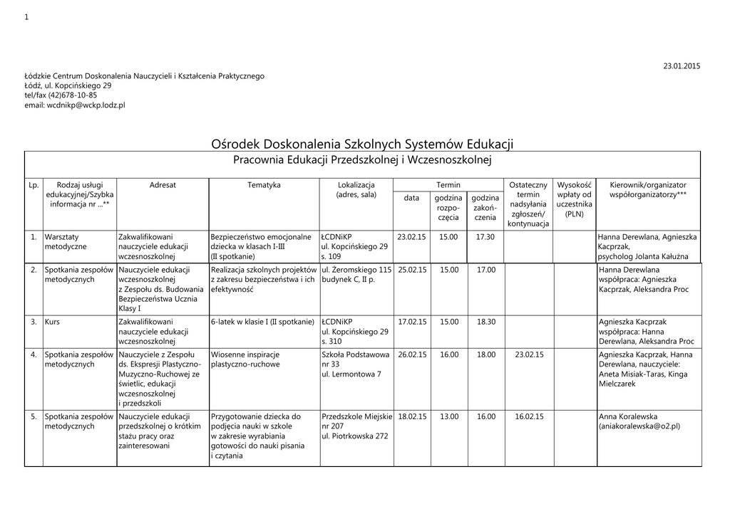 1 23.01.2015 Łódzkie Centrum Doskonalenia Nauczycieli i Kształcenia Praktycznego Łódź, ul. Kopcińskiego 29 tel/fax (42)678-10-85 email: [email protected] Ośrodek Doskonalenia Szkolnych Systemów Edukacji Pracownia Edukacji Przedszkolnej i Wczesnoszkolnej Lp. Rodzaj usługi edukacyjnej/Szybka informacja nr ...** Adresat Zakwalifikowani nauczyciele edukacji wczesnoszkolnej Tematyka ŁCDNiKP ul. Kopcińskiego 29 s. 109 Termin data godzina rozpoczęcia godzina zakończenia Ostateczny Wysokość termin wpłaty od nadsyłania uczestnika zgłoszeń/ (PLN) kontynuacja Kierownik/organizator współorganizatorzy*** 1. Warsztaty metodyczne 23.02.15 15.00 17.30 Hanna Derewlana, Agnieszka Kacprzak, psycholog Jolanta Kałużna 2. Spotkania zespołów Nauczyciele edukacji Realizacja szkolnych projektów ul. Żeromskiego 115 25.02.15 metodycznych wczesnoszkolnej z zakresu bezpieczeństwa i ich budynek C, II p. z Zespołu ds. Budowania efektywność Bezpieczeństwa Ucznia Klasy I 15.00 17.00 Hanna Derewlana współpraca: Agnieszka Kacprzak, Aleksandra Proc 3. Kurs Agnieszka Kacprzak współpraca: Hanna Derewlana, Aleksandra Proc 4. 5. Zakwalifikowani nauczyciele edukacji wczesnoszkolnej Bezpieczeństwo emocjonalne dziecka w klasach I-III (II spotkanie) Lokalizacja (adres, sala) 6-latek w klasie I (II spotkanie) ŁCDNiKP ul. Kopcińskiego 29 s. 310 17.02.15 15.00 18.30 Spotkania zespołów Nauczyciele z Zespołu metodycznych ds. Ekspresji PlastycznoMuzyczno-Ruchowej ze świetlic, edukacji wczesnoszkolnej i przedszkoli Wiosenne inspiracje plastyczno-ruchowe Szkoła Podstawowa nr 33 ul. Lermontowa 7 26.02.15 16.00 18.00 23.02.15 Agnieszka Kacprzak, Hanna Derewlana, nauczyciele: Aneta Misiak-Taras, Kinga Mielczarek Spotkania zespołów Nauczyciele edukacji metodycznych przedszkolnej o krótkim stażu pracy oraz zainteresowani Przygotowanie dziecka do podjęcia nauki w szkole w zakresie wyrabiania gotowości do nauki pisania i czytania Przedszkole Miejskie 18.02.15 nr 207 ul. Piotrkowska 272 13.00 16.00 16.02.15 Anna Koralewska ([email protected]) 2 Lp. Rodzaj usługi edukacyjnej/Szybka informacja nr ...** Adresat Tematyka Lokalizacja (adres, sala) Termin Kierownik/organizator współorganizatorzy*** godzina rozpoczęcia godzina zakończenia Przedszkole Miejskie 19.02.15 nr 202 ul. Sędziowska 8/10 13.30 16.30 18.02.15 Alicja Krzyżańska współpraca: Violetta Zeller Przedszkole Miejskie 25.02.15 nr 202 ul. Sędziowska 8/10 13.00 16.45 24.02.15 Alicja Krzyżańska współpraca: Anna Koralewska Przedszkole Miejskie 26.02.15 nr 109 z Oddziałami Integracyjnymi ul. Jana 6 15.30 18.30 25.02.15 Alicja Krzyżańska współpraca: Aleksandra Proc Modyfikacja dokumentacji Przedszkole Miejskie 24.02.15 przedszkolnej w świetle nowych nr 122 zmian w podstawie ul. Będzińska 3 programowej 93-540 Łódź 16.00 18.30 Joanna Świątek 6. Spotkania zespołów Nauczyciele zespołu metodycznych metodycznego z krótkim stażem pracy oraz inni zainteresowani Zajęcia ruchowe dla dzieci w wieku przedszkolnym z wykorzystaniem metody ruchu rozwijającego V. Sherborne 7. Warsztaty metodyczne 8. Spotkania zespołów Nauczyciele edukacji Zastosowanie Metody Dobrego metodycznych przedszkolnej, oddziałów Startu w przygotowaniu do przedszkolnych w szkole nauki czytania i pisania - cz. I podstawowej oraz nauczyciele edukacji wczesnoszkolnej 9. Konsultacje grupowe Nauczyciele Przedszkola Miejskiego nr 122 Nauczyciele edukacji Konstruowanie scenariusza przedszkolnej, oddziałów zajęć ukierunkowanego na przedszkolnych w szkole działania zespołowe dzieci podstawowej i świetlic szkolnych data Ostateczny Wysokość termin wpłaty od nadsyłania uczestnika zgłoszeń/ (PLN) kontynuacja 10. Seminarium Zakwalifikowani nauczyciele wychowania przedszkolnego Technologia informacyjna, a prawa autorskie ŁCDNiKP ul. Kopcińskiego 29 s. 108 23.02.15 14.00 17.00 Joanna Świątek współpraca: Sławomir Szaruga 11. Modelowe zajęcia edukacyjne Zainteresowani nauczyciele wychowania przedszkolnego "Egzotyczne owady - tajemnice skorpiona". Bank pomysłów na wykorzystanie narzędzi interaktywnych w pracy z małym dzieckiem Przedszkole Miejskie 18.02.15 nr 200 ul. Zamknięta 1 93-323 Łódź 9.30 11.00 Joanna Świątek współpraca: Beata Wosińska, Dorota Kulik 12. Warsztaty metodyczne Zespół Metodyczny Jak rozwijać myślenie logiczne Przedszkole Miejskie 25.02.15 ds. Budowania Warsztatu u małego dziecka? - wachlarz nr 154 Pracy Nauczyciela pomysłów ul. Przełajowa 21 o Krótkim Stażu 16.00 18.15 Beata Wosińska współpraca: Monika Dudek, Marzena Sobczak 3 Lp. Rodzaj usługi edukacyjnej/Szybka informacja nr ...** Adresat Tematyka Lokalizacja (adres, sala) Termin data godzina rozpoczęcia godzina zakończenia Ostateczny Wysokość termin wpłaty od nadsyłania uczestnika zgłoszeń/ (PLN) kontynuacja 13. Modelowe zajęcia edukacyjne Zainteresowani nauczyciele wychowania przedszkolnego W zimowej krainie Przedszkole Miejskie 25.02.15 różnorodności - propozycje nr 112 zabaw i ćwiczeń ul. Wileńska 20a ukierunkowanych na naturalną naukę języka angielskiego przez małe dziecko 9.30 11.30 14. Warsztaty metodyczne Nauczyciele edukacji wczesnoszkolnej Rękodzieło artystyczne Szkoła Podstawowa w edukacji dziecka (frywolitka, nr 30 haft na tiulu, haft krzyżykowy ul. Rysownicza 1/3 i inne techniki) 17.02.15 15.00 17.30 16.02.15 15. Konferencja Nauczyciele edukacji przedszkolnej, klas I - VI szkoły podstawowej Jak ubiegać się o certyfikat I i II Szkoła Podstawowa stopnia "szkoły dla nr 30 ekorozwoju" (certyfikat ul. Rysownicza 1/3 krajowy, certyfikat międzynarodowy zielonej flagi) 23.02.15 14.30 16.30 20.02.15 16. Kurs Zakwalifikowani nauczyciele edukacji wczesnoszkolnej 6-latek w klasie I (III spotkanie) Szkoła Podstawowa nr 30 ul. Rysownicza 1/3 24.02.15 15.00 18.30 Kierownik/organizator współorganizatorzy*** Beata Wosińska współpraca: Joanna Świątek, Justyna Olkiewicz 5 zł koszt Aleksandra Proc materiałów współpr